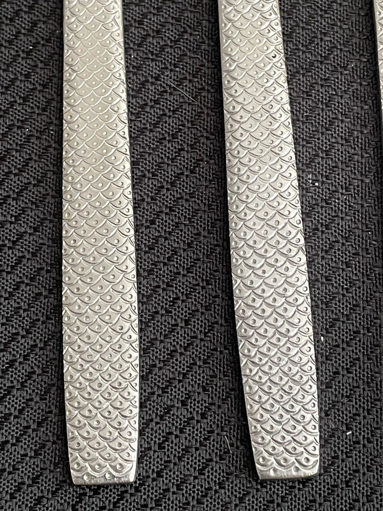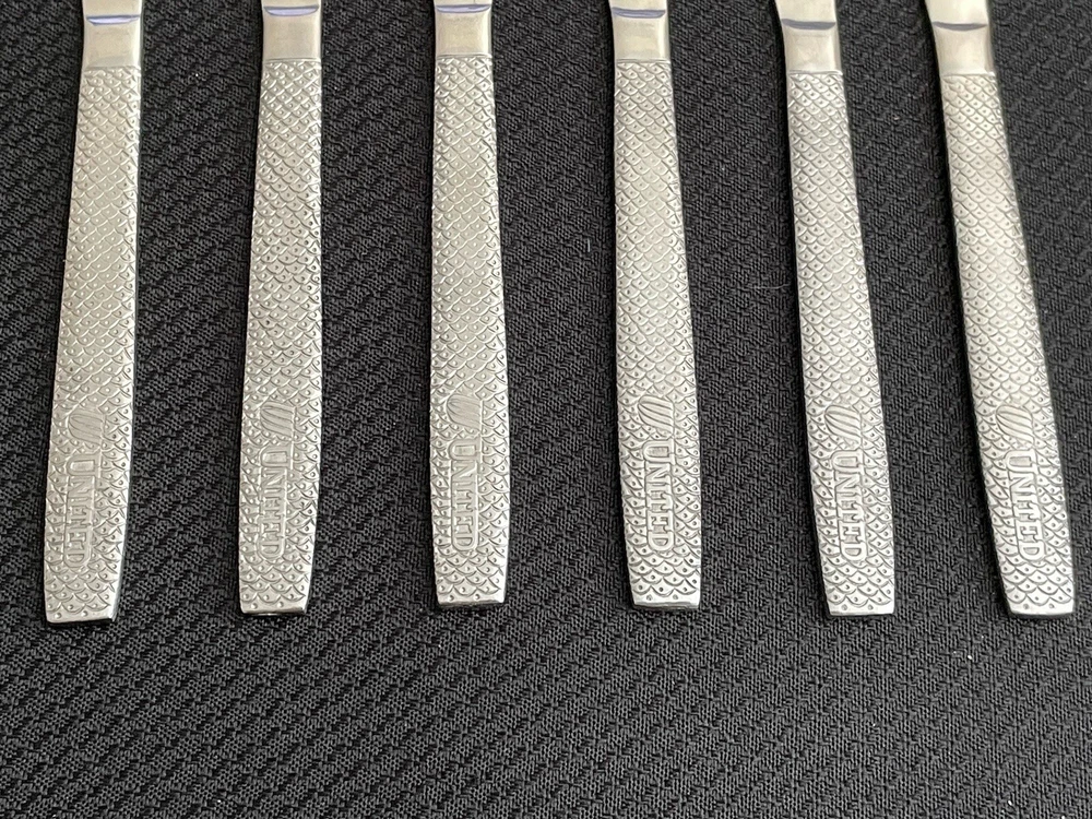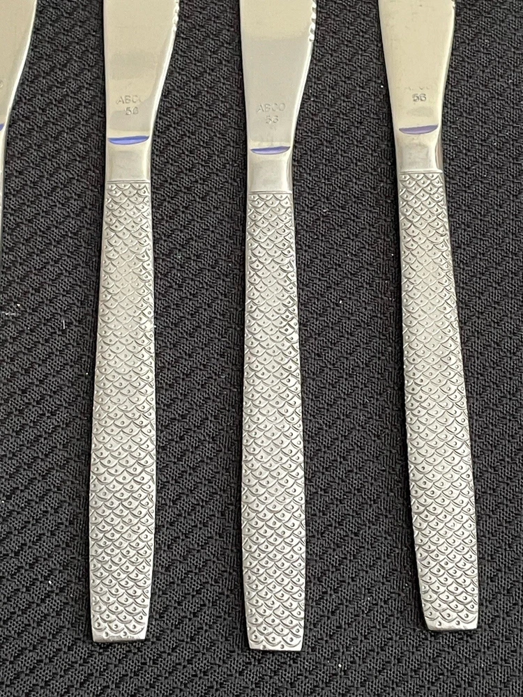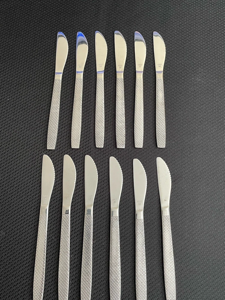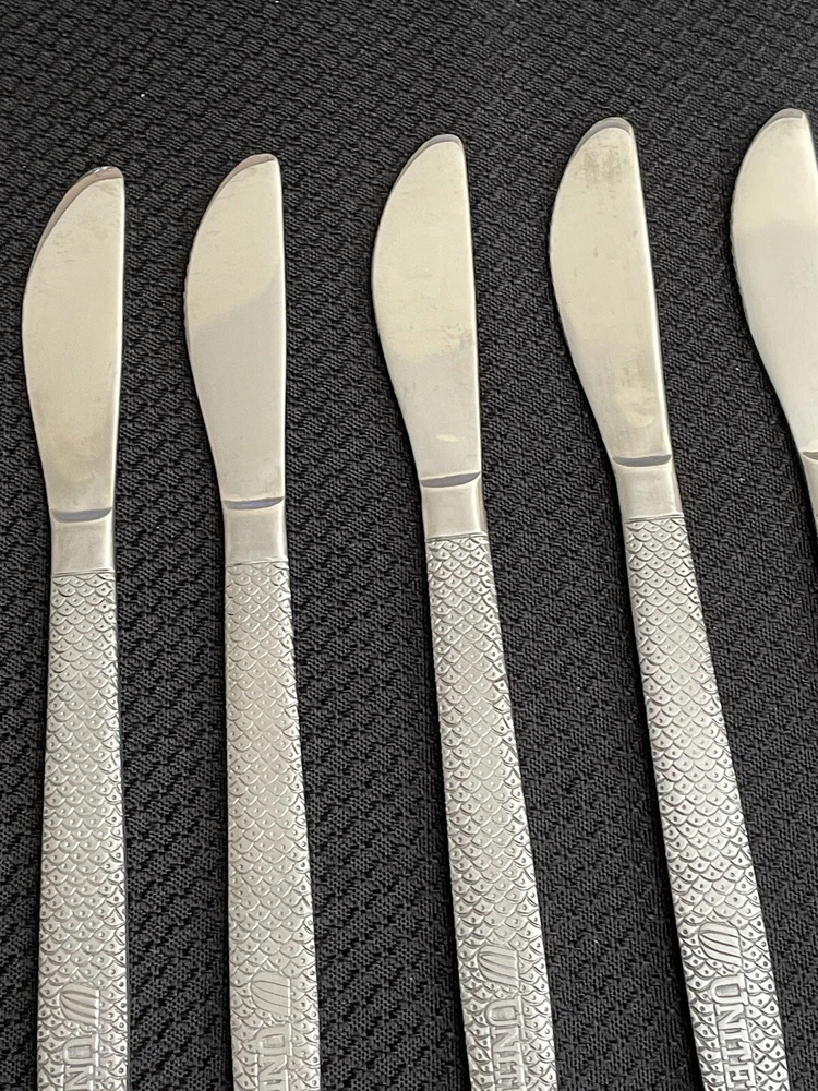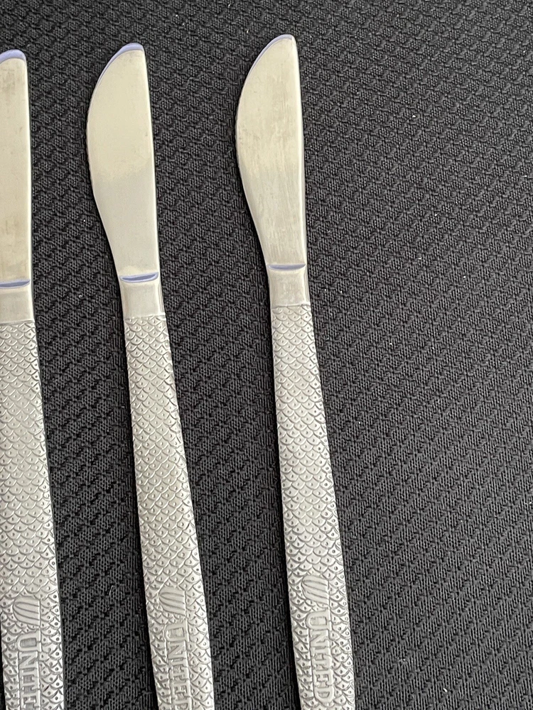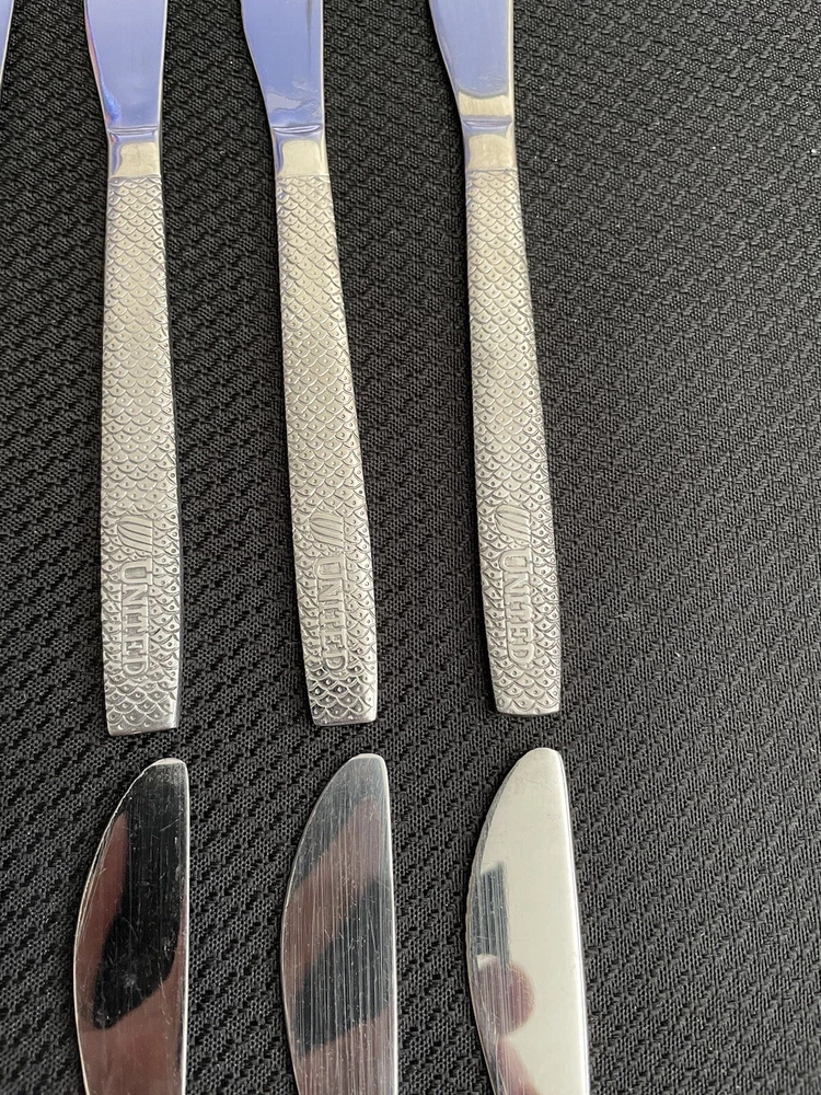 Vintage UNITED AIRLINES Fish Scale ABCO 56 Pattern Dinner Knives Lot Of 12. Great condition and nice collection for airline memorabilia