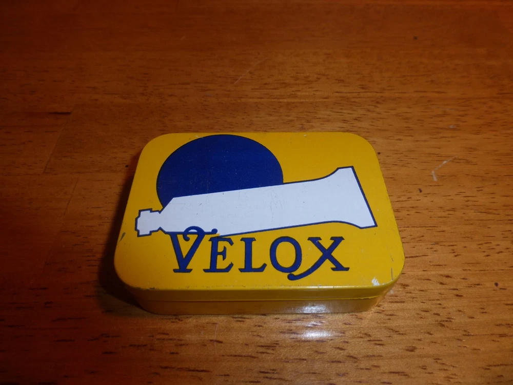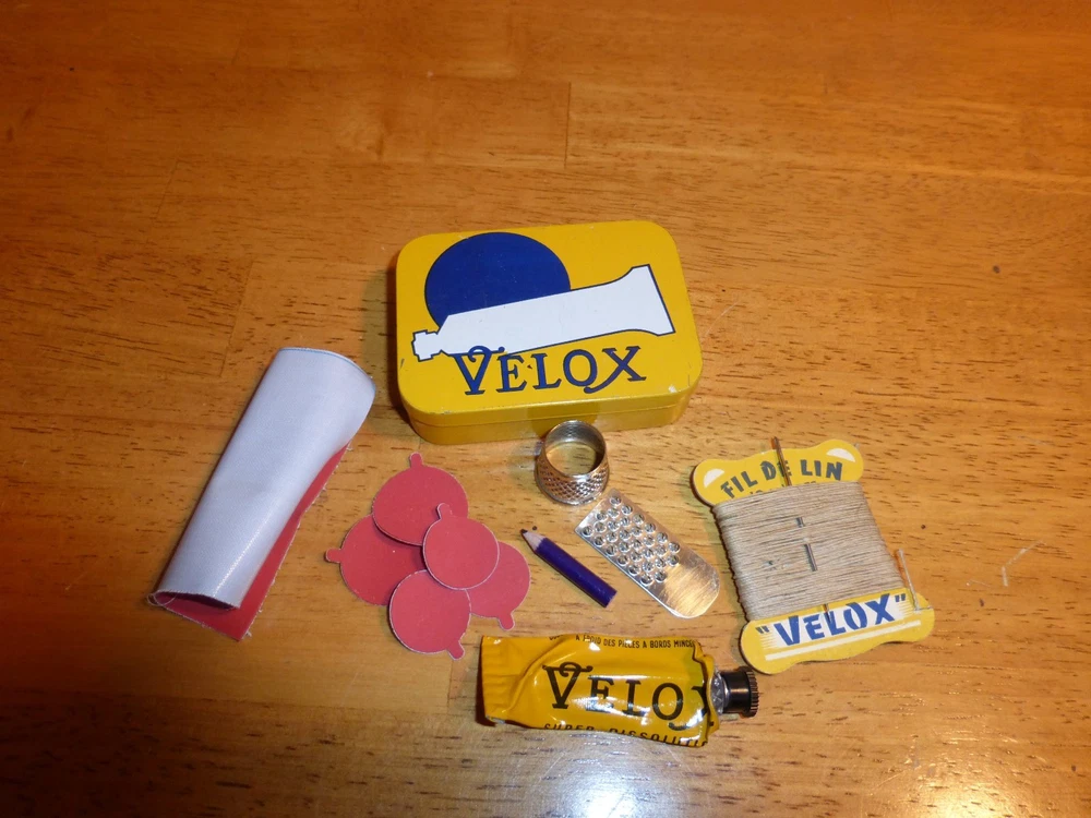 Vintage 1970's "Velox" Sew up Tire Repair Kit. NOS / NIP - in original Tin! Complete with all original contents: Patches, Glue (glue tube is dried up from age), Thread, Needle, Thimble, Pencil and scuffer. A great collectors item for the cycling enthusiast. Nice conversation Item!! *Old inventory from my over 60 years in business bike shop.