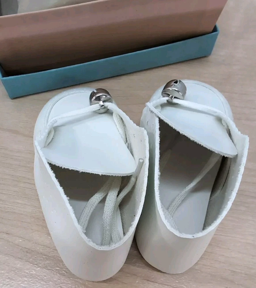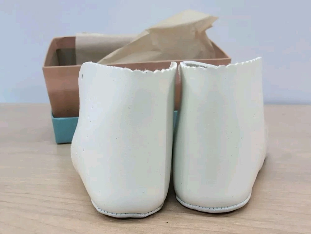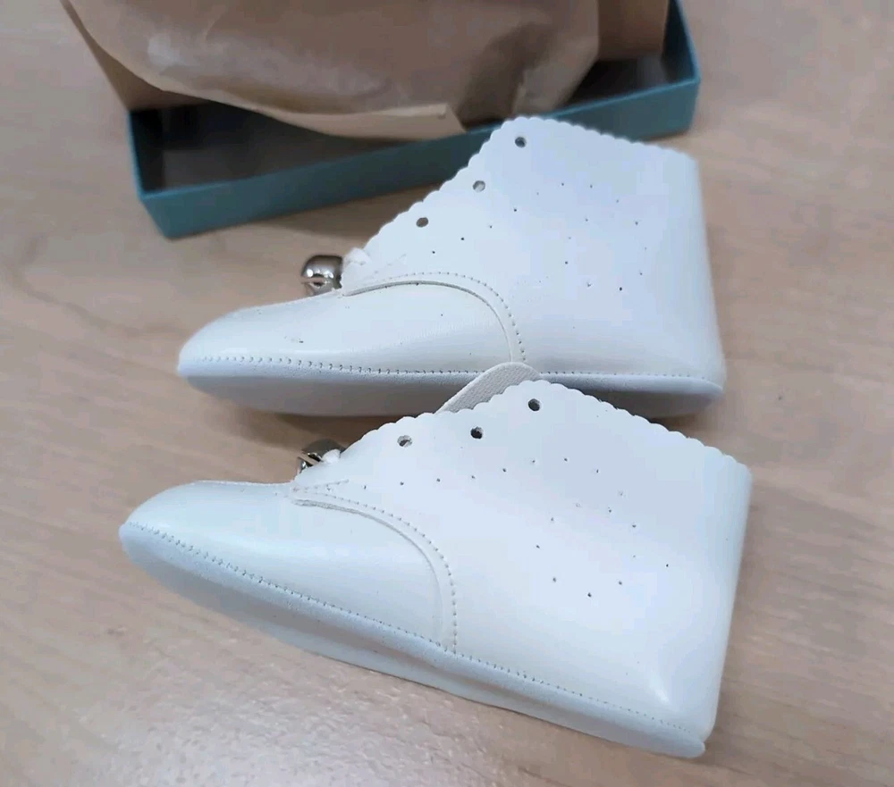 Vintage Walker Shoes NEW In Box Baby Booties Bell’s Soft White Leather NOS Sz 3 These shoes were purchased from a family owned store that has been around since the early 1940's. I purchased their old dead stock inventory. They have been stored in a climate controlled environment. Each shoe will come in the original box and tissue paper. The shoes are white with bells and have laces. Due to the vintage age of the shoes, some may or may not have slight yellowing. Remember these are original 1950's baby shoes not a reproduction.