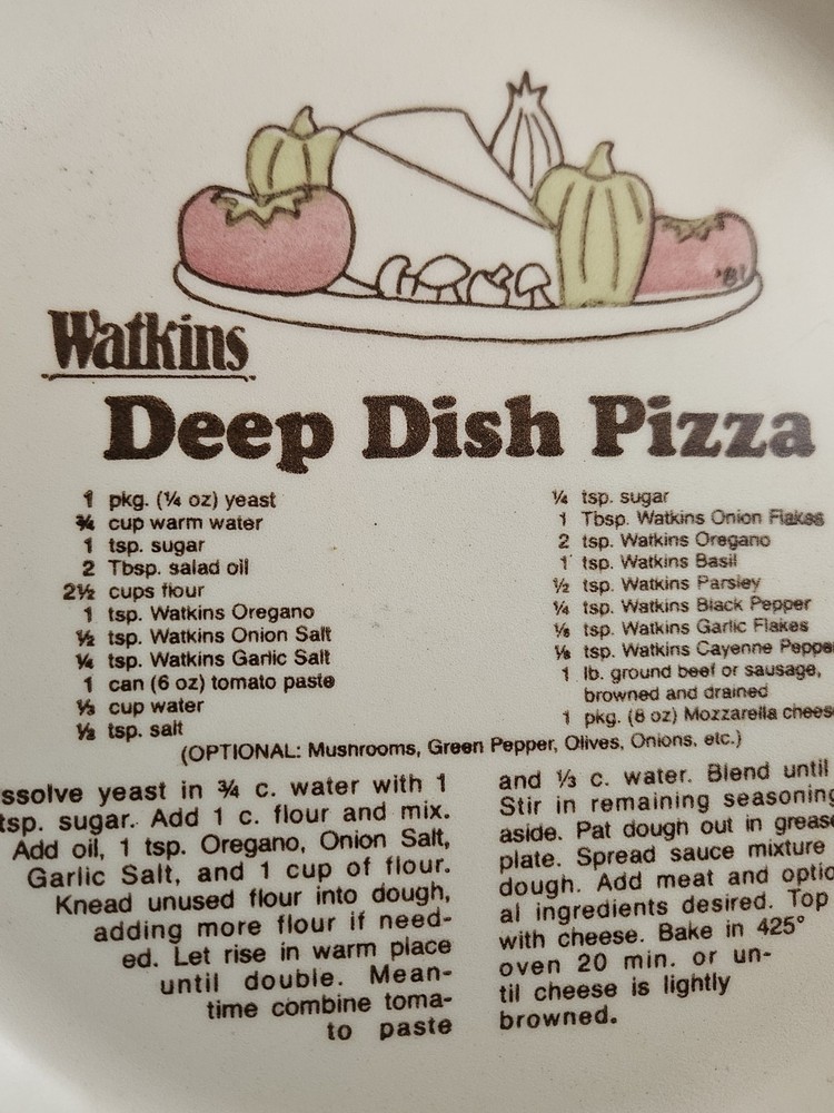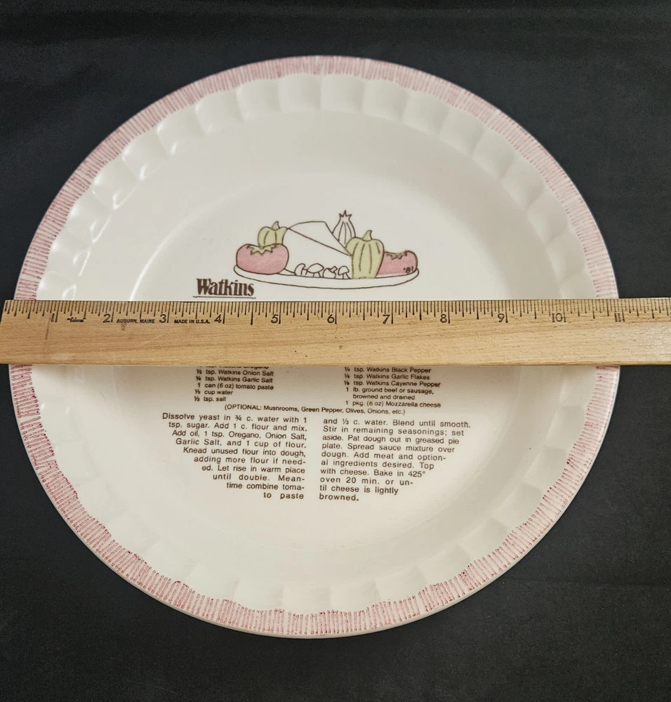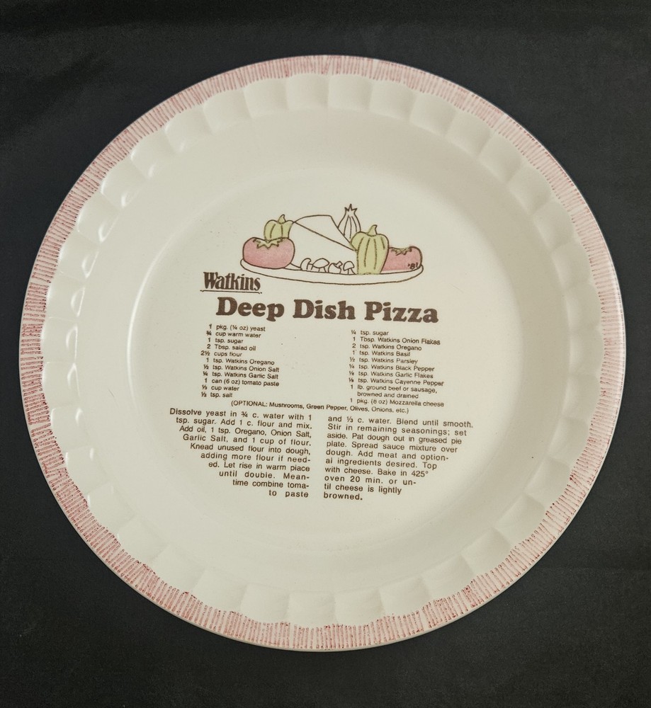 Vintage Watkins Deep Dish Pizza Pie Plate with Recipe Excellent pre-owned condition. Please see pictures for details and measurements as they are part of the description.