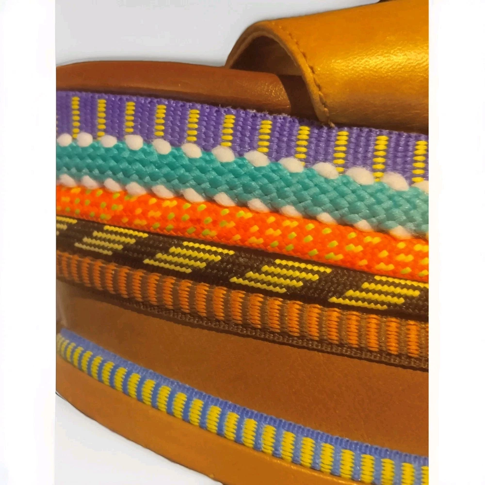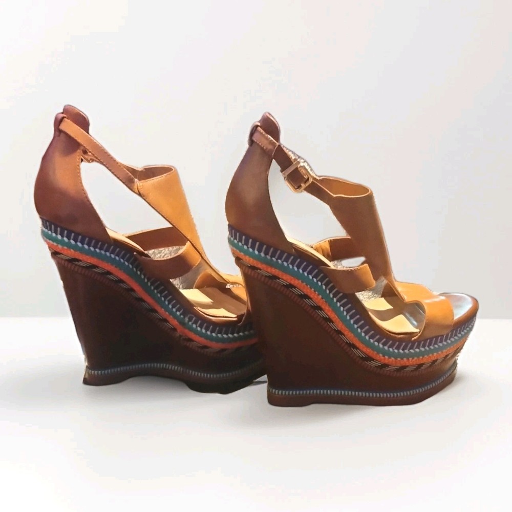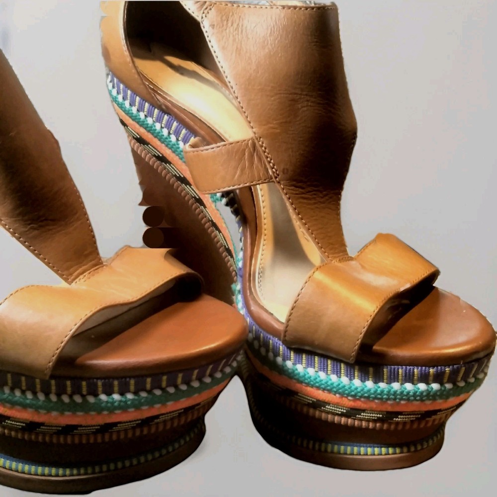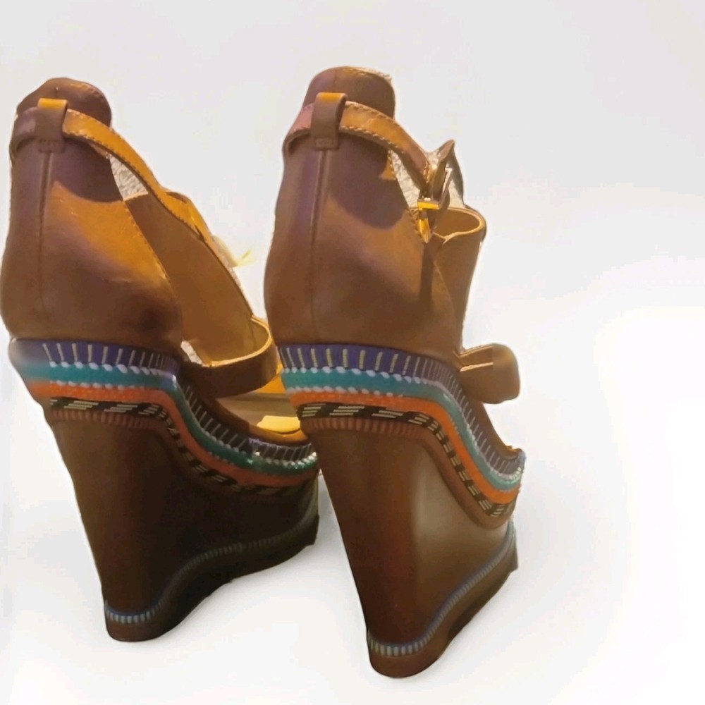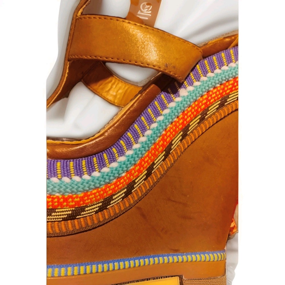 This product is a pair of vintage wedge heels from the 1970s, featuring a retro design with a six-inch height in size 7 wide. The heels are multicolored and embody a unique style that adds a touch of nostalgia to any outfit. Perfect for those who appreciate classic fashion with a touch of vintage flair.