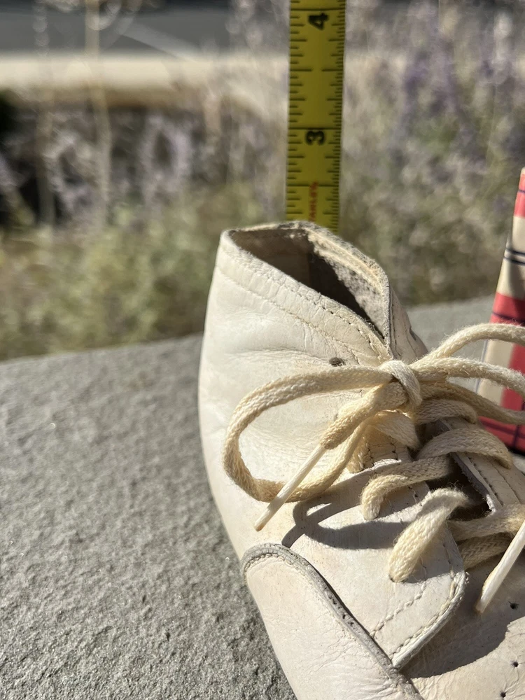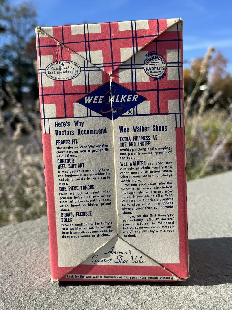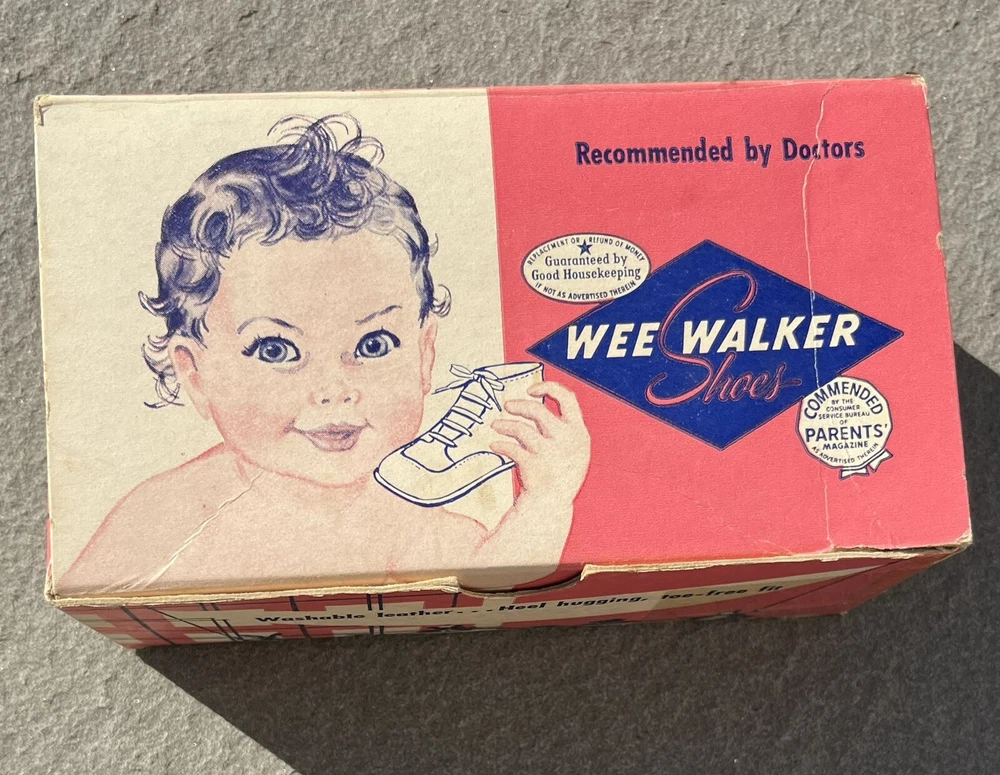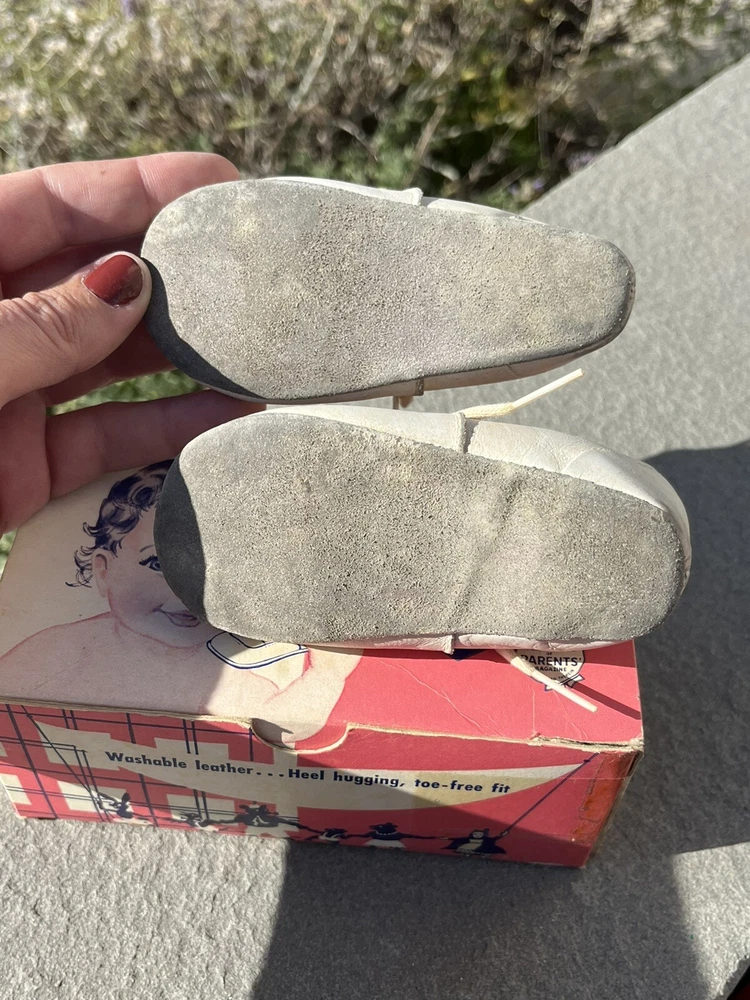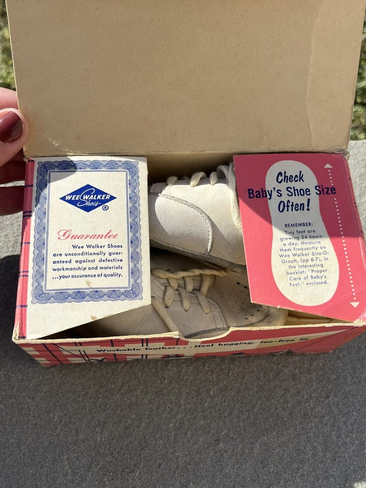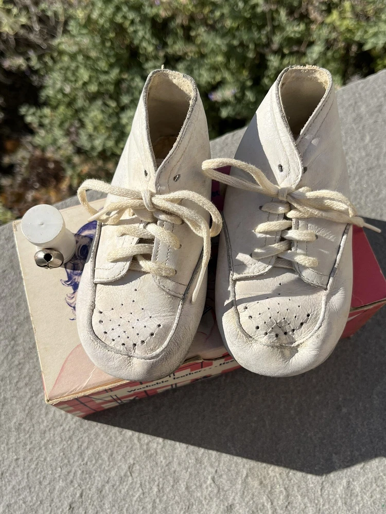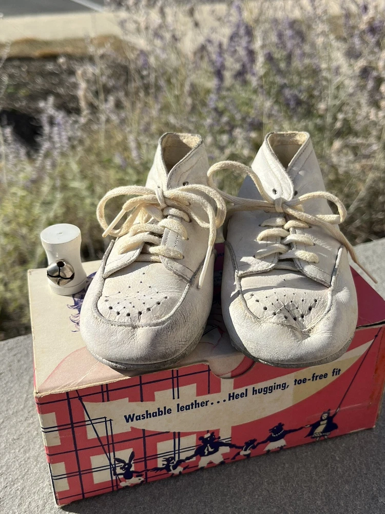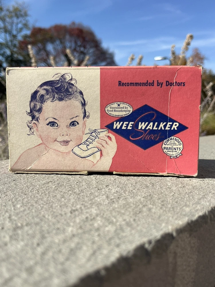 These vintage Wee Walkers baby shoes are a rare find for collectors and enthusiasts alike. The shoes come in their original box from 1960 and include a shoe plastic screw top bell. The white leather material and vintage look make these shoes a stylish addition to any collection. The shoes are perfect for everyday wear and are a great conversation starter. They have been worn and loved. There is a bell included that appears to be intended to clasp onto the laces. The box has tape on one edge. See pics.