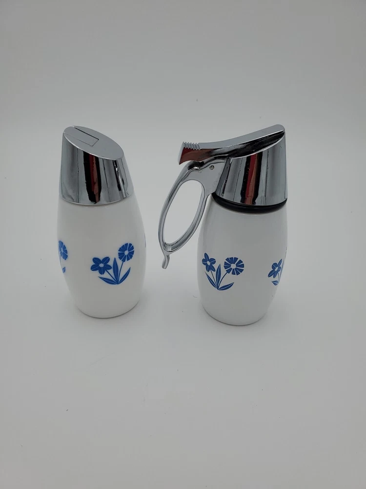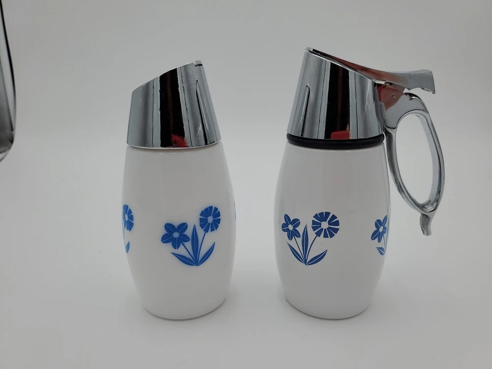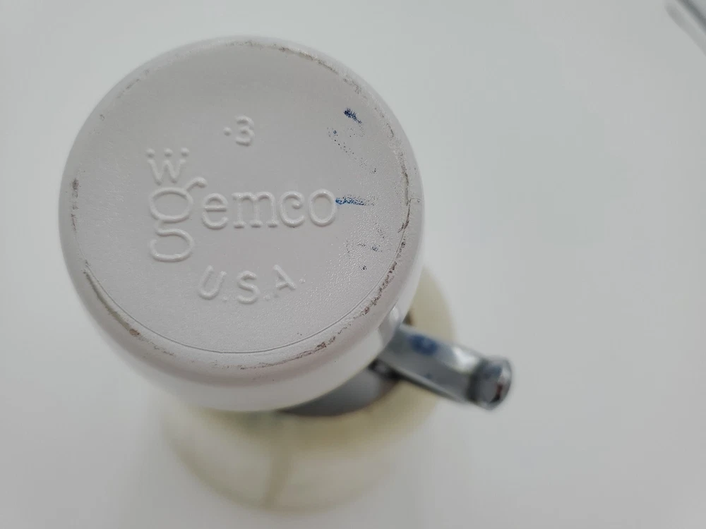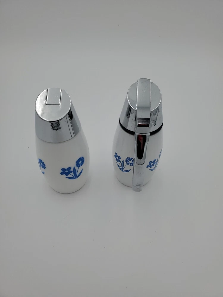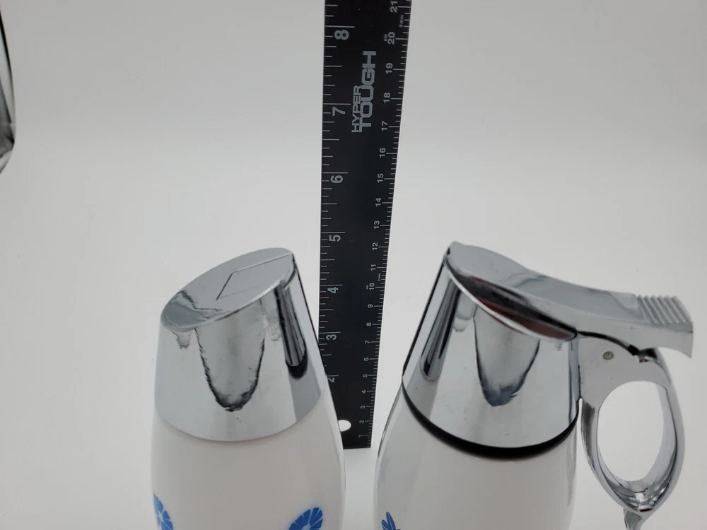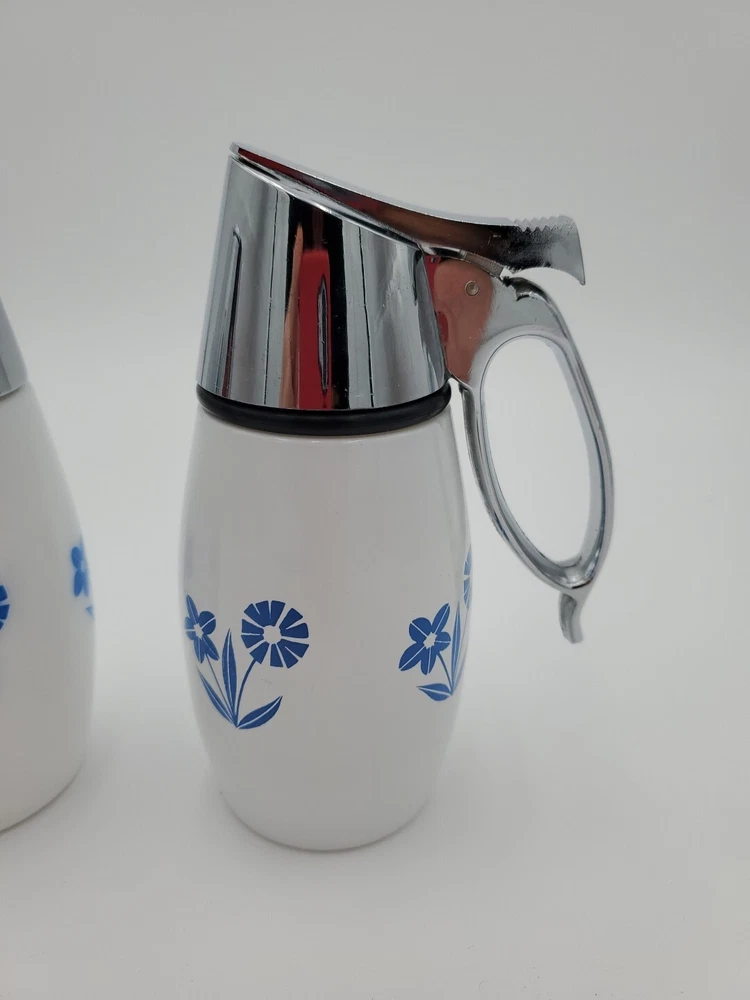 This vintage Westinghouse Gemco USA syrup and sugar dispenser is a charming addition to any kitchen. With a round shape and glossy finish, it features a beautiful cornflower pattern in white and blue. The dispenser has a capacity of 8oz and is made of milk glass, making it easy to clean and dishwasher safe. It comes with a handle and lid, and is handmade with fused glass production technique. The item weighs 11.8 and 14.9ozs and has an impressed backstamp. The dispenser is part of the Gemco product line and was manufactured in the United States in the 1960s. Perfect for antique collectors and lovers of art deco style, this syrup and sugar dispenser is a must-have for any vintage kitchen.