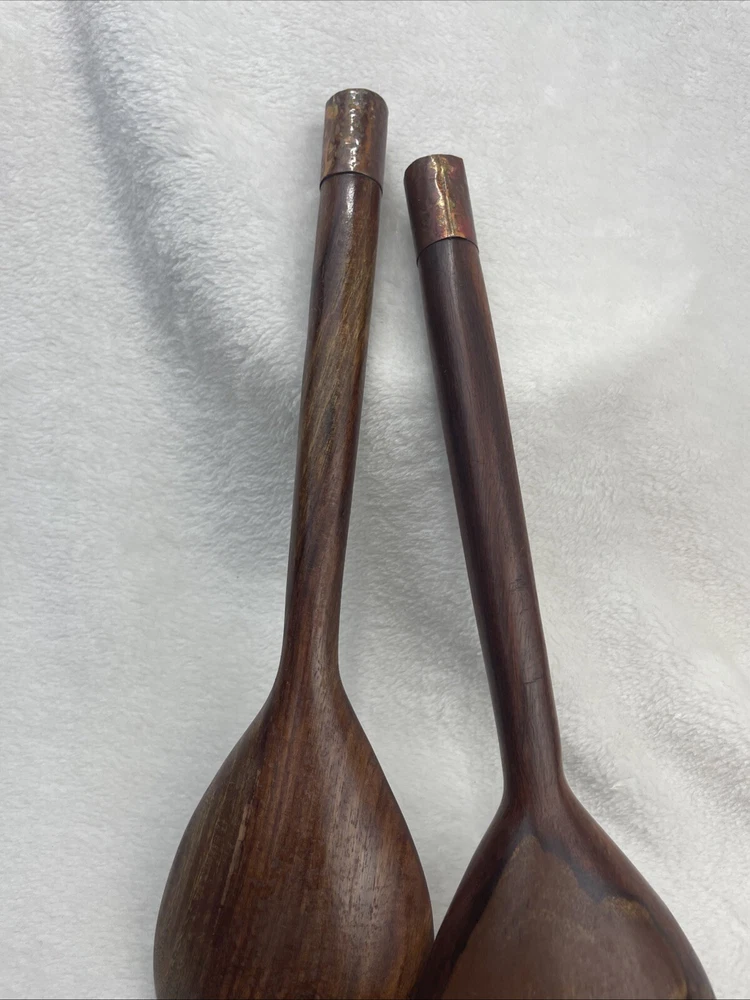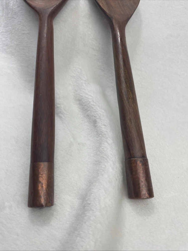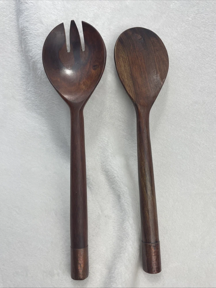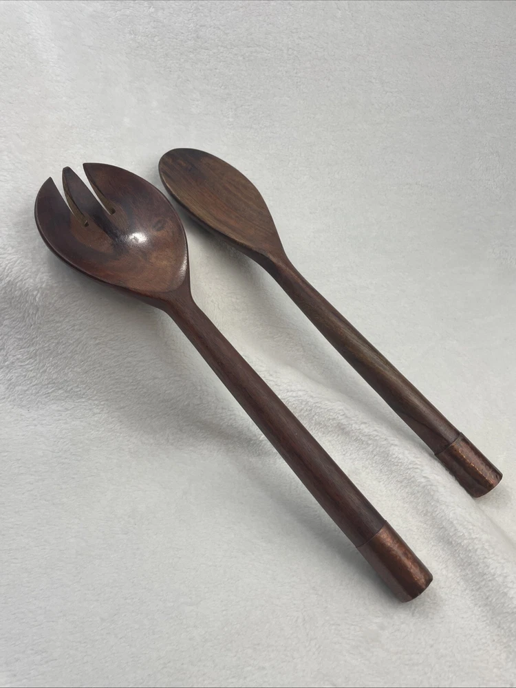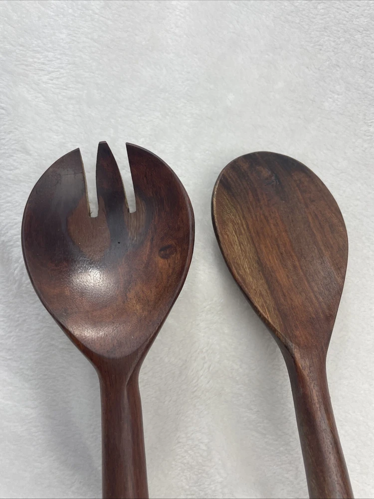 This vintage serving utensils set is a unique addition to your kitchen collection. The set includes a fork and spoon, both made of high-quality wood. The brown color of the utensils gives them a rustic and charming appeal. The set is perfect for serving salads or other dishes and is suitable for both teens and adults. The utensils are original and were manufactured in the 1990s in an unknown country or region. The handle of each utensil is made of wood, adding to their durability and authenticity. Add this set to your collection of flatware, knives, and cutlery today!