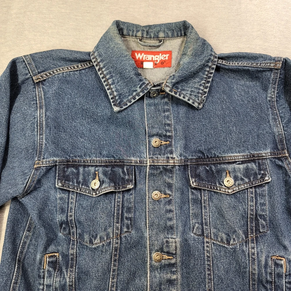 This vintage Wrangler denim jacket is a must-have for any fashion-savvy man. With a solid blue color and short length, it's perfect for any occasion. The jacket features a spread collar, button closure, and accents that give it a unique look. Made of high-quality cotton denim, it's comfortable and durable. The jacket is a size medium and has a regular fit. It's perfect for men who want to add a touch of style to their wardrobe. Whether you're going out with friends or running errands, this jacket is sure to turn heads. Don't miss out on the chance to own this one-of-a-kind piece.