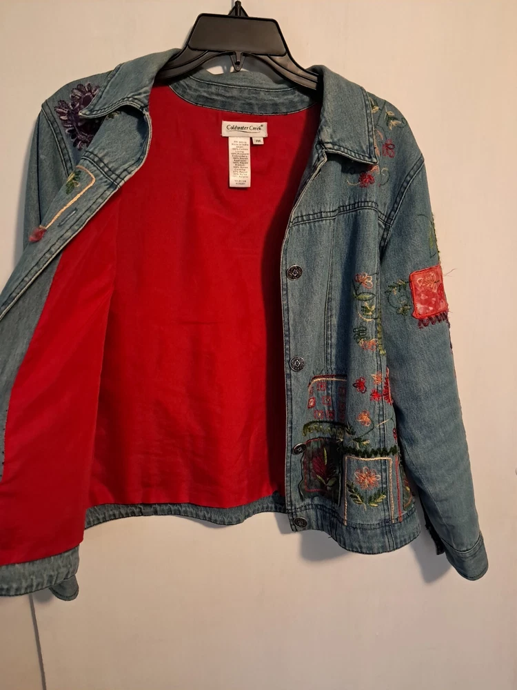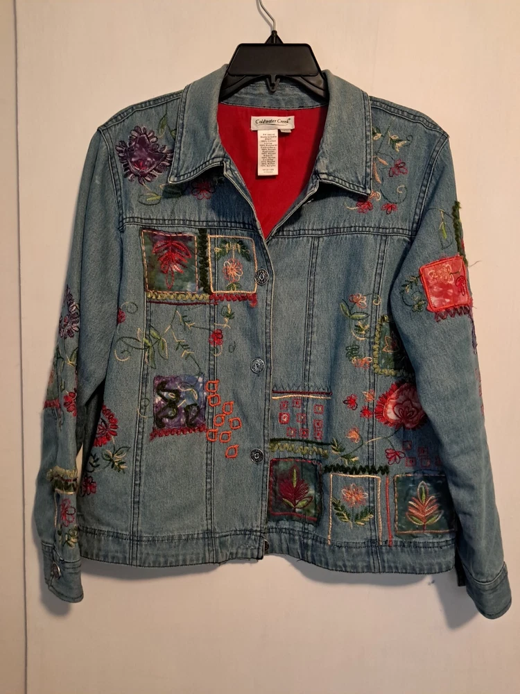 This vintage Coldwater Creek jacket is a unique piece that features a patchwork of floral embroidered denim. The jacket has a short length with long sleeves and a collared neckline. It is made of cotton outer shell material with a polyester lining and insulation material. The jacket is decorated with button closure and decorative buttons that add a bohemian touch to the overall look. The jacket is a regular fit and is available in petite size. This item is a must-have for any vintage clothing enthusiast.