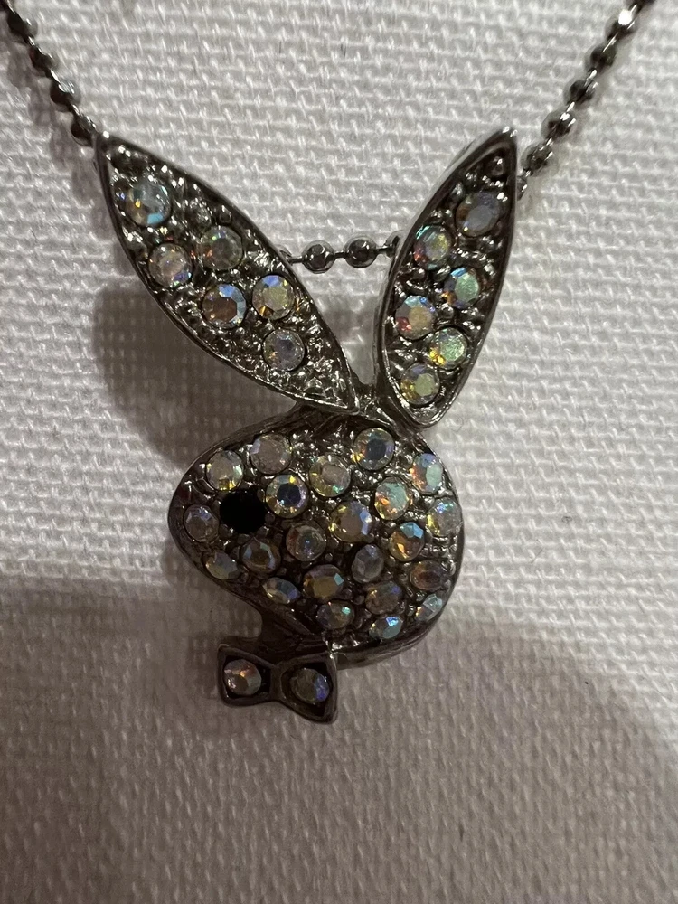 Add a touch of nostalgia to your jewelry collection with this Vintage Y2K Playboy Bunny Pendant Necklace. The necklace features a silver-tone chain with a lobster closure and a rhinestone pendant with a black eye design. The pendant is adorned with multicolor crystal stones that give it a unique and eye-catching look. Perfect for any occasion, this necklace is ideal for graduations, Christmas, birthdays, or Valentine's Day. The necklace has a 16-inch length and is plated with silver metal. This piece is a must-have for anyone who loves vintage jewelry and wants to add a touch of glamour to their outfit.
