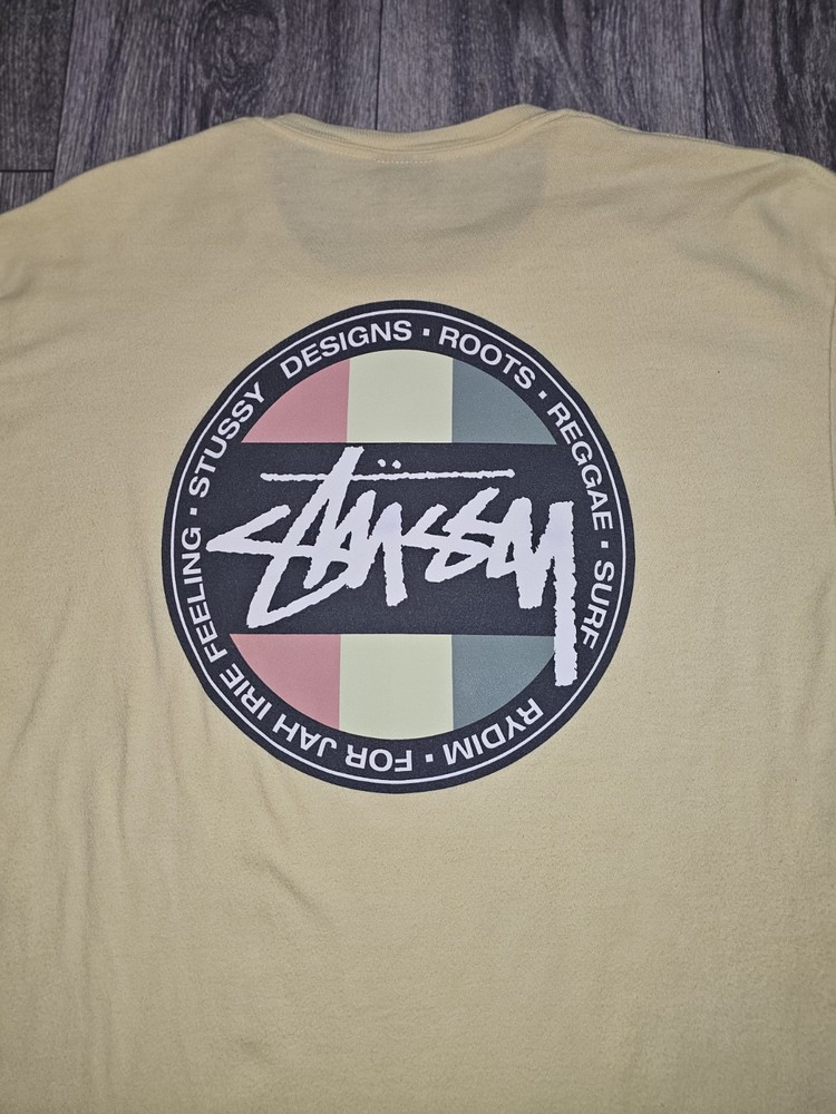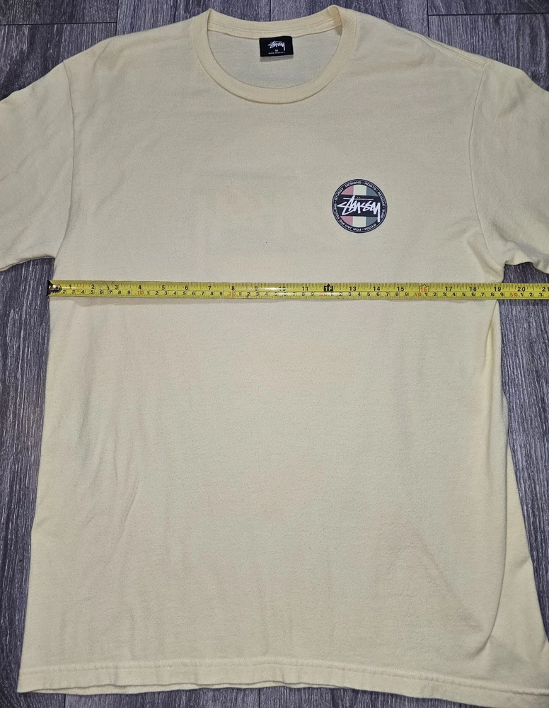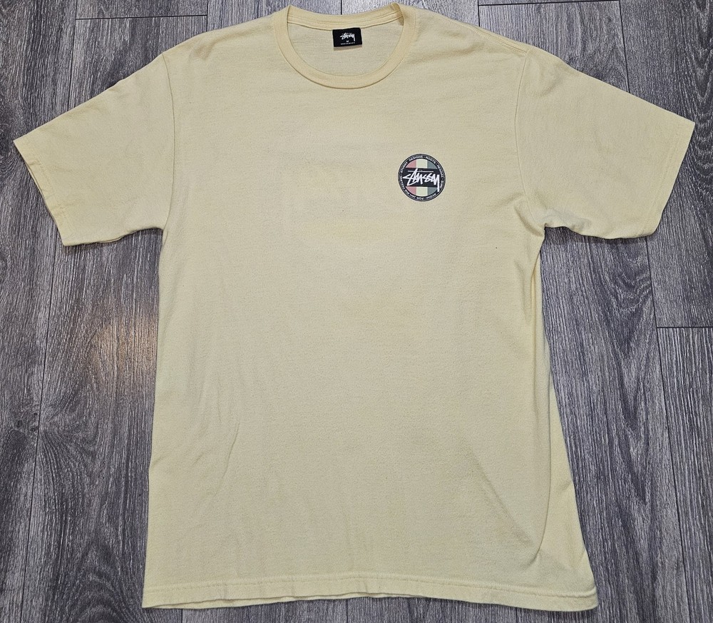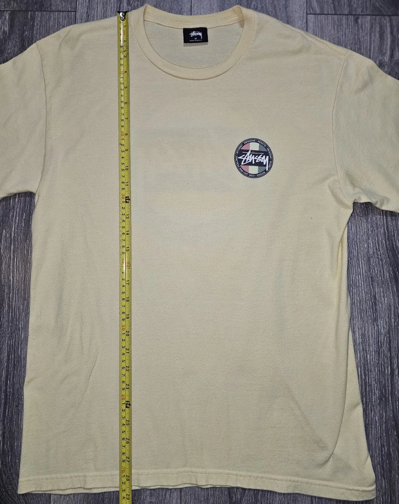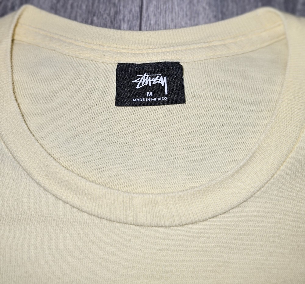 Elevate your wardrobe with this vintage Y2K Stussy Classic Dot Logo T-Shirt in beige. Made from comfortable knit cotton fabric, this classic fit t-shirt features a crew neck, short sleeves, and a graphic print with the iconic Stussy logo. Perfect for all seasons, this t-shirt is easy to care for and machine washable. With its timeless design and skate-inspired character, this Stussy t-shirt is a must-have for any fashion-conscious man. Whether you're hitting the beach or running errands, this versatile t-shirt is suitable for any occasion. Add a touch of vintage style to your wardrobe with this medium-sized t-shirt, made in Mexico during the early 2000s.