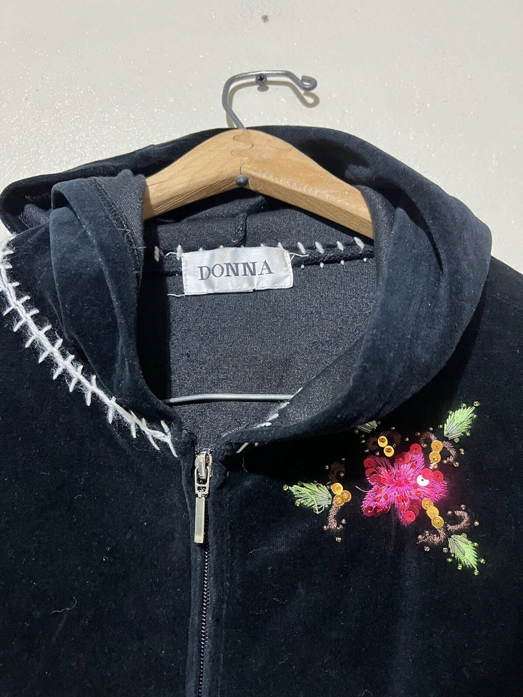 Vintage Y2K Women’s Suede Embroidered Zip-Up Black Hoodie Size Large 2000s VTG