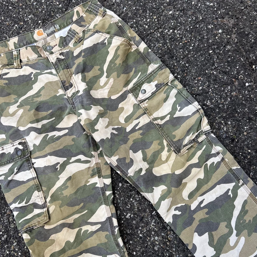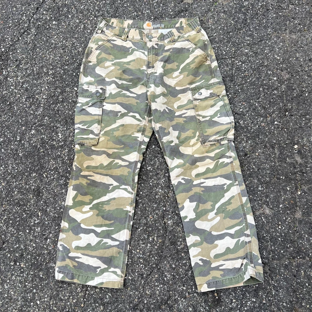 Vintage Y2K camo Carhartt work wear cargo pants. Great pair. Measures 33x29 and a 9.5 leg opening. Please check measurements before purchasing. I do my best to show any flaws in pictures. Quick shipping! Bundles encouraged! @ants_haul on Instagram.