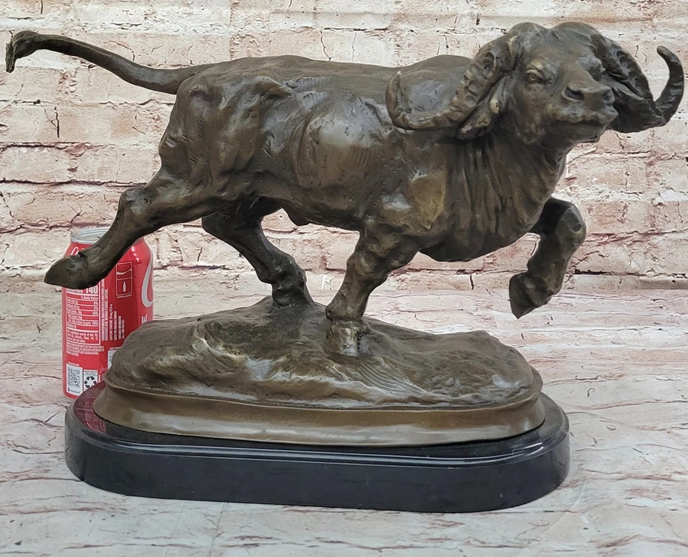 Condition : This sculpture is in perfect condition. Bronze Dimensions with Marble Base:11" X 17" Marble Dimensions: Diameter 13.5" Height without base:10" Weight:27 LBS Inventory:2497K08442 Capturing the raw power and unpredictable temperament of a charging bison, this sculpture vividly depicts the intensity of the moment. Bison, typically known for their peaceful and lazy demeanor, can transform into formidable forces, capable of charging at speeds up to thirty-five miles per hour. The sculpture portrays the bison in mid-charge, showcasing its massive skull and distinctive horns, emphasizing the potential danger inherent in its sudden and unpredictable behavior. The intricate detailing, including the large curled horns, brings the sculpture to life, conveying the strength and ferocity of this iconic North American mammal. The bison's natural weapons, from its horns to its massive head, are skillfully portrayed in this fully detailed sculpture. The artist highlights the potential for a bison to use its head as a battering ram, harnessing the momentum of its substantial weight at high speeds. The hind legs, capable of delivering devastating force, add to the sculpture's dynamic representation of the bison's power. The brown patina, enhanced with subtle gold touches, adds depth and realism to the artwork, capturing the essence of this majestic creature in a moment of intense action. Crafted with precision and artistry, this sculpture is a product of the "Lost Wax Method," a technique that allows for intricate details and lifelike representations. Mounted on a round black marble base, the sculpture gains a sense of grounding, emphasizing its significance as a work of art. Signed by the artist Milo, this piece not only pays homage to the strength and vitality of the bison but also serves as a testament to the artist's skill in capturing the essence of wildlife in bronze. RUNNING BISON CHARGES BRONZE MARBLE SCULPTURE MILO HOT CAST MARBLE BASE FIGURINE Video will open in a new window Using the eBay App? Paste link into a browser window: [isdntekvideo]