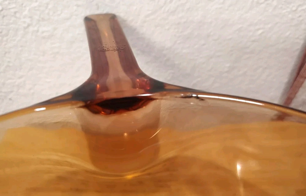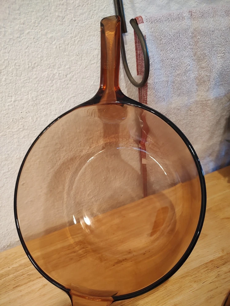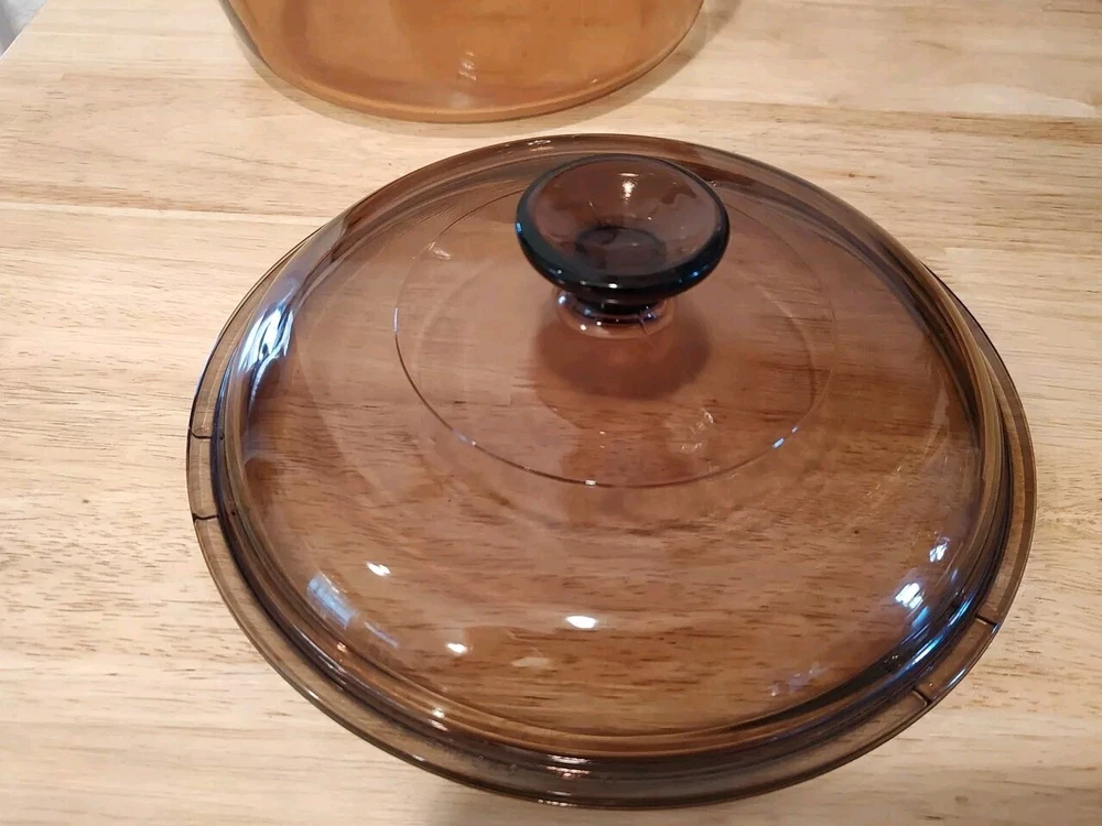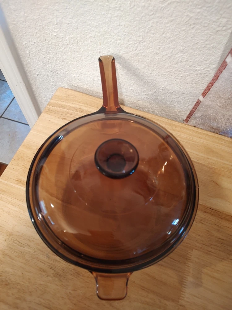Vision Ware Corning Sauce Pan Pot 2.5 L With Lid Amber Cookware USA, pot has a small smooth chips on top edge beside of handle, shown in pictures, please view photos for details, price discounted accordingly.