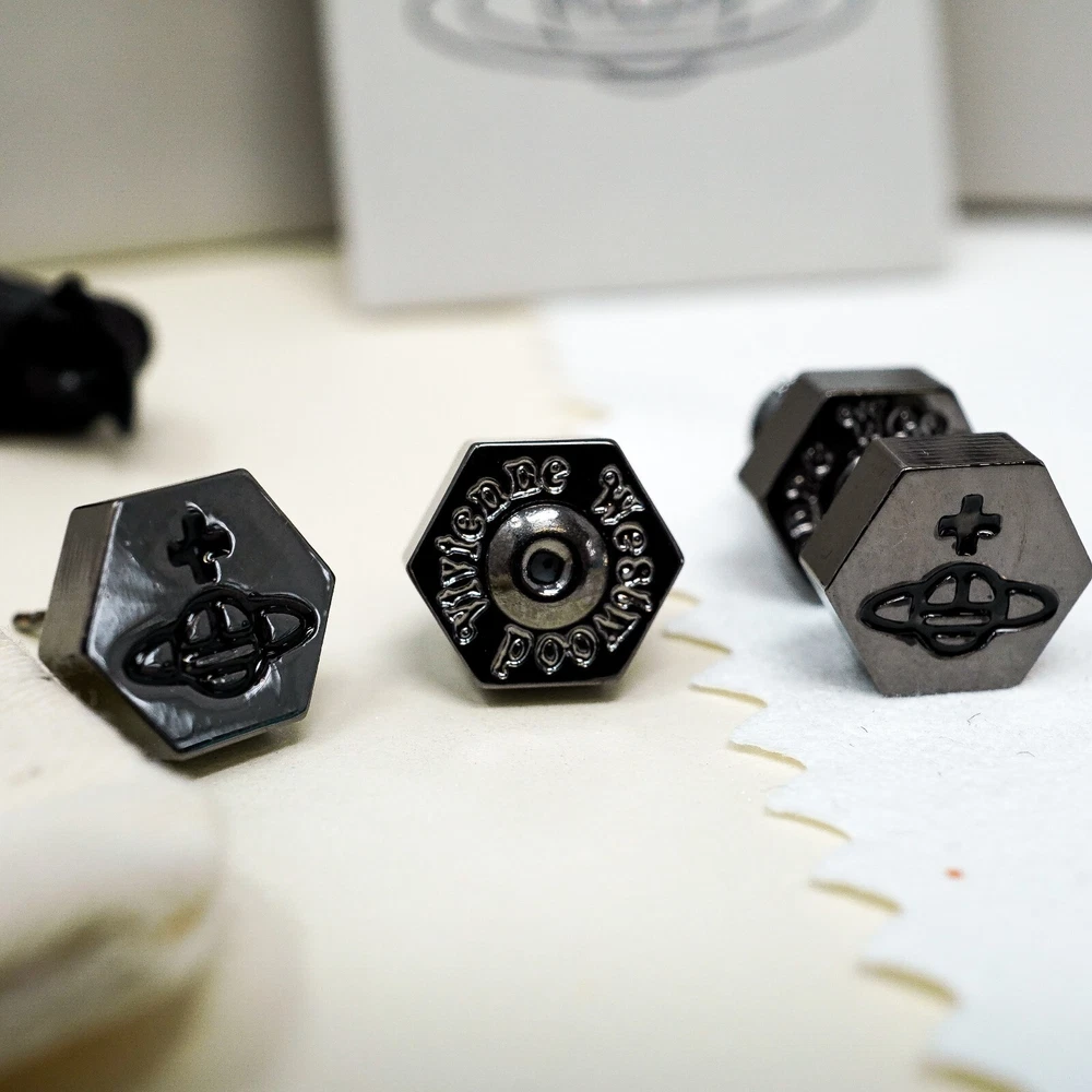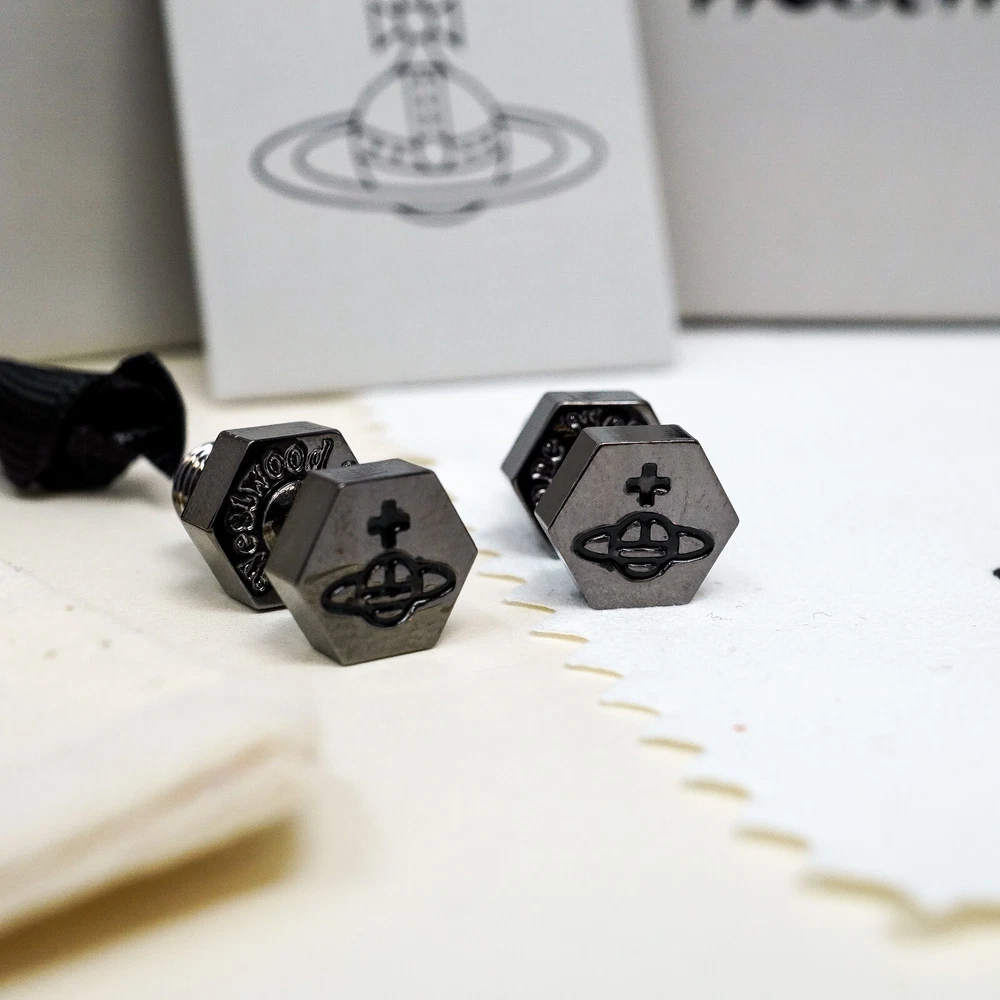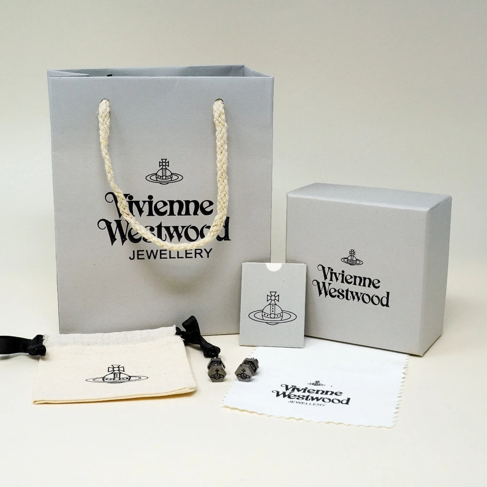 Main Stone Colour:BlackMaterial:BrassCountry of Origin:Great BritainColour:gun metalBrand:Vivienne WestwoodStyle:StudType:EarringsShape:OrbMain Stone Length:2 cmMain Stone Width:1 cmMetal:BrassSeller Notes:“Fantastic”