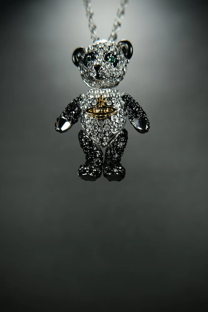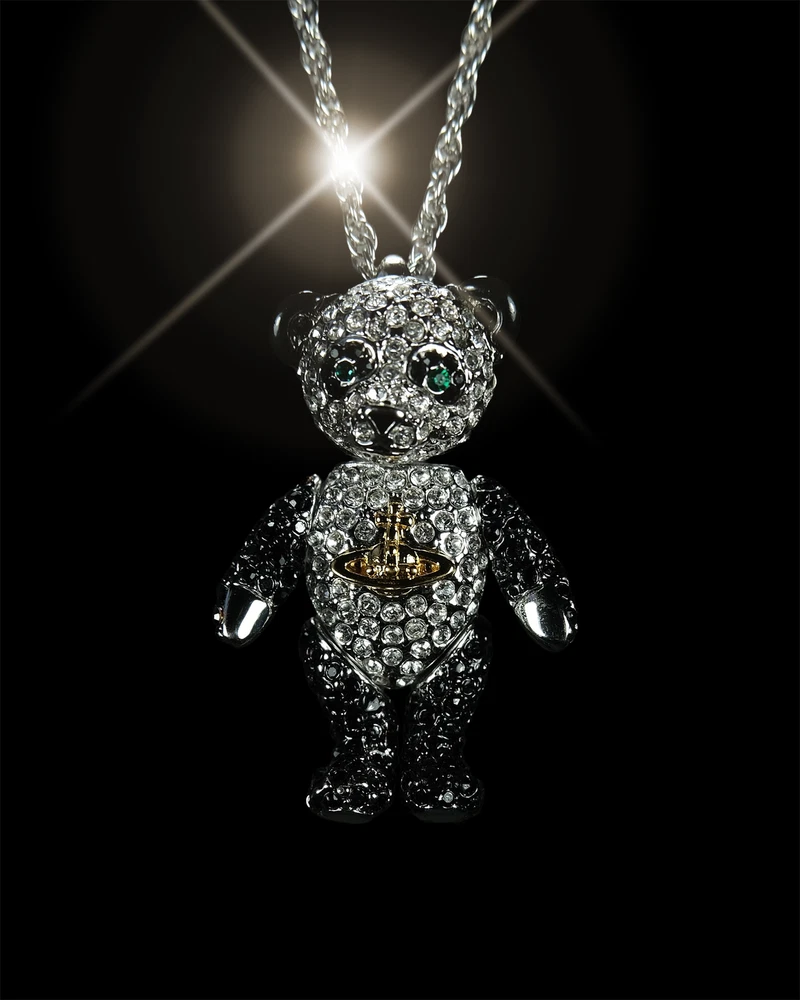 Step into luxury with this exceptional piece from Vivienne Westwood's iconic Bear series. First introduced in 2002, this pendant is from the coveted original launch, featuring distinctive characteristics that set it apart from later releases - notably larger diamond crystals and a uniquely articulated bear with more fluid limb movement. This charming piece perfectly showcases Dame Vivienne's ability to blend whimsy with haute couture. As part of the inaugural 2002 collection, it represents a significant moment in the Bear series' enduring legacy. Material: Stainless Steel Chain, Rhodium & brass body, Swarovski crystals embedded. Comes with original dust bag Condition: 10/10 (flawless condition, dust bag has slight wear) Measurements: Chain Length: 30.5 inches Pendant: 1.75H x 1W inches