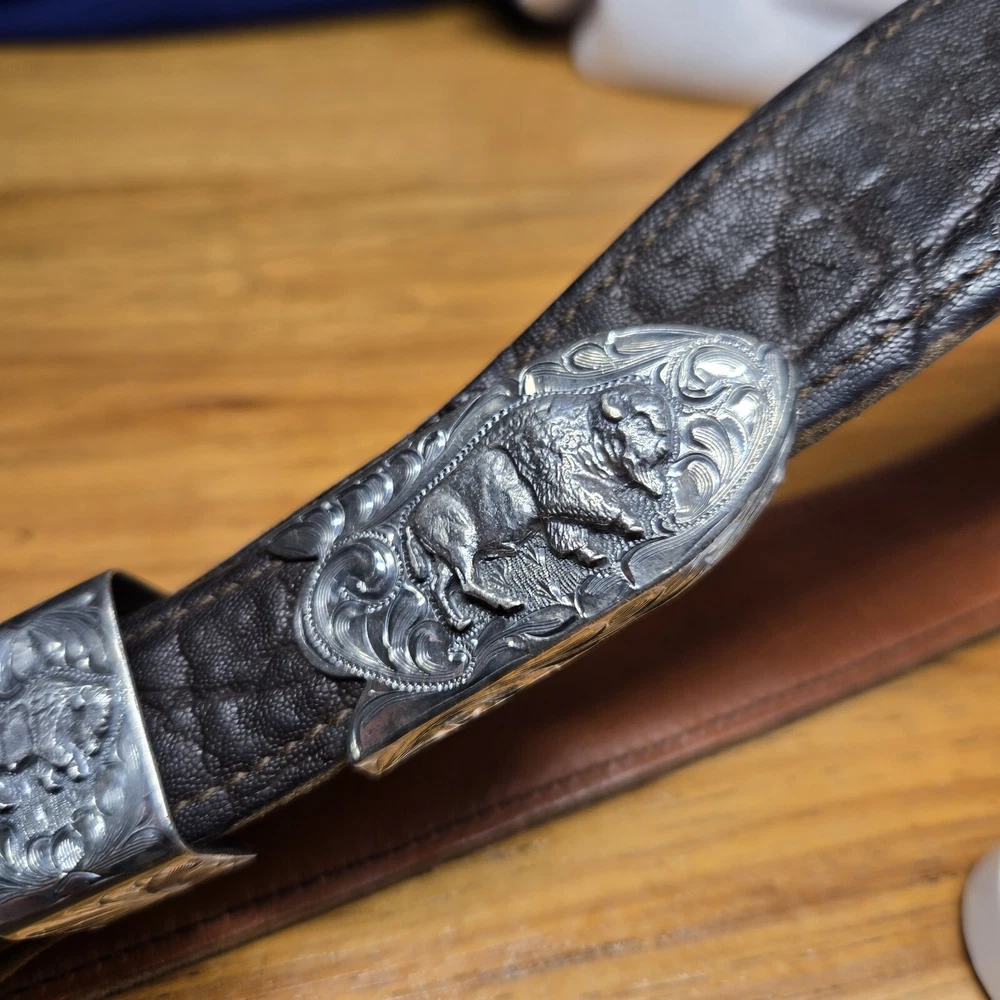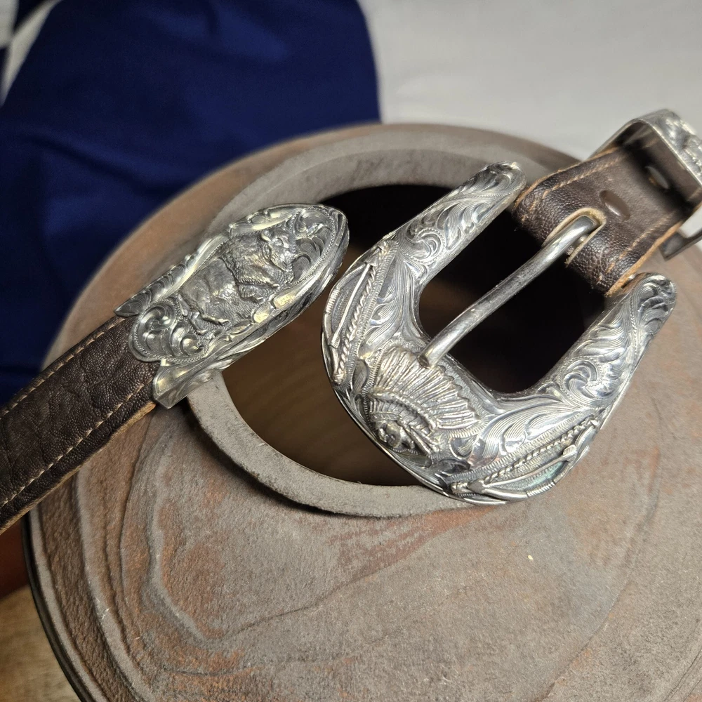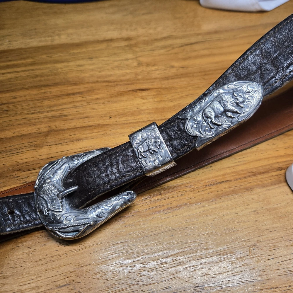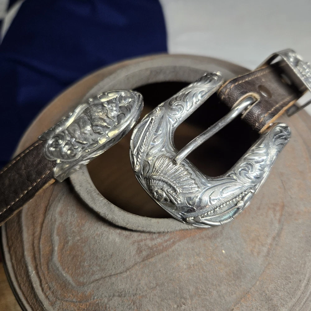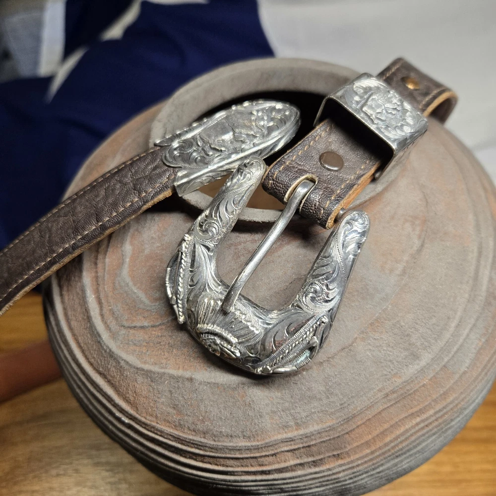Add a touch of the wild west to your outfit with this Vogt Sterling "Yellowstone" Buckle and Hardware. The intricate design and high-quality materials make it a perfect addition to any antique collection. The buckle is made to fit a sz 38 Kemosabe Leather Belt, adding an extra layer of authenticity to this piece. Whether you're a collector or just looking for a unique accessory, this antique buckle is sure to impress.