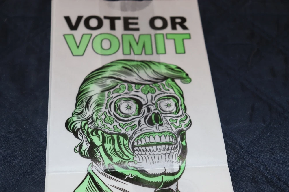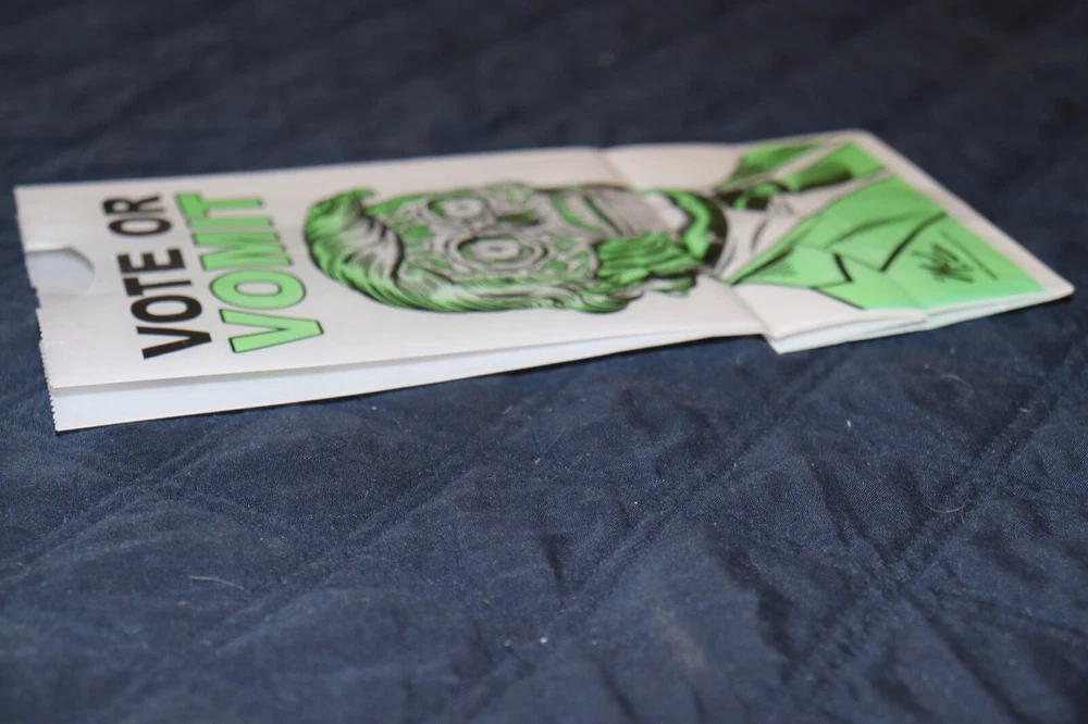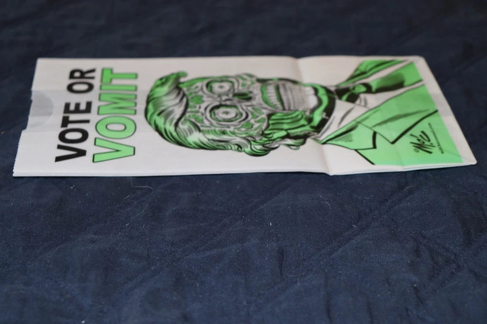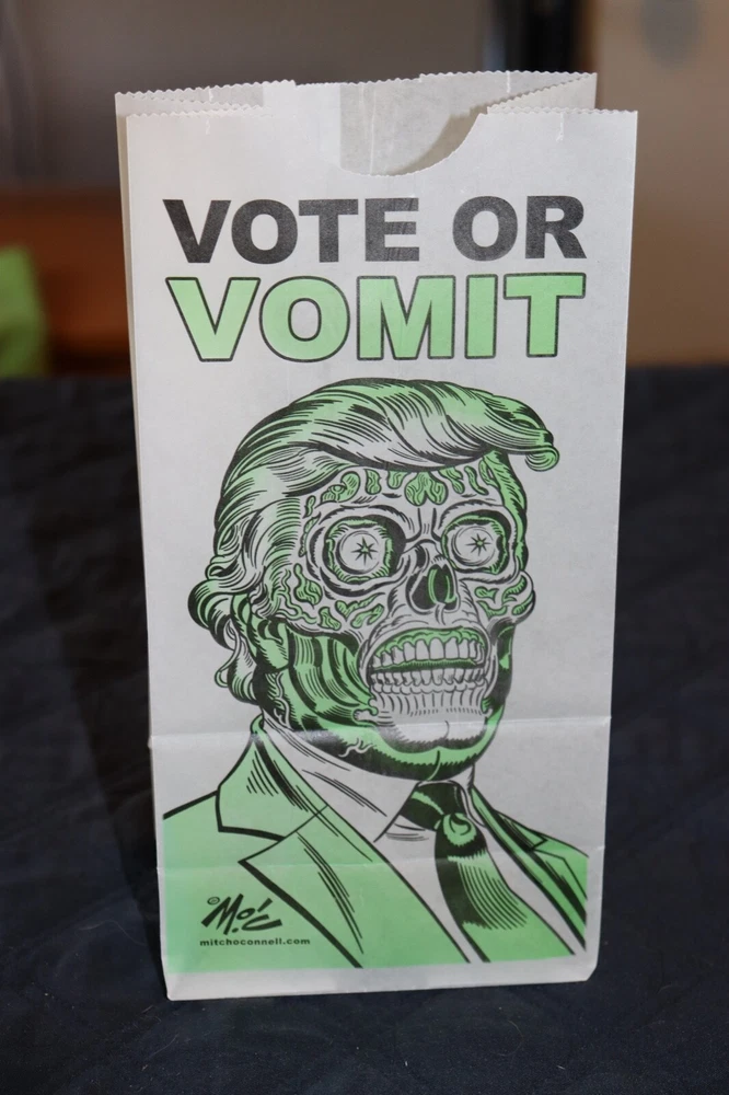 Vote or Vomit Airline Vomit Bag THEY LIVE Trump Zombie Mitch O' Connell NEW 5 x 10" Art Estate Sale Find. Check out my other listings. I am selling more DVD's, Books, Vinyl Albums, Toys and more. I list new items every month. Thank you. Feedback: I generally pay no attention to feedback. However, I will be happy to leave positive feedback if requested.