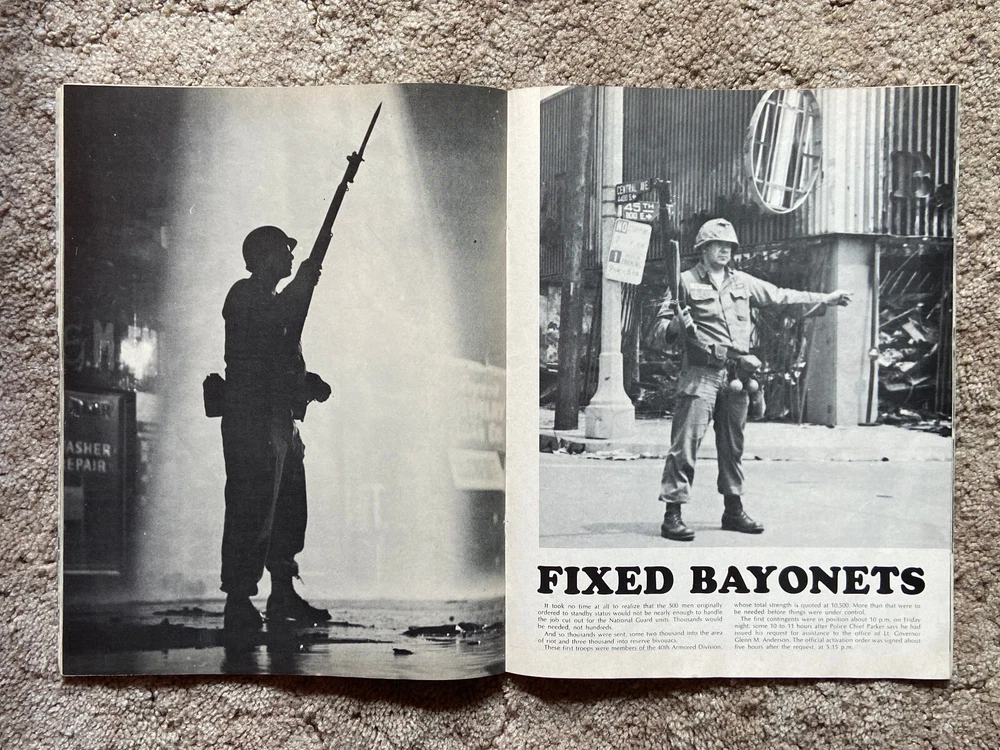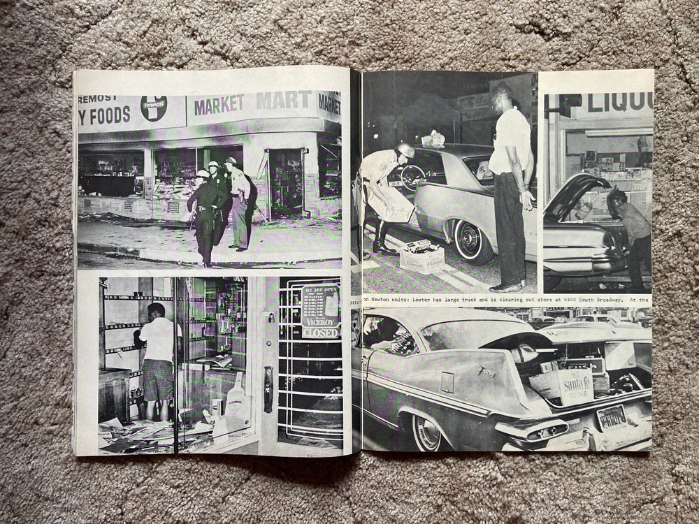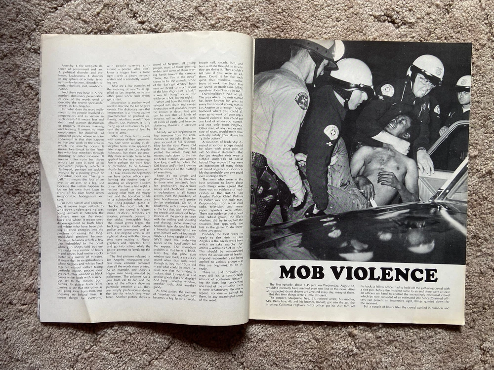 “Anarchy Los Angeles” published in a magazine-like format by Kimtex in 1965. Documents the Watts Rebellion riot that took place in August 1965 in the Los Angeles area. Numerous photographs. Several sample pages are shown in photos. Thanks for looking. I will combine shipping whenever possible on purchases made the same day. I can either provide you with a combined shipping invoice before you make payment for the items, or I can refund you any overpayment for shipping after you’ve purchased the items. Will ship to U.S. addresses only. Payment accepted through PayPal only. Please make payment within 48 hours of purchase, thank you. From a non-smoking home.