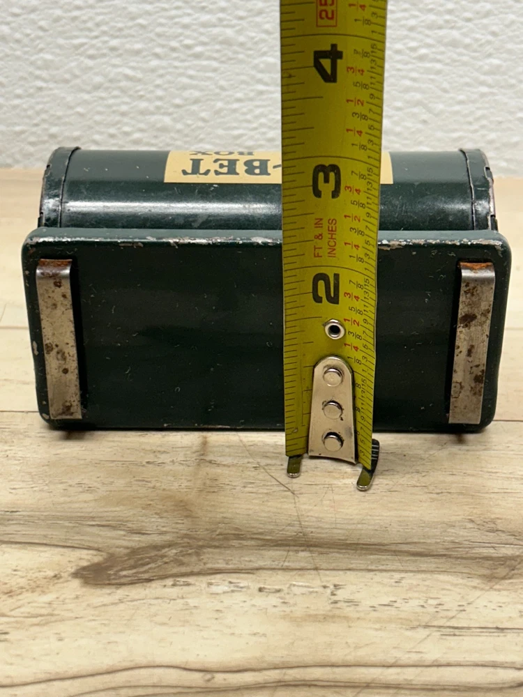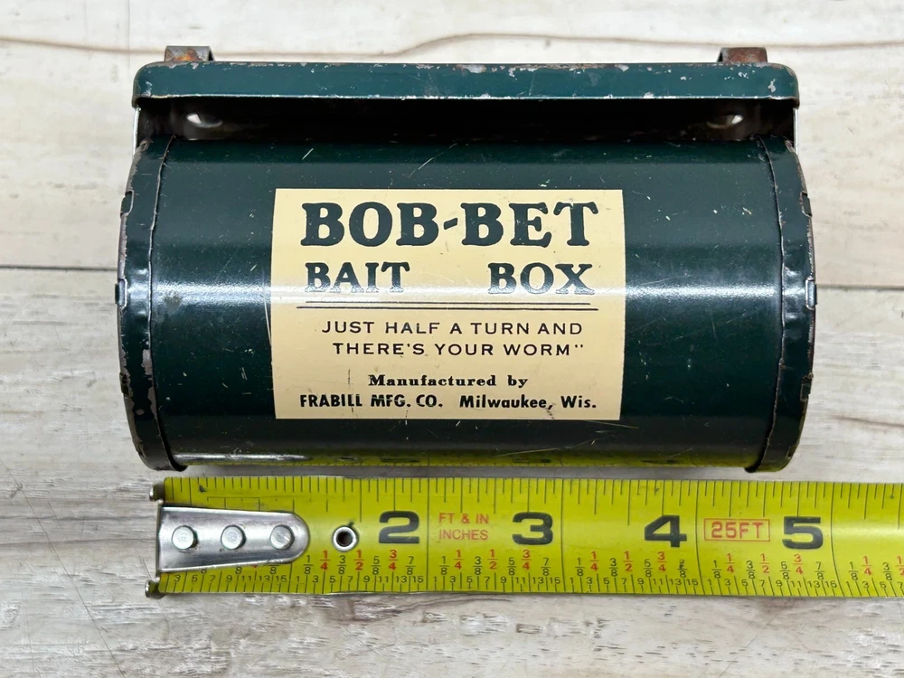 Vtg BOB-BET Tin Waist Belt Fishing Bait Box Just Half Turn And There's Your Warm.In very good working condition.There are some minor signs of age and some minor rusty spots-PLEASE see all pictures for details