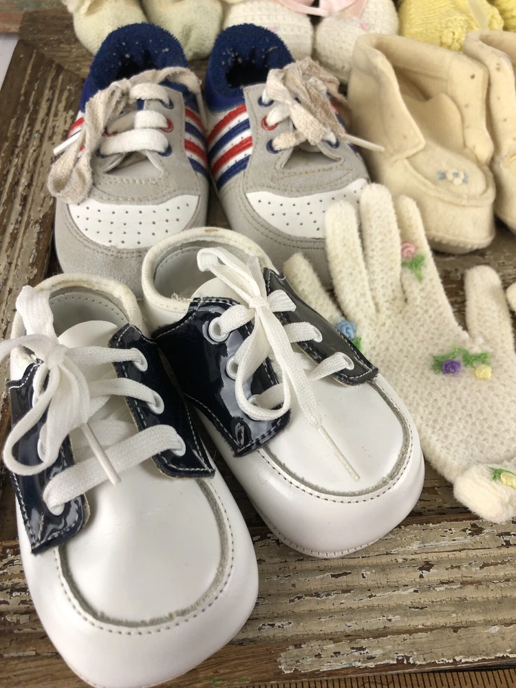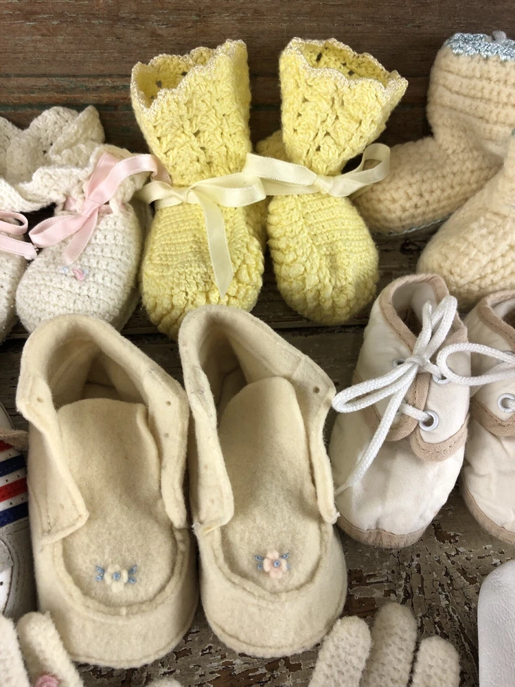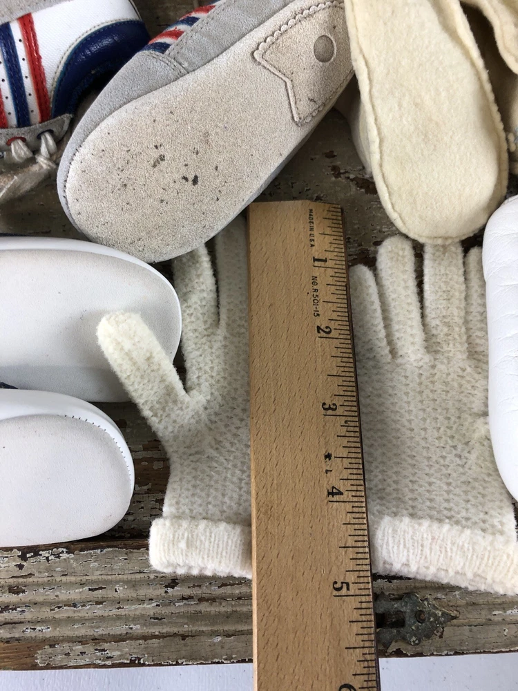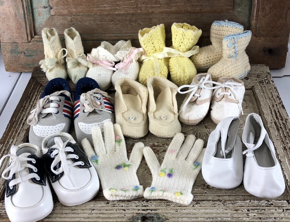 Vtg Baby Or Doll Booties Shoes Knit Crocheted Lot Gloves Sneakers Lot 10 Great lot of vintage baby shoes and knit booties. There is an adorable pair of baby knit gloves too. Some signs of age. See all pictures. The leather white shoes have loose buttons on them so I recommend sewing them on a little tighter.