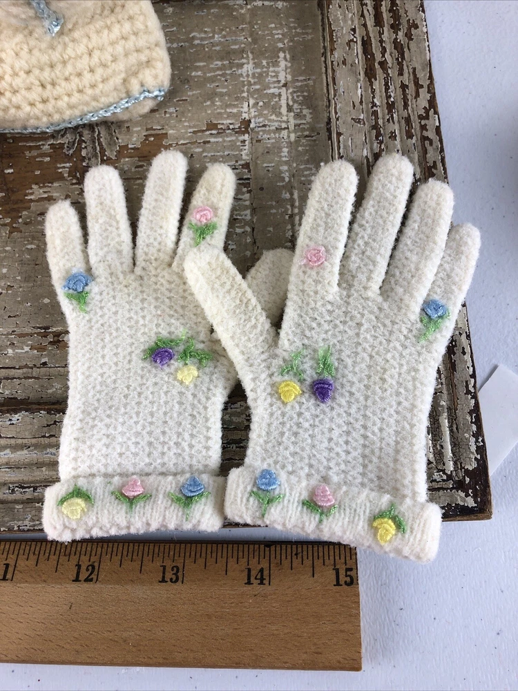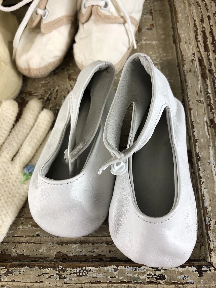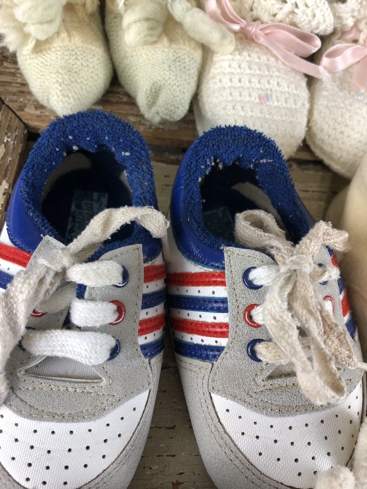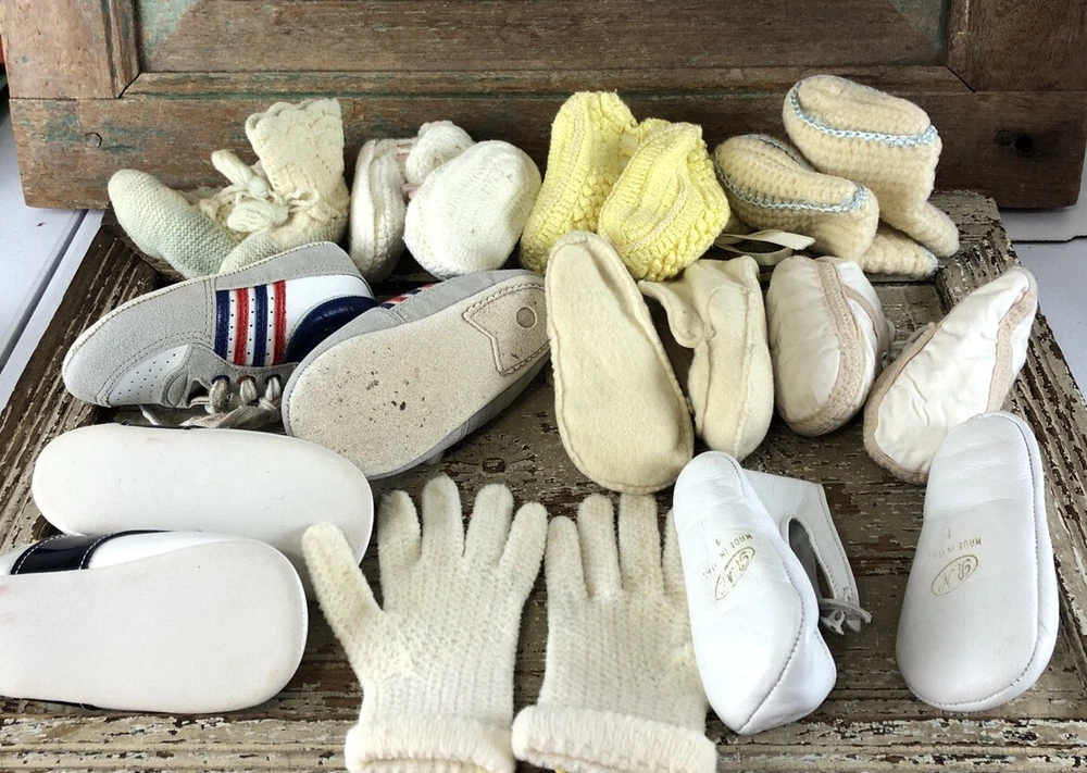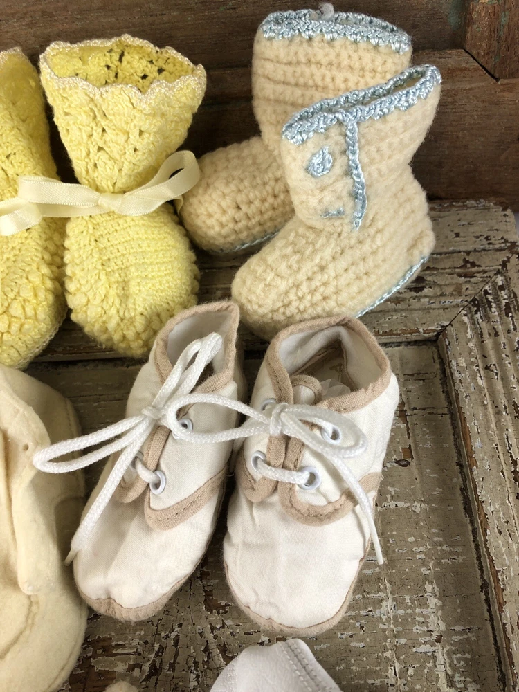 Vtg Baby Or Doll Booties Shoes Knit Crocheted Lot Gloves Sneakers Lot 10 Great lot of vintage baby shoes and knit booties. There is an adorable pair of baby knit gloves too. Some signs of age. See all pictures. The leather white shoes have loose buttons on them so I recommend sewing them on a little tighter.