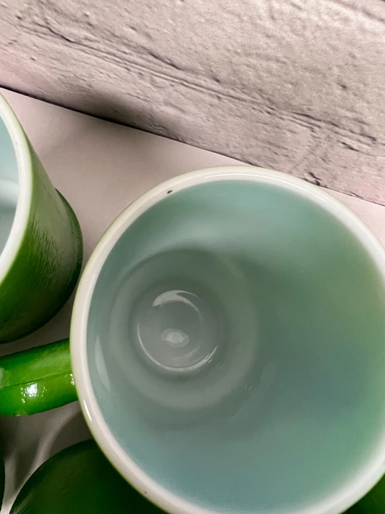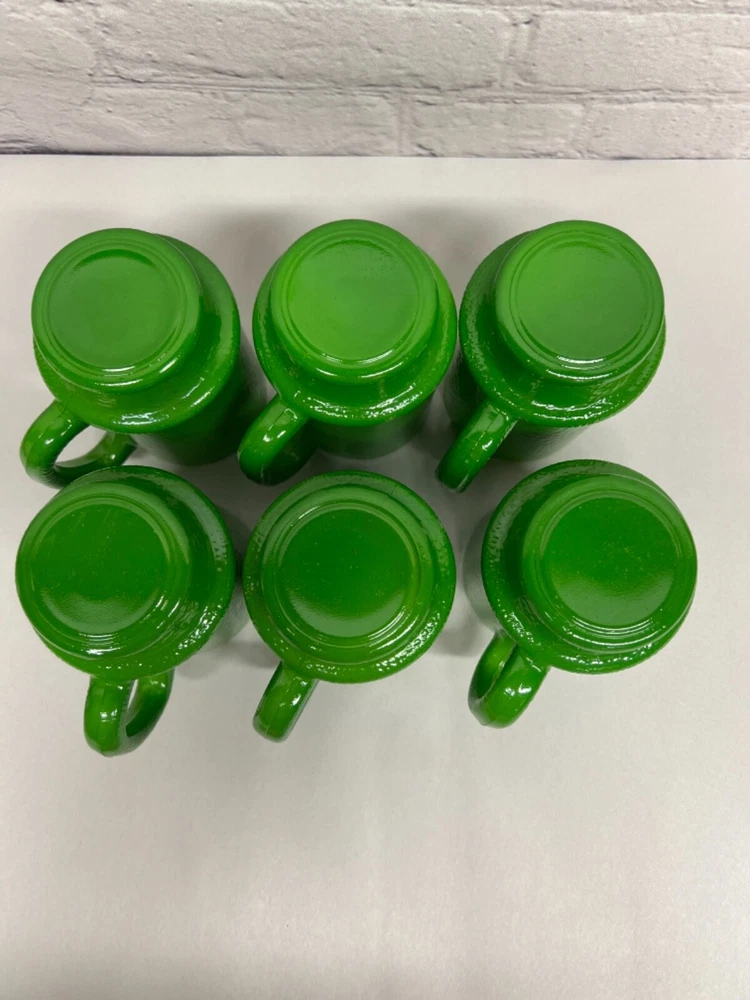 Good vintage condition. No chips, cracks or breaks. There is some slight color wear. One handle has a small are where the green color is worn off. The glass is heavy and textured. Approximately 4.75”x 2.75” and 10oz. Please see photos for condition. Thanks for looking.