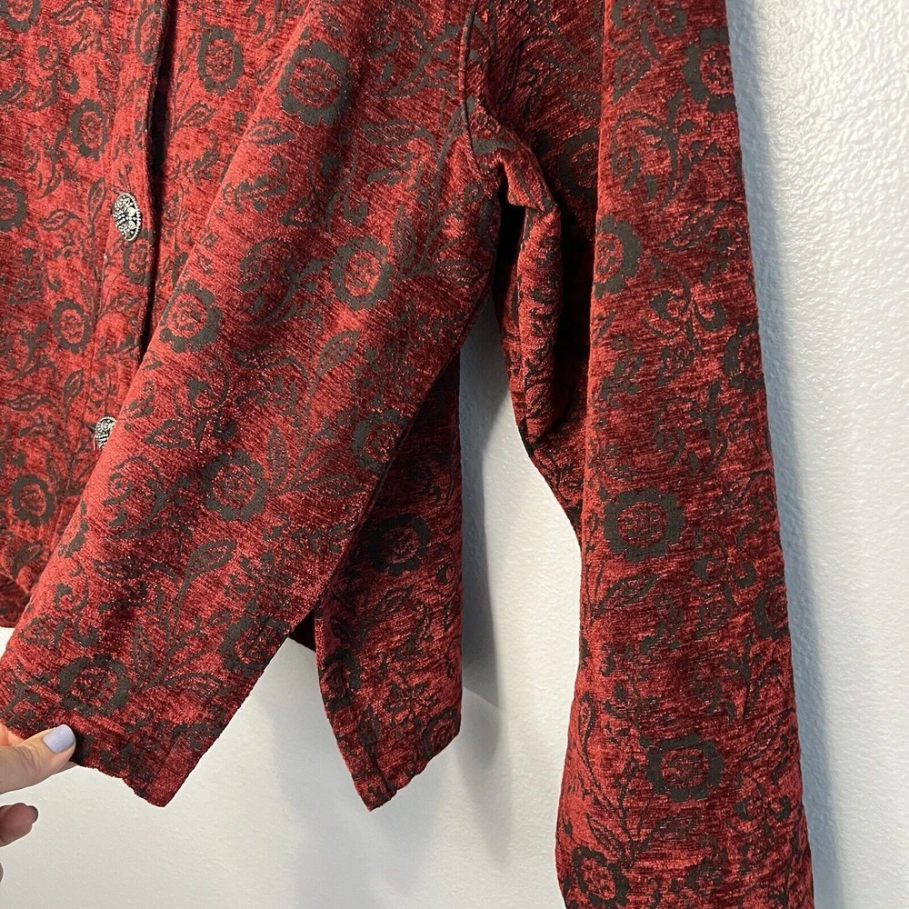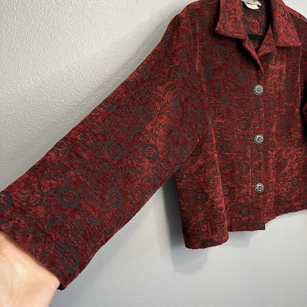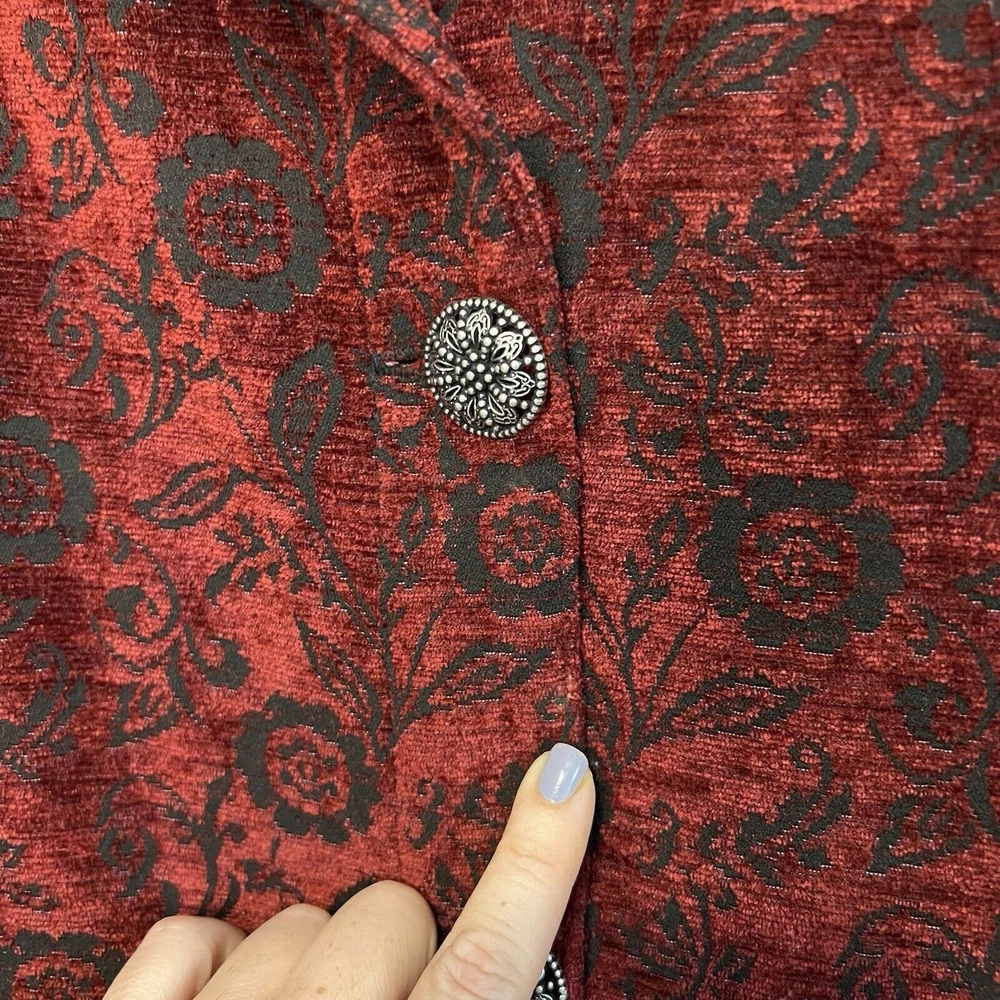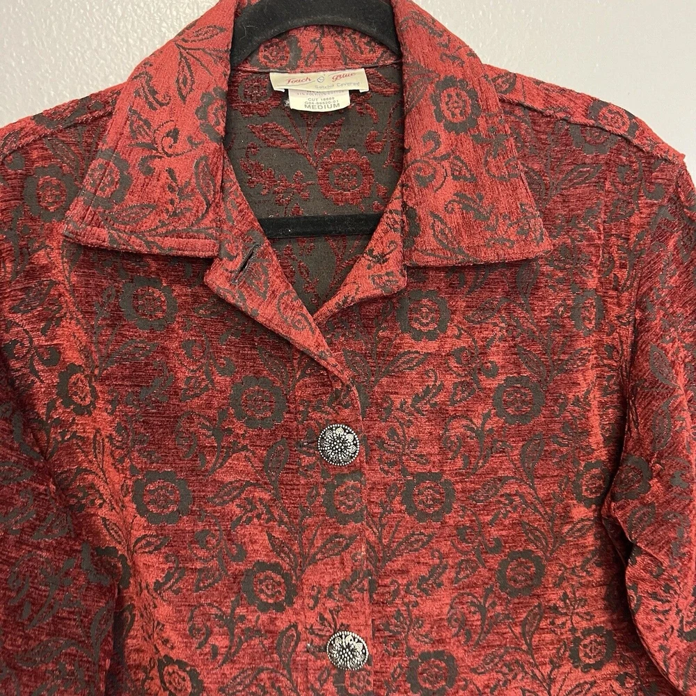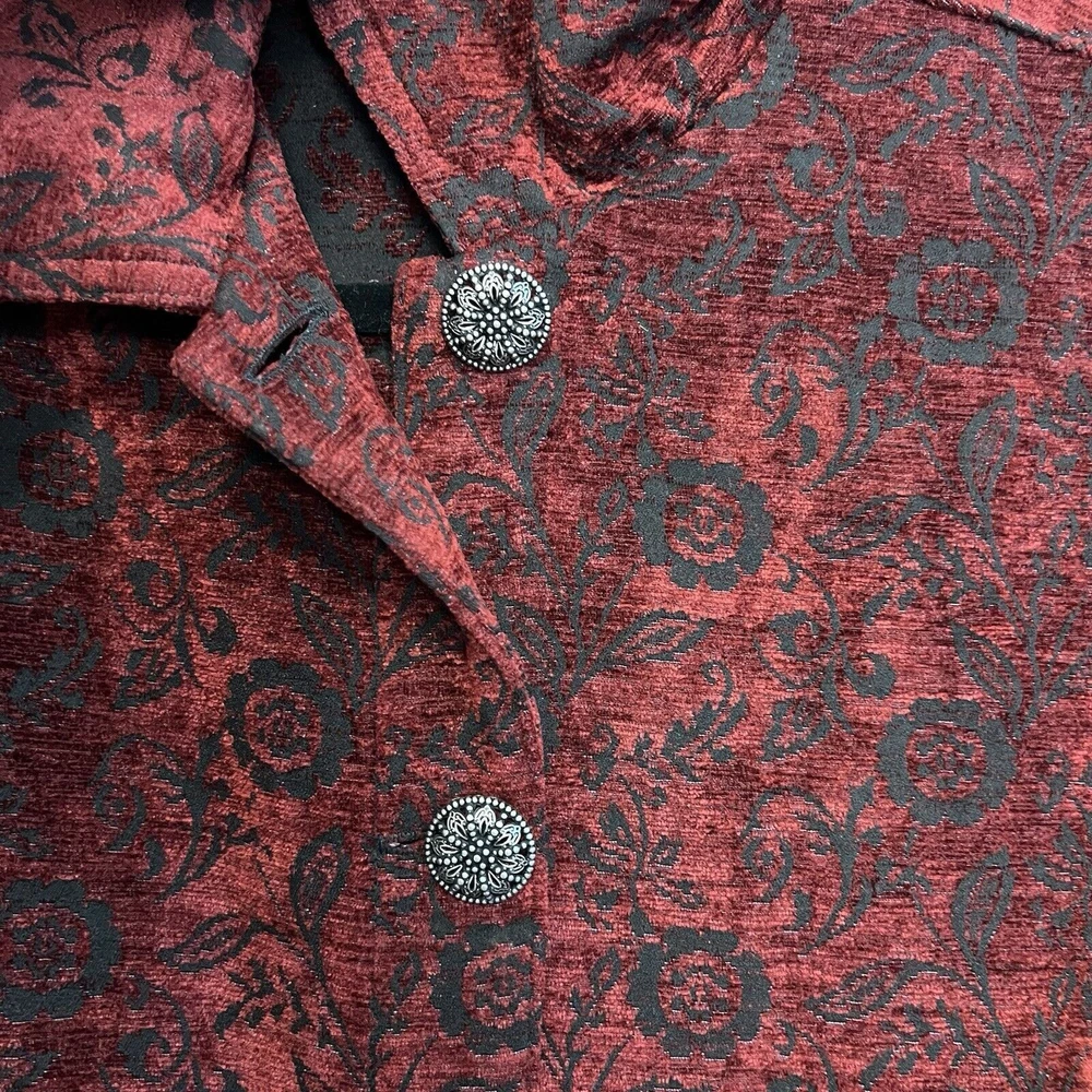Vintage Touch of Blue floral tapestry button-up jacket - women's size Medium. Deep red and black floral long sleeve. Semi-cropped boxy cut. Beautiful silver floral buttons. Made in USA. Made from a blend of acrylic, polyester, and cotton material. Made in the USA. Measurements in photos. Please review as vintage clothing can differ from today's sizes. Good used condition. No holes or stains. There is a light spot of wear on the front edge between 2 of the buttons, shown in photos. Please see the photos for more condition and item details.
