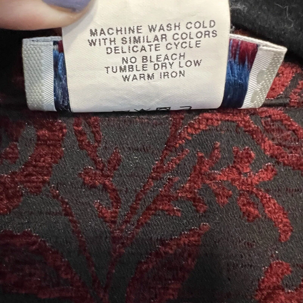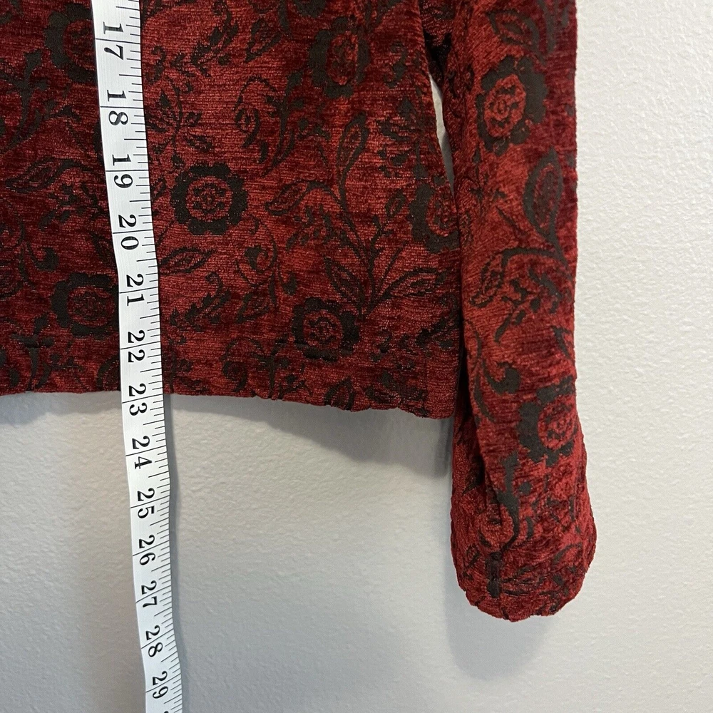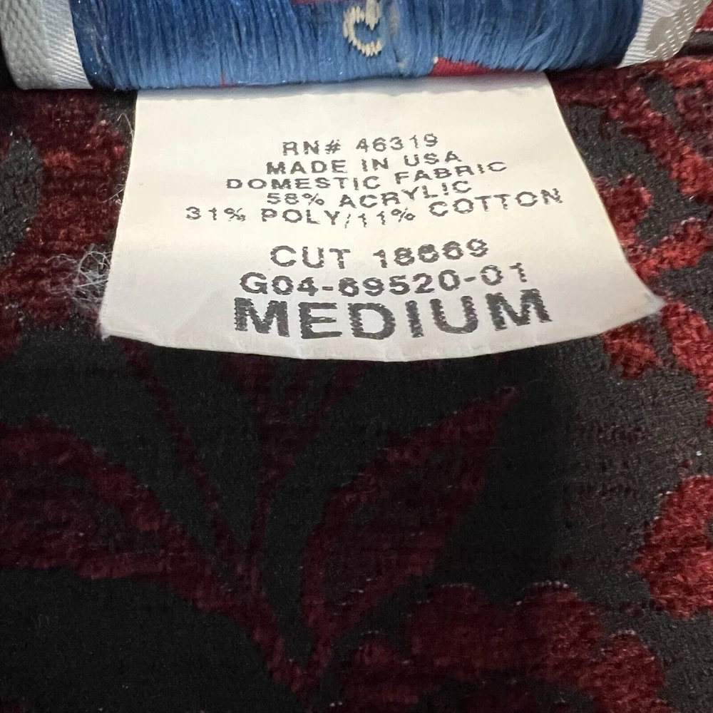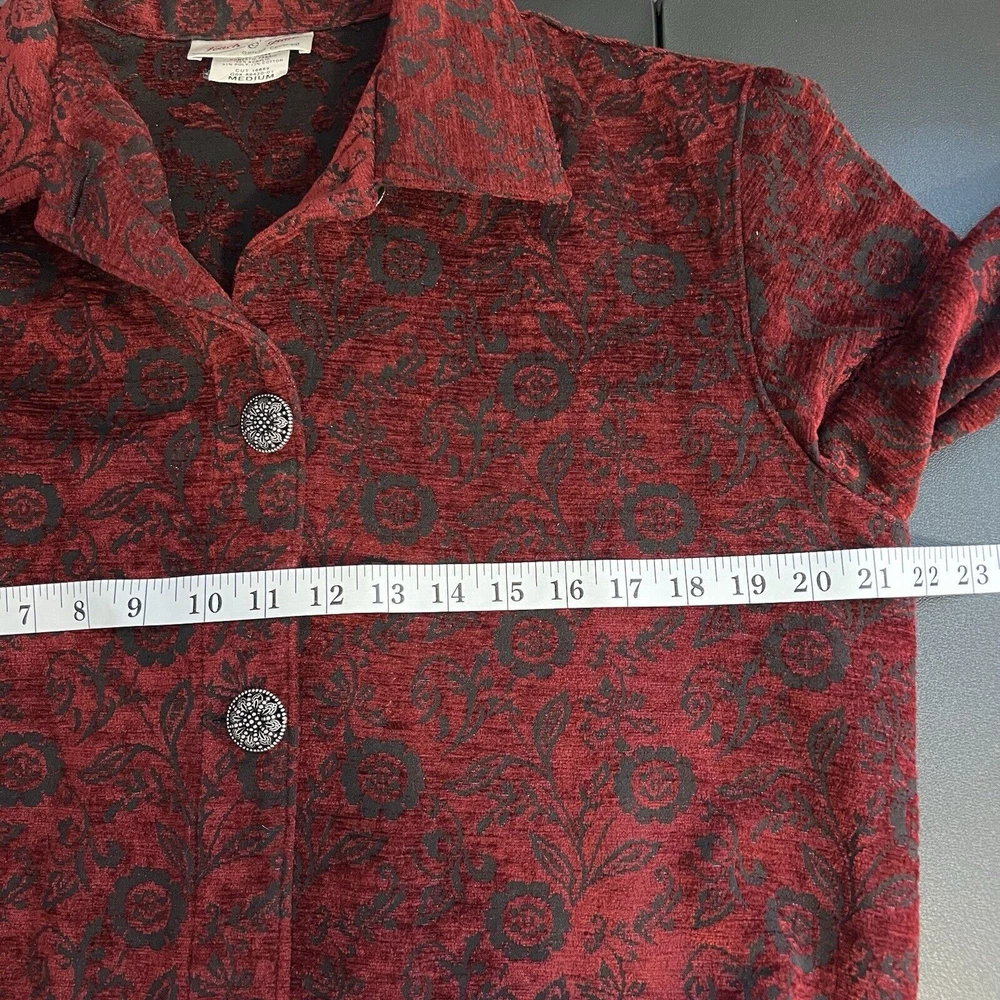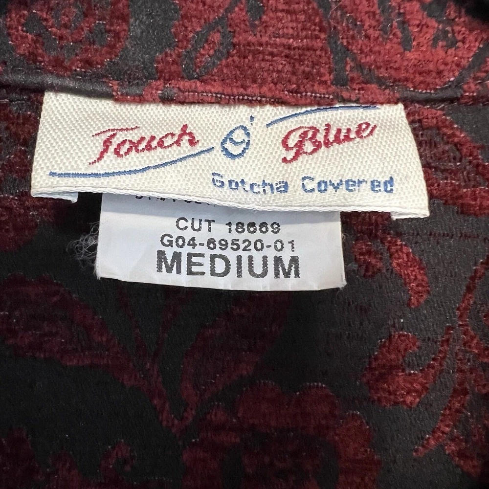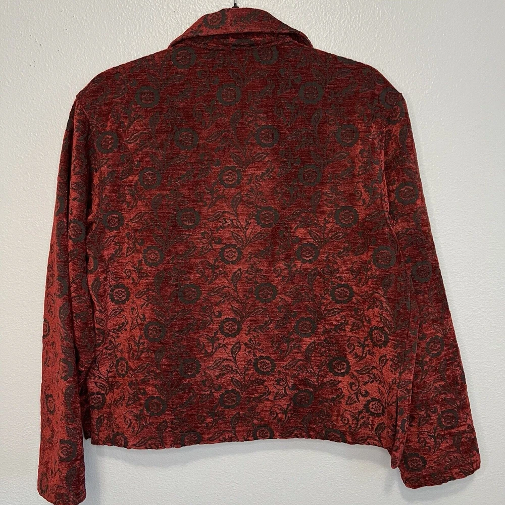 Vintage Touch of Blue floral tapestry button-up jacket - women's size Medium. Deep red and black floral long sleeve. Semi-cropped boxy cut. Beautiful silver floral buttons. Made in USA. Made from a blend of acrylic, polyester, and cotton material. Made in the USA. Measurements in photos. Please review as vintage clothing can differ from today's sizes. Good used condition. No holes or stains. There is a light spot of wear on the front edge between 2 of the buttons, shown in photos. Please see the photos for more condition and item details.