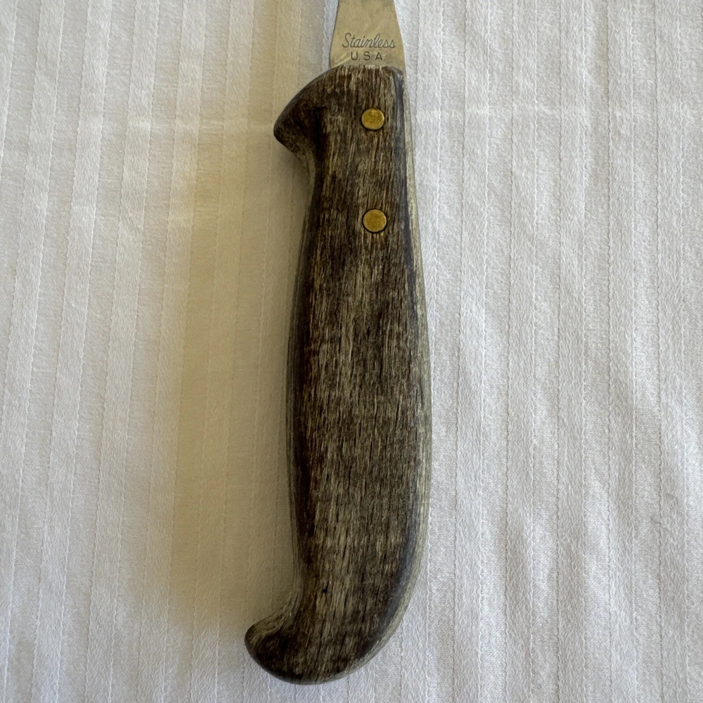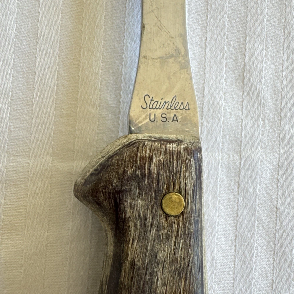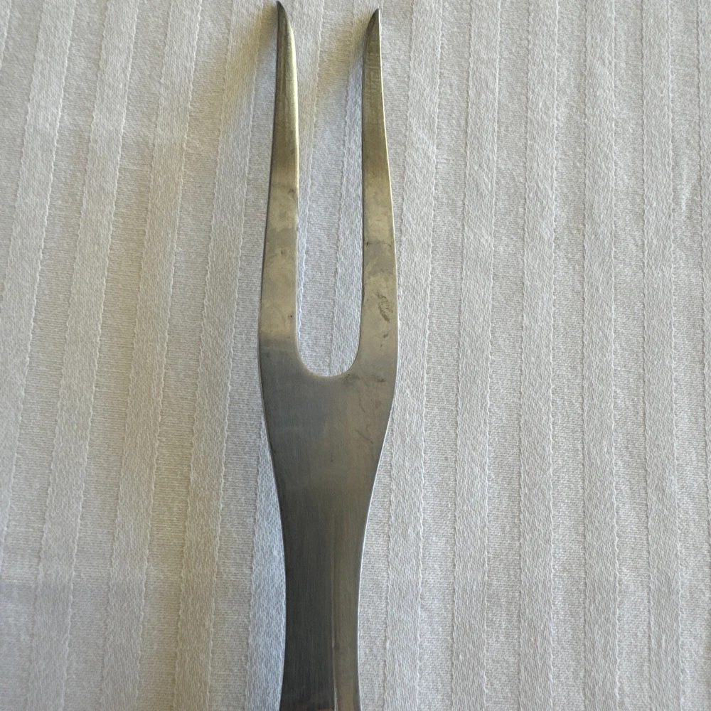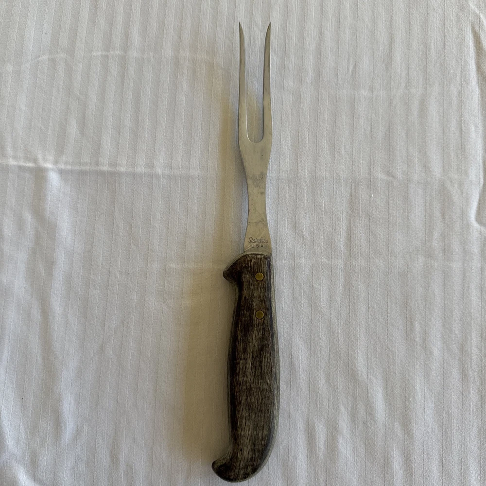 This vintage USA meat carving fork is a high-quality addition to any kitchen. The fork has a stainless steel construction with a matte finish and a wooden grain handle pattern. Measuring at 9.25 inches in length, it is perfect for carving meats and other foods. The Selig Meat Fork model is an original piece from the 1980s with no custom bundles. It is dishwasher safe and comes with a two-prong fork design. The fork is perfect for all occasions and does not have any California Prop 65 warnings. Add this unique and durable meat fork to your collection today!