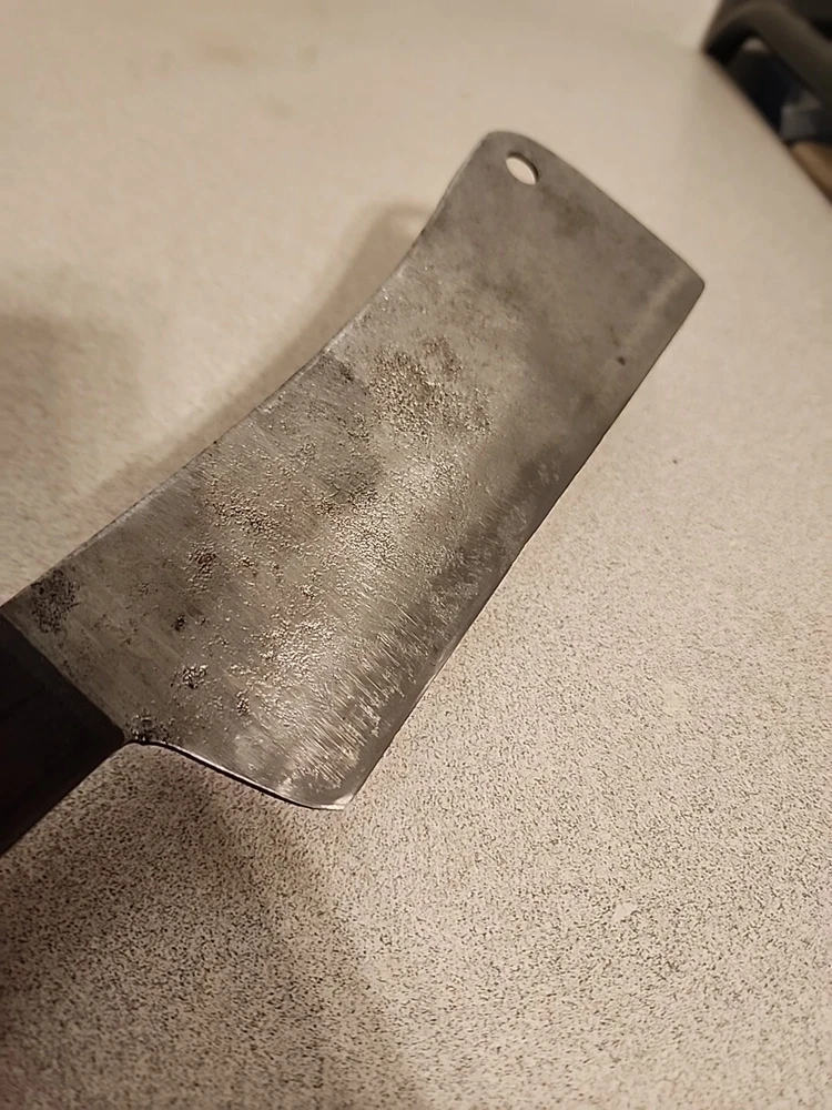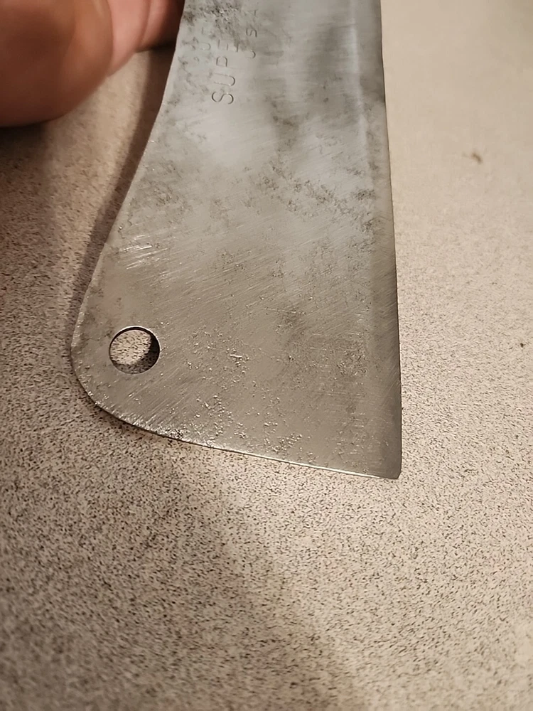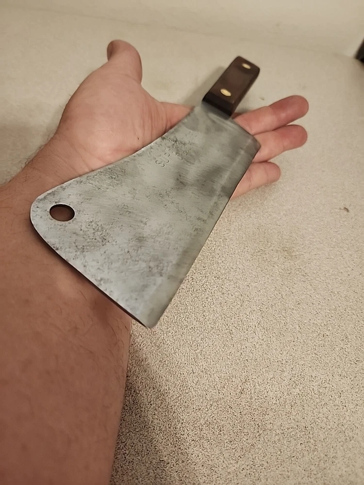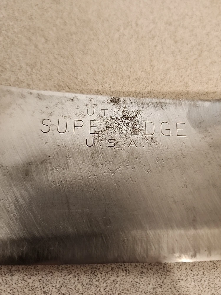 Vintage UTICA SUPER EDGE U.S.A 7" Carbon Steel Meat Cleaver Knife. Shows normal signs of age and previous use including pitting to the carbon steel. Overall in good solid condition and should make someone a nice true vintage quality user grade Cleaver to add to their kitchen cutlery arsenal. You will receive exactly what is pictured. Thank you!