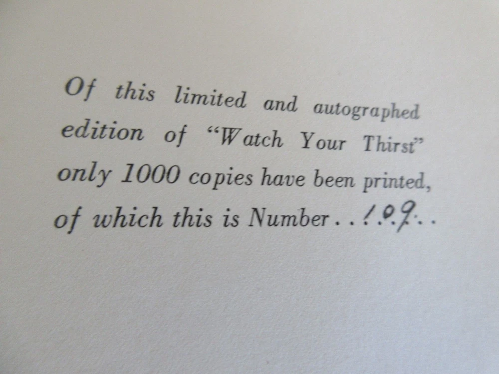WATCH YOUR THRIST SIGNED BY OWEN WISTER 1923 1st ED 109/1000 Thank you for viewing our auction. Excellent Item to add to your collection. Here is your chance to increase your book collection with a book titled WATCH YOUR THRIST SIGNED BY OWEN WISTER 1923 1st ED 109/1000 . This is the item you will be receiving. The book is approximately 11 inches by 8 1/4 inches. Please let me know if you have any questions. Happy Bidding Joe # 26369