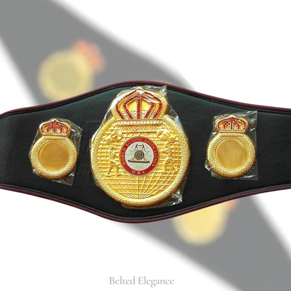 WBA World Boxing Champion Belt – Adult Replica Championship WBA World Boxing Champion Belt – Adult Replica Championship | Metal Plated Gold Finish Brand New | Adult Size | Metal & Gold Plated | Genuine Leather | 1-Year Warranty Overview The WBA World Boxing Champion Belt represents prestige, power, and craftsmanship. This high-quality adult-size replica is built with premium materials and intricate detail, making it ideal for collectors, fans, and professionals alike. The metallic plates shine brilliantly under light, displaying the true essence of championship glory. Product Description A high-quality WBA (World Boxing Association) boxing belt stands out with its exceptional design and durability. Crafted with premium-grade leather, it maintains both robustness and flexibility even after prolonged use. The belt’s thick padding and smooth finish provide comfort and a championship feel when worn. The central WBA emblem is made from solid metal, finished in gold plating for a luxurious shine. Fine engravings on the globe, laurels, and wreaths showcase superior craftsmanship. The side plates, engraved with traditional WBA motifs, are gold-plated and fastened securely to ensure long-term durability and resistance to tarnish. Each belt also features a soft padded backing and neat double stitching along the seams for added comfort and endurance. It’s not just a display piece — it’s built like the real deal. Specifications • Material: Synthetic Leather • Strap Material: 100% Leather, 3mm Thick • Plate Material: Metal with Gold Plating • Side Plates: Metal with Gold Plating • Weight: Approx. 2700g • Warranty: 1 Year • Size: Adjustable Adult Size Craftsmanship & Detail Each WBA belt is handcrafted with precision, ensuring every metal plate and leather layer aligns perfectly. The surface is polished to a mirror finish, enhancing the metallic reflection. With chrome and gold tones combined, it gives an authentic look worthy of a world champion. Quality Assurance Belted Elegance ensures the highest standards of craftsmanship. Every belt passes multiple quality checks before packaging. We take pride in offering belts that match international standards for both visual beauty and build integrity. Returns & Warranty All our belts come with a 1-year warranty on leather and craftsmanship. Returns are accepted within 14 days of purchase if the item remains unused and in original packaging. Customer satisfaction is always our priority. Manufacturer Information Belted Elegance is the manufacturer of all types of championship and leather belts including WBA, WBC, WBO, IBF, and custom designs. We specialize in handcrafted products using premium materials and ensure long-lasting quality. Wholesale & Custom Orders We welcome bulk and wholesale buyers. Custom logos, names, and sizes can be made on request. Contact us for special pricing and production timelines for event or store orders. Final Note Celebrate your passion for boxing with the WBA World Boxing Champion Belt . A perfect blend of metal artistry and leather craftsmanship, this belt is a must-have for champions, collectors, and boxing enthusiasts worldwide. Experience the unmatched beauty and power of a true title belt from Belted Elegance .