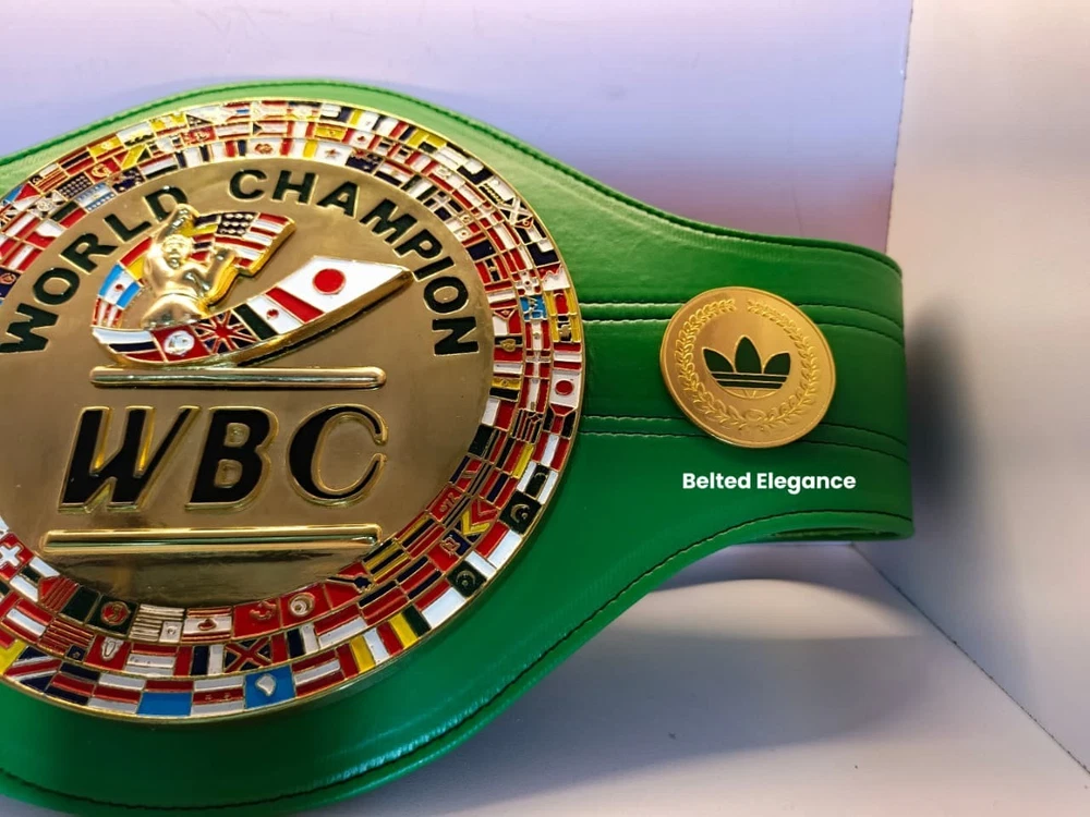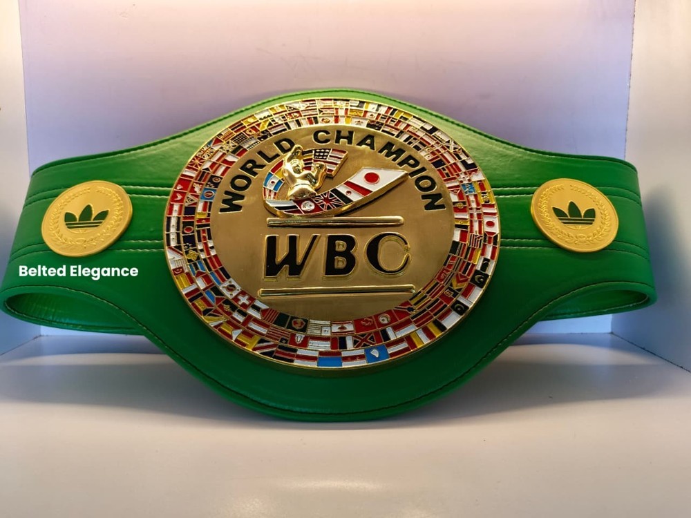 Belted Elegance — WBC World Championship Replica (Adidas Side Plates) Belted Elegance — WBC World Championship Replica (Adidas Side Plates) Premium Gold & Green Theme Replica Belt — Adult Size PRODUCT DETAILS WBC World Championship Boxing Belt – Premium Replica Bring home the glory of champions with this high-quality WBC replica belt. Inspired by the original World Boxing Council design, this handcrafted replica celebrates the history and prestige of boxing. Perfect for collectors, gym display, events, and gifting. PREMIUM FEATURES & DETAILS Stunning 3D gold finish main plate with raised detailing for a true championship look (approx. 9" H × 9" W). Authentic golden buckle closure with WBC mark. 4 closure holes for adjustable fit. Strap made from top-grade synthetic leather — made in Pakistan (adult size; total length approx. 48" ; strap width approx. 4.2"). Side plates (2 plates) featuring Adidas-style logo plates for a clean, iconic look (approx. 2.5" H × 2.5" W each). Colorful international flags on central plate symbolizing unity in boxing worldwide. Perfect for display, events, boxing gyms, and collectors. MEASUREMENTS Total length (end to end): 48 inches Central plate — Height × Width: Approx. 9" × 9" Strap width: 4.2 inches Side plates — Height × Width (each): Approx. 2.5" × 2.5" Buckle: Golden with WBC mark, 4 closure holes, reinforced stitching and golden surround. DELIVERY & HANDCRAFTING Each belt is freshly crafted and carefully checked. Delivery may take up to 2 weeks due to meticulous handmade preparation for every order. CARE INSTRUCTIONS Wipe with a soft, dry cloth. Avoid water. Condition quarterly with a leather conditioner. Store flat or on a hanger; avoid direct sunlight. WARRANTY & RETURNS We offer a 12-month limited warranty against manufacturing defects. Returns accepted within 30 days in original condition. For custom or personalised items, please contact us first. IMPORTANT NOTE This is a high-quality replica belt made for collectors, display, and sporting events. It is not an officially licensed WBC product. Replace any logo images only if you own the rights.