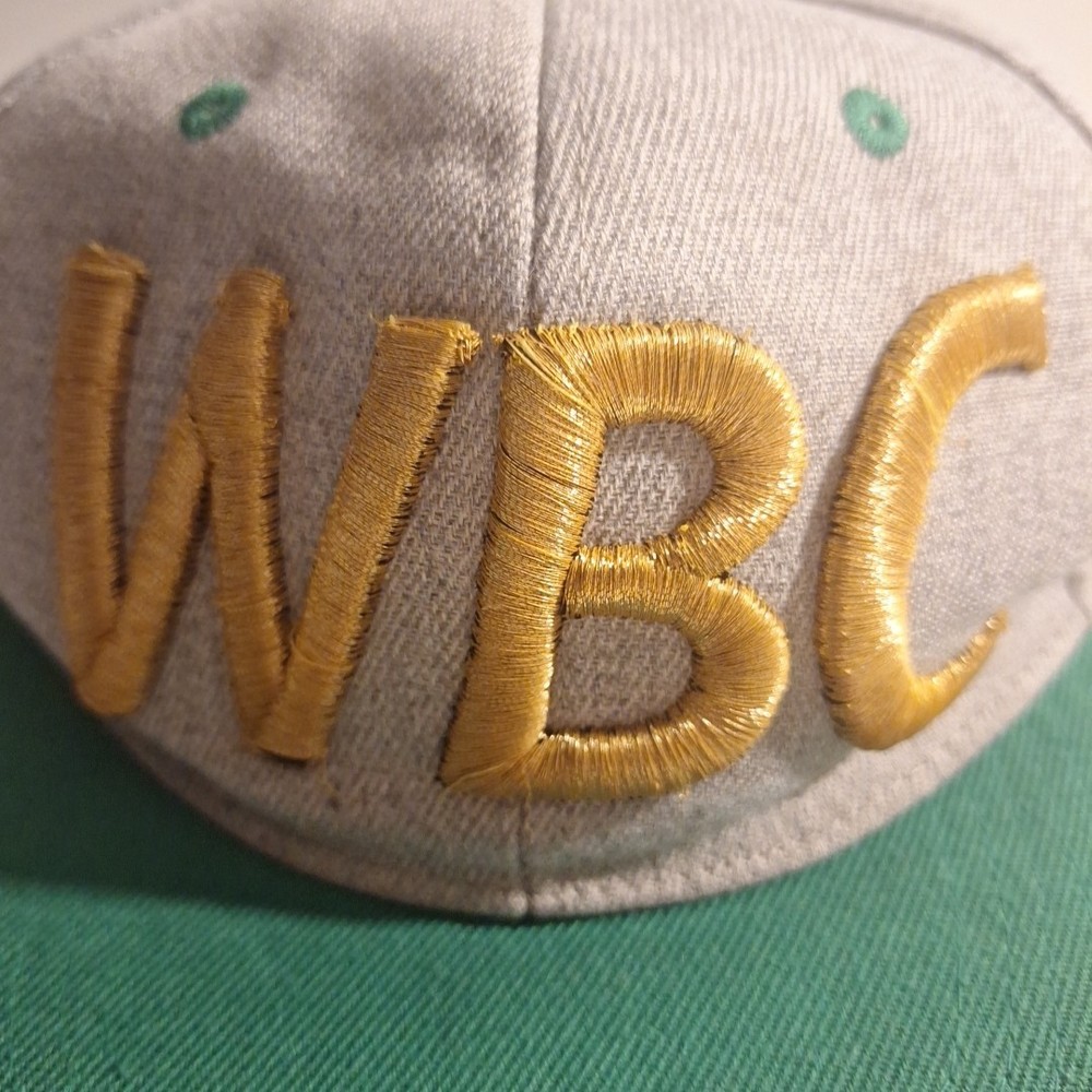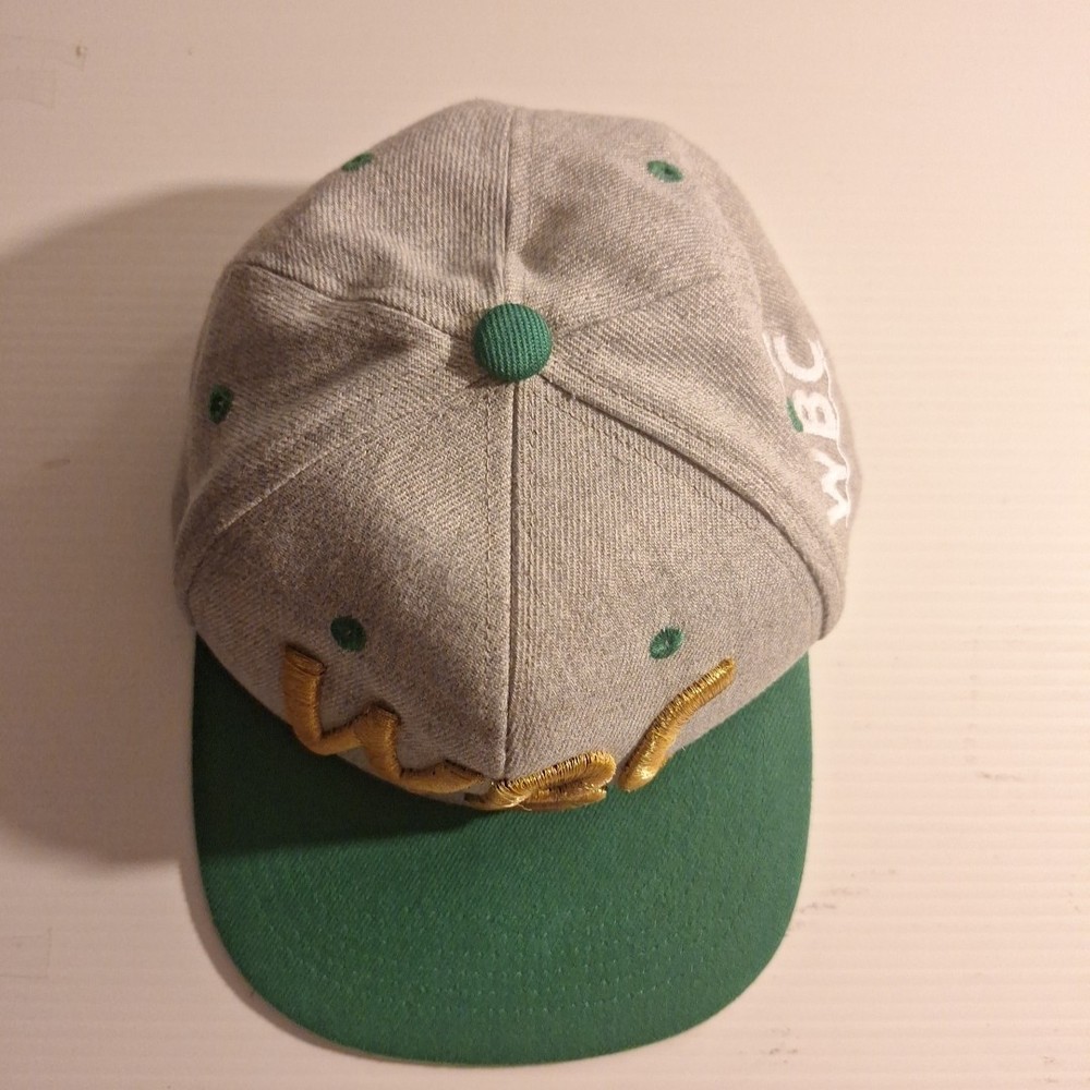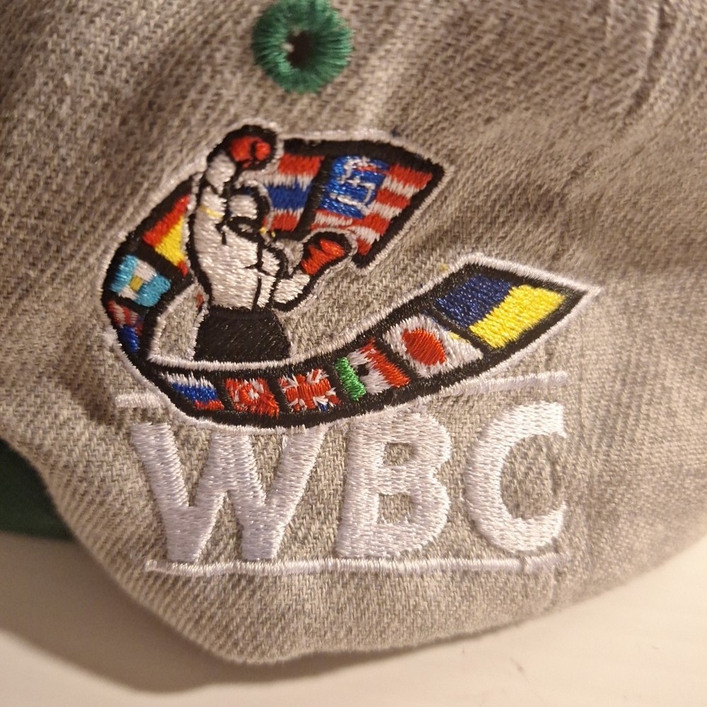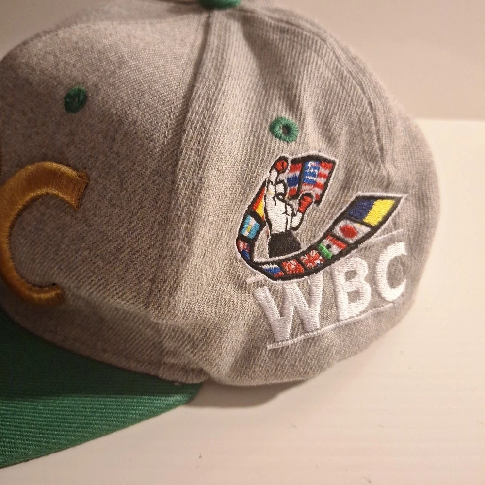 The WBC Embroidered Snapback Hat is an officially licensed product representing the World Boxing Championship. Featuring the iconic WBC logo, this hat is designed for fans of boxing and showcases the colors of green, grey, and gold. The snapback design and one-size-fits-all construction make it suitable for both men and women, making it a versatile and stylish accessory for any boxing enthusiast's collection. Pat is used and has a little bit of wear. Could use a steam cleaning to smooth out any wrinkles in the crown. Tag is missing. Embroidery is in "good condition". Please see pictures for further detail.