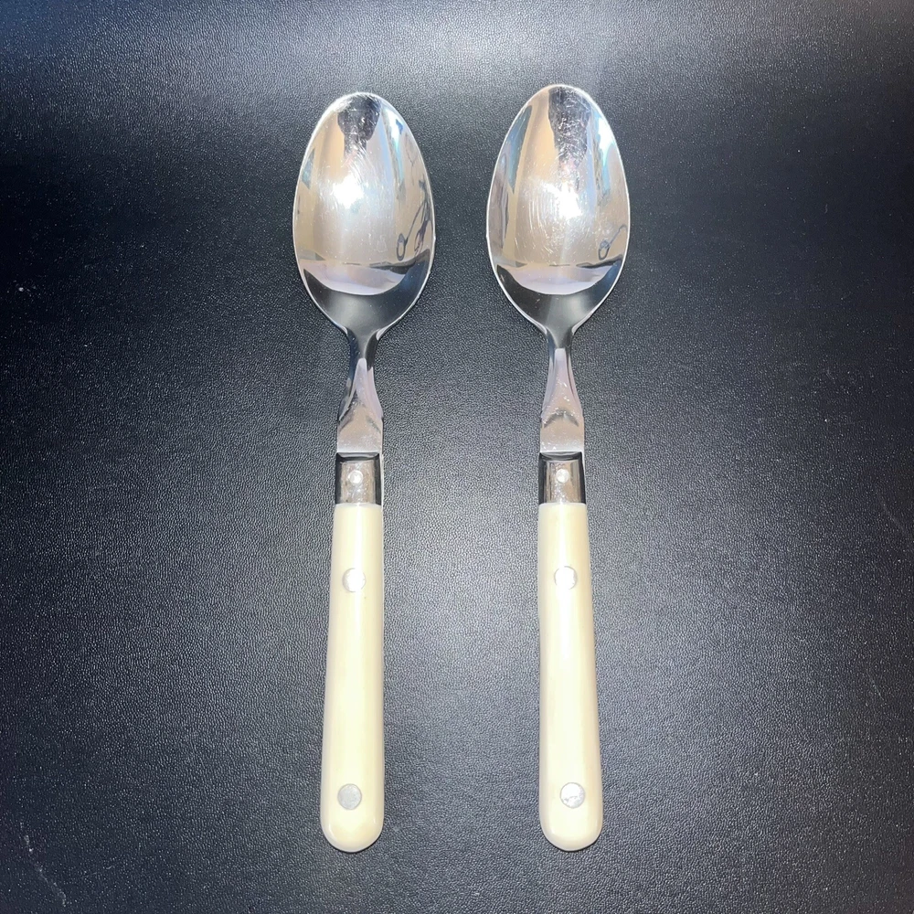 WF Mardi Gras Stainless White Ivory Plastic Handle Washington Forge Tablespoons Set of 2. Handles are discolored - cream or pinkish tone. There is a smudg from use on one spoon. See photo.