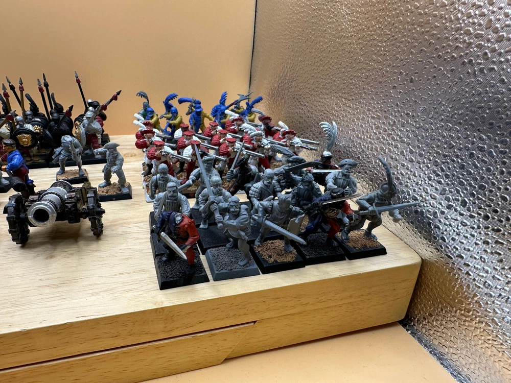WFB Old World Warhammer Empire Starter Army Games Workshop OOP GW Reiksguard 1 x Mounted Standard 1 x Mounted Captain 1 x Mounted Wizard (Converted Balthasar Gelt) 2 x Great Cannon & 6 Crew (Need Parts) 10 x Reiksguard Knights 15 x Swordsmen 10 x Handgunners 16 x Spearmen 10 x Halbediers (Need Parts) (Some items may need TLC/Parts; See Photos)