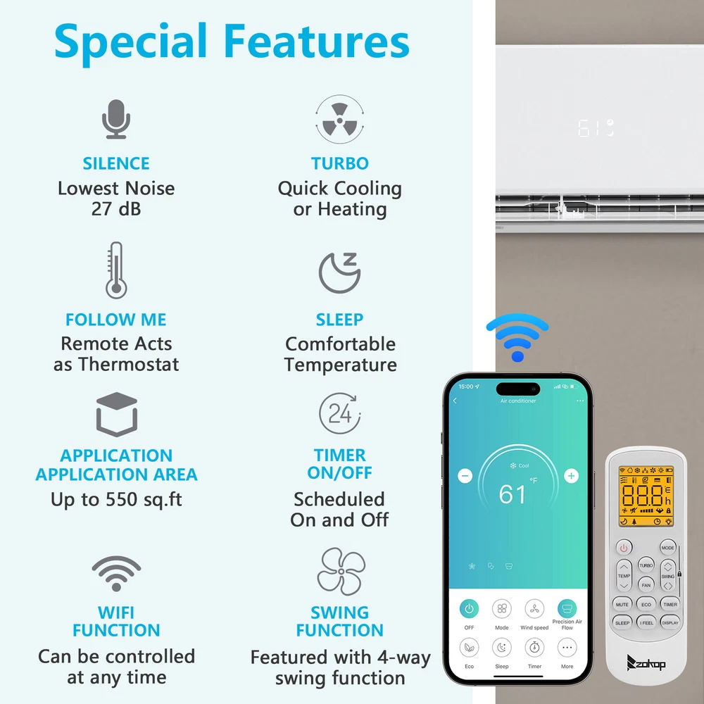 listing template VISIT OUR STORE SIGH UP FOR EMAIL WIFI 18000 BTU Ductless Dual Zone Mini Split Air Conditioner & Heat Pump 19 SEER ZOKOP Dual 2 Zone Ductless Mini Split Air Conditioner Heat Pump System, 19 SEER2 Ductless AC with 2 Indoor Air Handlers, 1 Outdoor Condenser, 25ft Installation Kit (12K+12K) Introductions : ZOKOP smart Split Type Type Inverter Air Conditioners with heating function are made with high quality compressor, high speed pure copper motor & inner spiral copper tube which are powerful to quickly cool down / warm your home, office, garage or apartment for maximum comfort in quiet operation, perfect appliance in hot Summer or cold Winter. Comparing with others, machine featured with high SEER grade, which means that it is more energy efficient and much money saving! This unit also has Sleep, Turbo, ECO, Mute and Timer functions. These functions help you enjoy the true individual comfort. Let the ZOKOP Mini Split Air Conditioner 2-Zone be the solution to your home's heating and cooling needs. Features: [MULTIPLE ROOMS] Comes with 2 indoor air handlers 12,000 BTU + 12,000 BTU with separate controller for individual rooms and 1 outdoor condenser. Enjoy individual temperature controls in each room for ideal climate control. This unit provides cooling and heating for up to 1100Sq. Ft ( eachindoor unit recommended area 550 Sq. Ft-) and able to work in environments as low as 5 degrees Fahrenheit. 2 pcs 24.6ft copper pipes (Standard size 1/4" & 3/8" outer dimension) and 2 installation kits included. The length for drain pipe is 78.7". Featured with Cooling, Heating, Dehumidifying and Fan only modes in one compact unit. It is ideal for using in home's bedroom, living roo, kitchen, office, apartment, garage and so on. [Energy Saving] ZOKOP the speed of the air conditioner equipped with frequency converter directly affects the service efficiency of the air conditioner. The frequency converter is a control system used to control & adjust the speed of the compressor to make it always in the best speed state, so as to improve the energy efficiency ratio (at least 30% more energy-saving than the conventional air conditioner). This 19 SEER2, 12000BTU+12000BRU, 208/230V~60Hz, AHRI Certified AC unit with a heat pump(up to 5℉/-15℃) is featured high quality compressor for more efficient cooling and longer working life; Higher SEER grade & Eco-friendly design which leads you for money saving ( please confirm voltage before making purchase) . [Quiet Cooler & Heater] Ultra Silent at only 27-42 dB(A) and beautifully built adds a touch of elegant charm to your room.In sleeping & mute mode, It's able to maintain the temperature while you are sleeping. And you can use the 24-hour timer in combination to free you from additional worries. Featured with 4-way swing function, unit provides scientific airflow in your room to suit your comforts in just a few minutes.Best choice to decorate your home. [Smart Operation] Operating this conditioner is an easy-understanding and enjoyable cooling experience (61-88degree Fahrenheit ). We can set all functions on remote control (Fan Speed Selection, Sleep Mode, 24 Hour Timer, ECO Mode, Turbo Mode, and Mute Mode). Built-in microprocessor chip & sensor in the remote controller makes it more convenient to operate the air conditioner from a distance. Digital LED display controls offer precise temperature adjustments and the remote control lets you control the air conditioner from across the room. [Washable Air Filter] This indoor AC machine comes with a permanently washable and easy cleaning air filter. Keep your air conditioner running more efficiently by cleaning the filter once a month. Specifications : 2*I ndoo r Unit : 1. Color: White 2. Power Supply: 208/230V, 60Hz 3. Cooling : Rated Capacity: 12000Btu/h Rated SEER2: 19Btu/W.h Rated EER2: 10Btu/W.h 4. Heating: Rated Capacity: 12200Btu/h HSPF2 Rating (Region IV): 8.5Btu/W.h 5. Operation temperature: (16~31)degree Celsius/(61~88)degree Fahrenheit 6. Use the air conditioner in the following temperature conditions: Indoor(cooling/heating): 17 ~32degree Celsius(63 ~90degree Fahrenheit)/0 ~27degree Celsius(32 ~80degree Fahrenheit) Outdoor(cooling/heating): 15 ~55degree Celsius(59 ~131degree Fahrenheit)/-15 ~24degree Celsius(5 ~75 degree Fahrenheit) 7. Moisture removal: 1.6L/h 8. Indoor air circulation/Hi : 650m³/h 9. Indoor noise level at cooling(Turbo/High/Med./Low/Mute): 42/39/34/29/27dB(A) 10. Application Area: Up to 550 sq.ft 11. Certificate : AHRI, ETL 12. Indoor Dimensions: 81.1x29.2x20.5cm(31.9x11.5x8.1inch) 13. Indoor Package dimensions: 88.5x36.6x27.8cm(34.8x14.4x10.9inch) 14. Indoor Net weight: 9.5kg/20.9Ibs 15. Indoor Gross weight: 12.7kg/28Ibs 1* Outdoor Unit: 1. Cooling Capacity: 18000BTU/h 2. Heating Capacity: 20000BTU/h 3. SEER2: 20.0BTU/h.W 4. Rated Voltage: 208/230V~60Hz 5. Refrigerant type: R410A/1850g/65.3ozs 6. Outdoor Dimensions: 84.5×38×69.9cm(33.27x14.97x27.5inch) 7. Outdoor Package dimensions: 96×43×75cm(37.79x16.92x29.53inch) 8. Outdoor Net weight: 44kg/97lbs 9. Outdoor Gross weight: 47.5kg/104.7lbs 2*Copper pipes : 1. Connecting Pipe:Gas 3/8''-24.6FT/7.5M Liquid 1/4''-24.6FT/7.5M 2. Signal Cable Length: 24.6FT/7.5M 3. Drain Hose:6.6FT/2M Package Includes : 2* Indoor box includes : 1 x Indoor Unit 1 x Remote Control 1 x Screw Pack 1* Outdoor box includes: 1 x Outdoor Unit 4 x Outdoor feet rubber 2*Copper pipes box includes: 1 x Copper pipes set(24.6FT) 1 x Signal Cable(24.6FT/7.5M) 1 x Drain pipe(6.6FT) 1 x Drain pipe adapter 2 x Sealant 2 x Wall sleeve cover 2 x Pipe tape 1 x Insulation pipe 1 x Wall sleeve You might like this more>> Portable Princess Castle Play House Blue Large Kids Play Tent $23.79 Double Shoe Rack Closet Shelf Storage Organizer $19.49 Oil Painting Easel Sketch Box Portable Folding $57.49 FCH L-Shaped Corner Computer Desk Home Office Desk $109.99 10 Tier Durable Storage Organizer 30 Pair Shoe Tower $18.99 24 Slots PU Leather Wrist Watch Box Display Case Orga