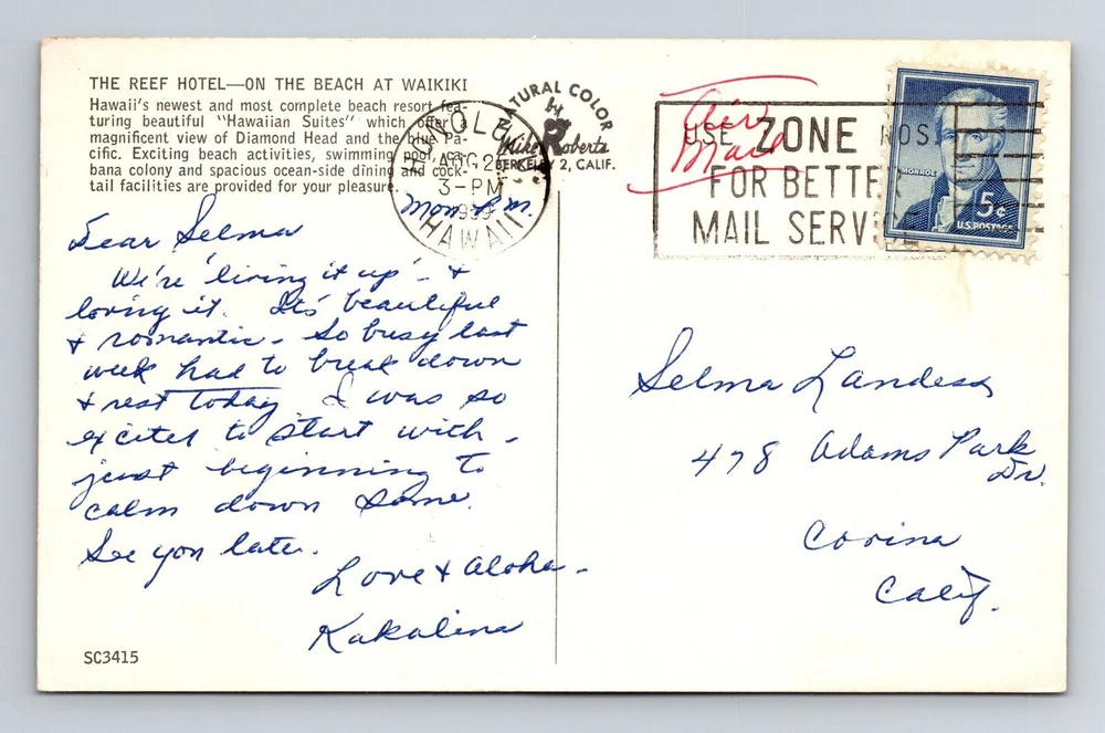 Waikiki HI-Hawaii, The Reef Hotel, On The Beach, Vintage Postcard