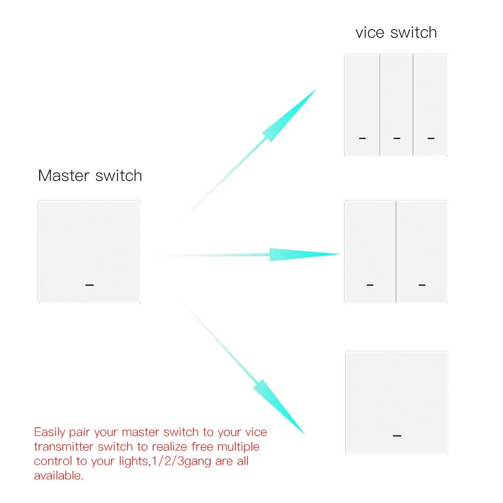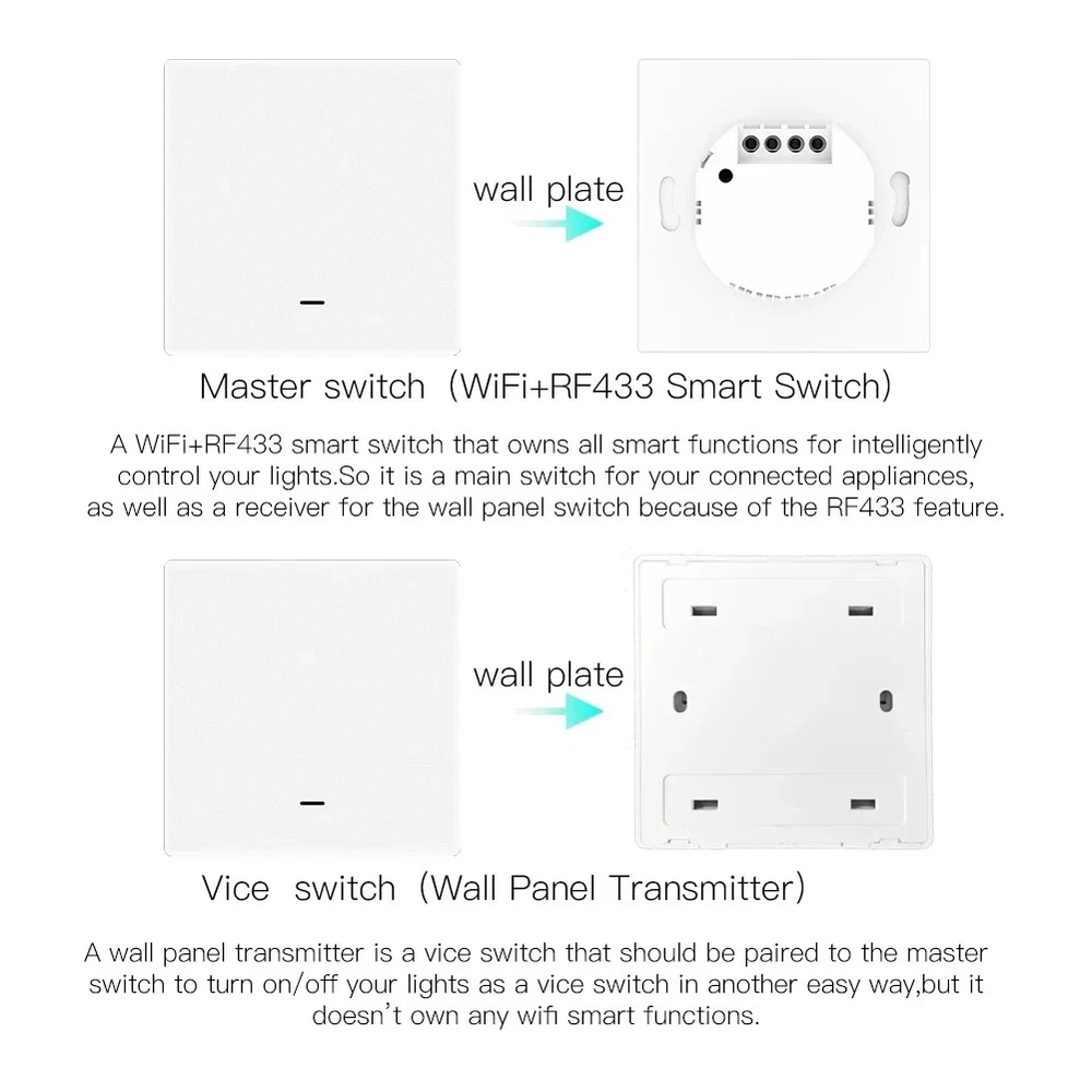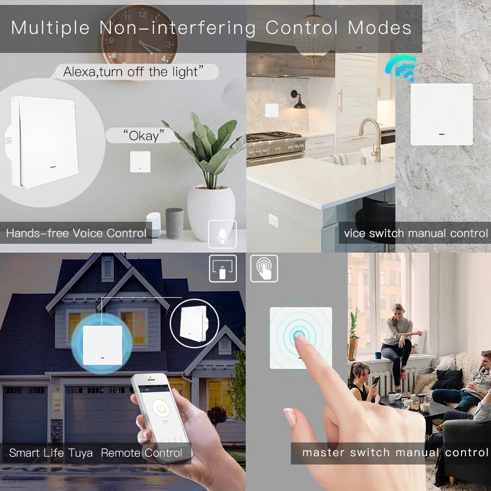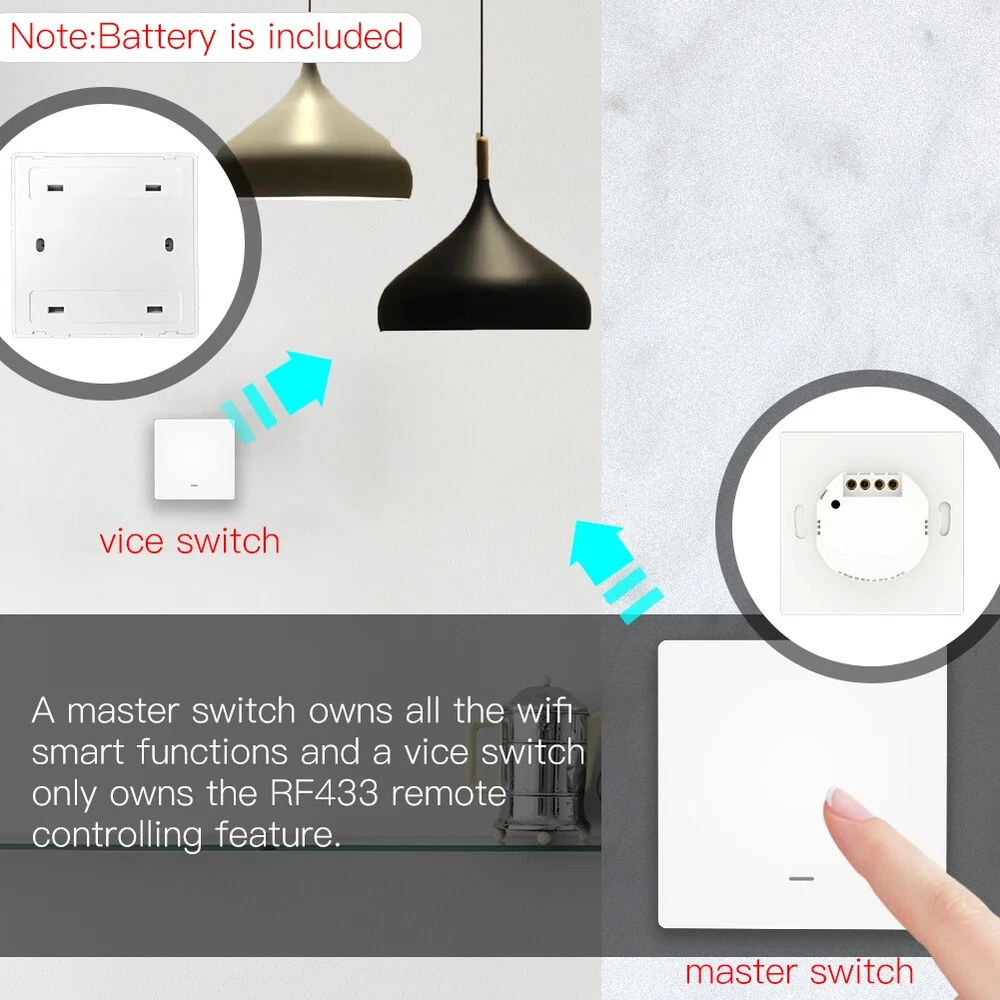 WiFi Push Button Smart Switch 1/2/3 Gang Remote Control Light Switch By Smart life/Tuya App Works with Alexa, Google Home By Moes Product Features: 1.Smart App Remote Control: Conveniently control your lights and the backlight indicator with the free mobile "Smart Life"phone App no matter where you are.(Compatible with Android&iOS.)Also,you may easily share it with your family to control your lights together with Smart App. 2.Hands-FreeVoice Control: Compatible with Amazon Alexa and Google Home for easy voice control when your hands are not free,providing your smart life with much more convenience. 3. Simple Push Button Control: With theslightly changed appearance as a traditional switch,it's just okay for us to simply touch control with our hands as a master switch,which fits for the old so much.Besides,a wall panel transmitter can also work with the switch after finishing the pairing to your switch as a vice switch,achieving double manual control to your switch. 4.Non-interfering Control Mode: Differs in features from traditional common switch,this smart switch is able to be controlled by various ways alone with the best value.Each controlling way is able to work independently,providing a much more convenient and comprehensive control mode to your smart home. 5. Timer Setting: Take full control of your Home&Office lights intelligently with the timer feature on your App,which owns a 5+1+1 day programmable schedule to allow you to plan the exact time in advance to turn lights on or off automatically. Auto on/off feature offers you the countdown option of 1 min/5mins/30mins/1hour etc. Attention: WiFi+RF433 Switch(Master Switch): A WiFi+RF433 smart switch that owns all smart functions for intelligently control your lights.So it is a main switch for your connected appliances,as well as a receiver for the wall panel switch because of the RF433 feature. Wall Panel Transmitter(Vice Switch): A wall panel transmitter is a vice switch that has already been paired to the master switch to turn on/off your lights as an simple switch in another easy way,but it doesn't own any wifi smart functions. Packing Listing: MOES Smart Glass Panel Touch Switch(1Pack) 2*Screws Quick installation guide Features: Programmable Schedules Hands-free Voice Control APP Remote Control Touch Control Wall Panel Transmitter Control Consulting our detailed manual,you can easily install it. Q&A: 1.Q:What about the old who just don't know how to use App to control? A:For the old,as well as the little kids,a wall panel transmitter with the same looking as the switch is optional for them to easily control your switch.Simply pair your switch to the wall panel transmitter. 2.Q:Can I control the switch if I am not at home? A:Yes, you can remotely control your switch and conveniently turn it on/off anywhere,anytime. 3.Q:Can I program the schedule myself? A:Yes,our push button switch is programmable.You are able to program your schedule freely. 4.Q:Does this work with Google Home? A:Yes,it does.And it's also compatible with Alexa. 5.Q:May I use a neutral wire? A:Yes,a neutral wire is required for our switch. 6.Q:Do I need to buy a wall panel to match the switch? A:No,there is no need for you to buy as it's a kit that the switch and the wall panel are combined together.
