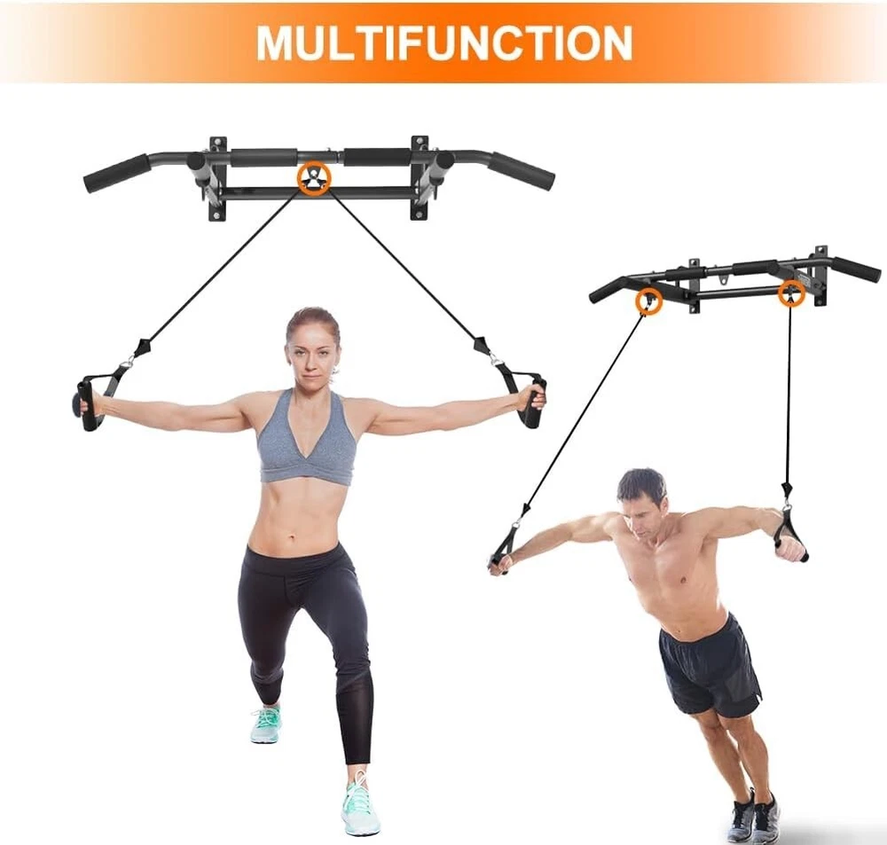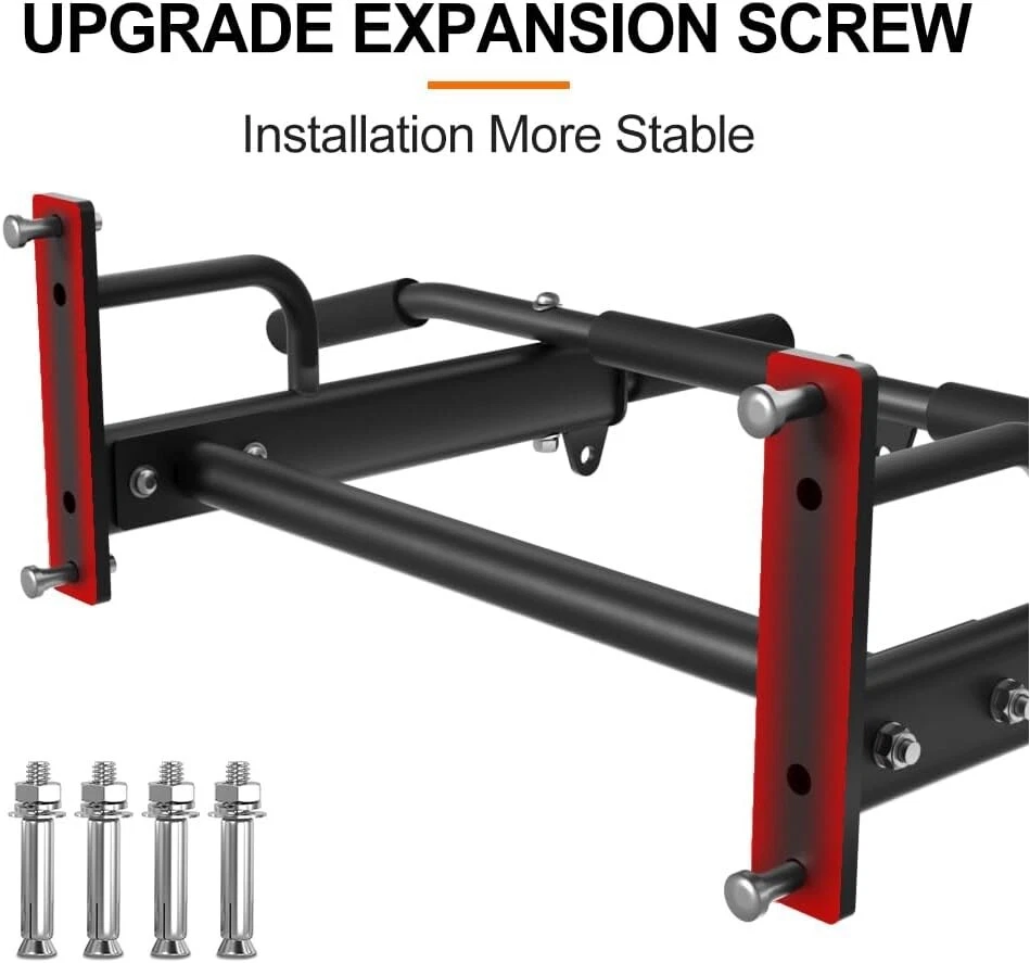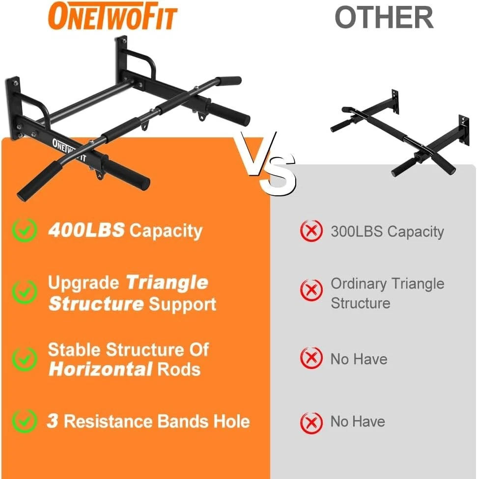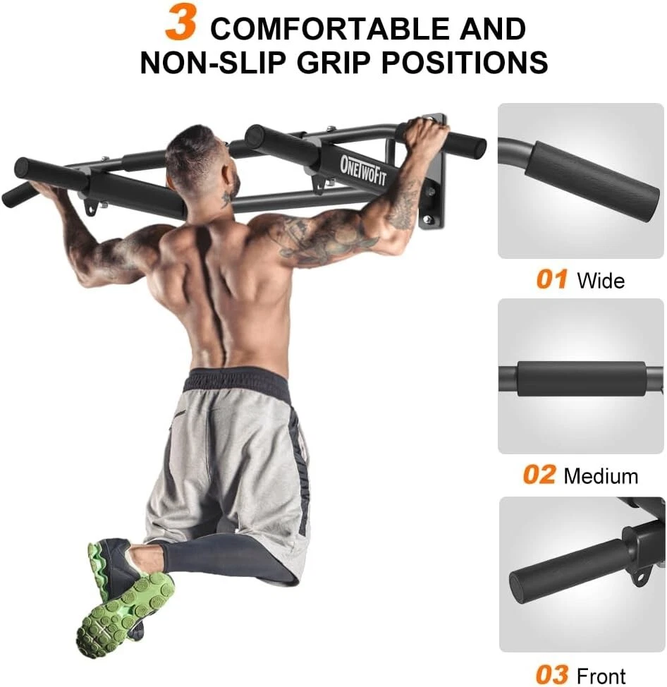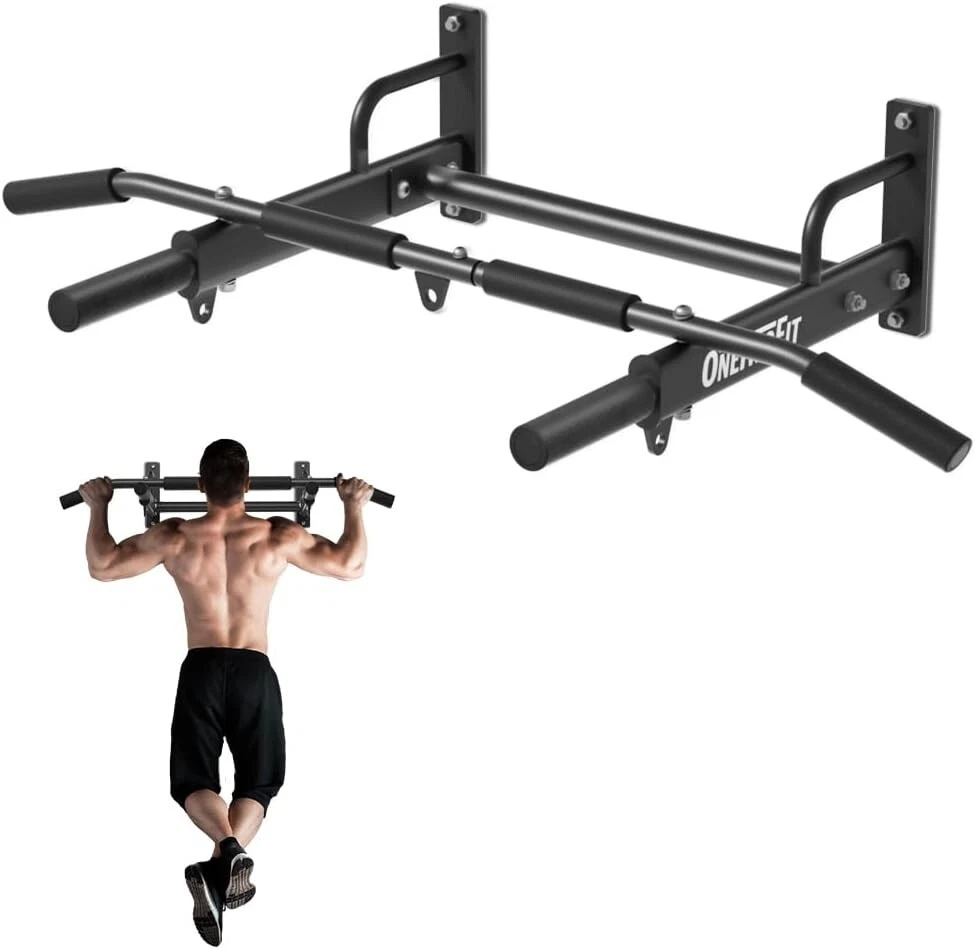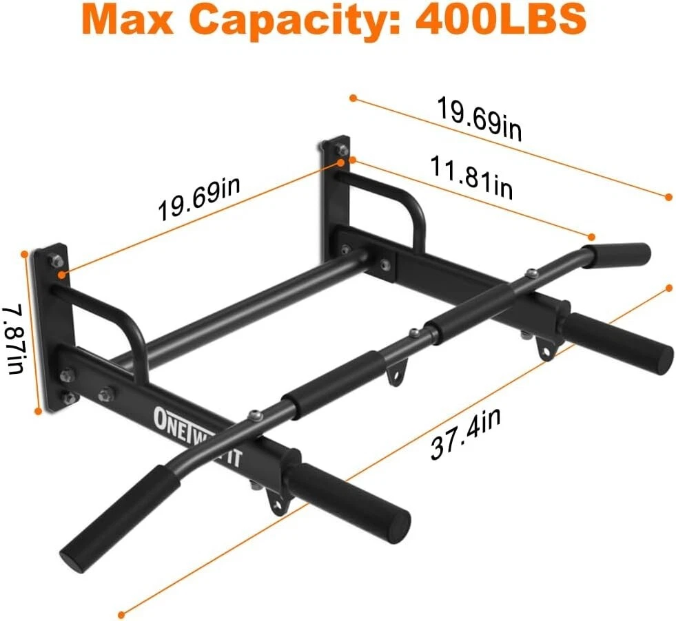 ONETWOFIT Wall Mounted Pull Up Bar, 400 LBS Heavy Duty Chin Up bar Multifunctional Strength Training Wall Mount Pull up Bar Upper Body Workout for Indoor Home Gym About this item WALL MOUNTED REQUIREMENTS - ONETWOFIT wall mount pull up bar should be installed on a brick/concrete/masonry wall. ❌DON'T install on drywall, plaster walls, and cavities. HIGH WEIGHT CAPACITY - Add crossbars and streamlined triangular structural supports, Wall chin up bar can support up to 400LBS, suit exercisers of various sizes and fitness levels. HEAVY DUTY STEEL CONSTRUCTION - Wall mounted pull bar built with 1.7mm thickened steel and the fine powder coating to prevent rust. Comfortable grips help you exercise more relaxing. 3 EYEHOLES AND MUTI-GRIPS - 3 additional eyeholes can be with resistance bands using, stretch your back. Note: can not hold boxing bags. Neutral, wide, and straight grips can target different muscle groups for an upper-body workout. MULTIFUNCTIONAL EXERCISE BAR - As a simple, yet extremely effective exercise equipment, the home bar will help you exercise your upper body. A pull-up bar will help you strengthen mainly your abs, chest muscles, arms, and back.