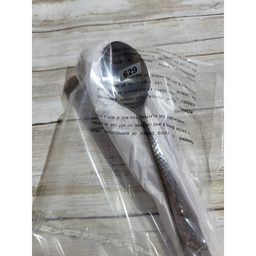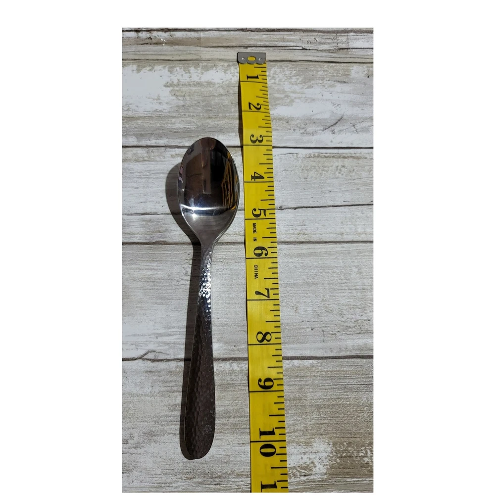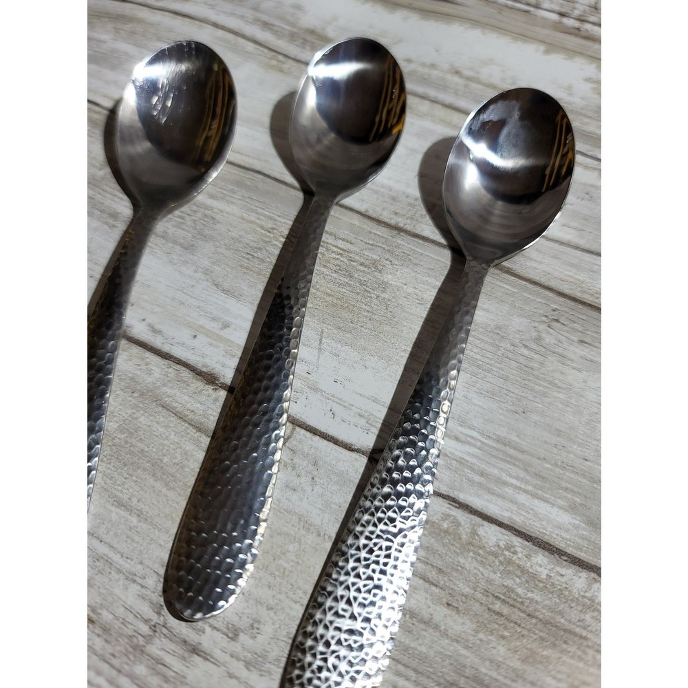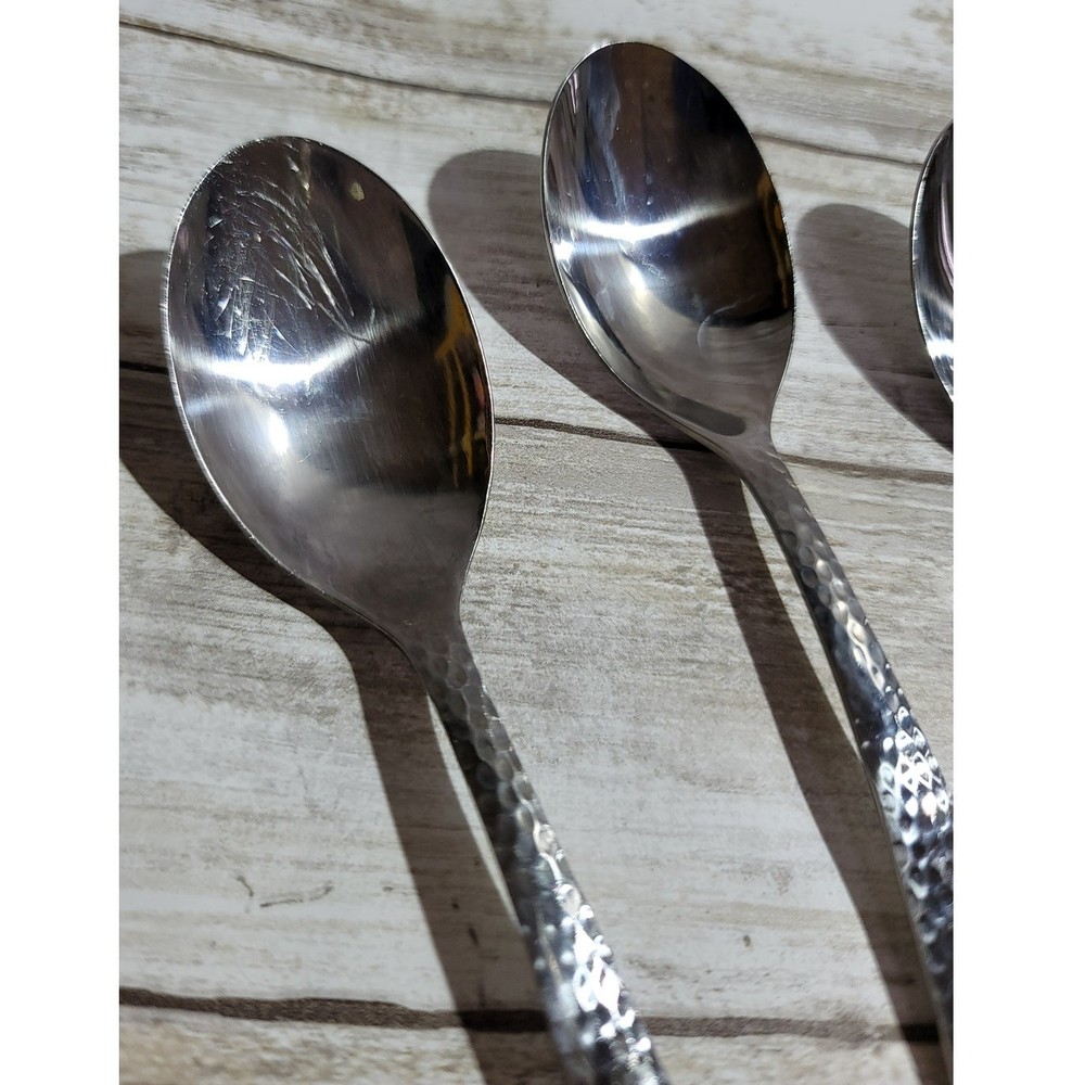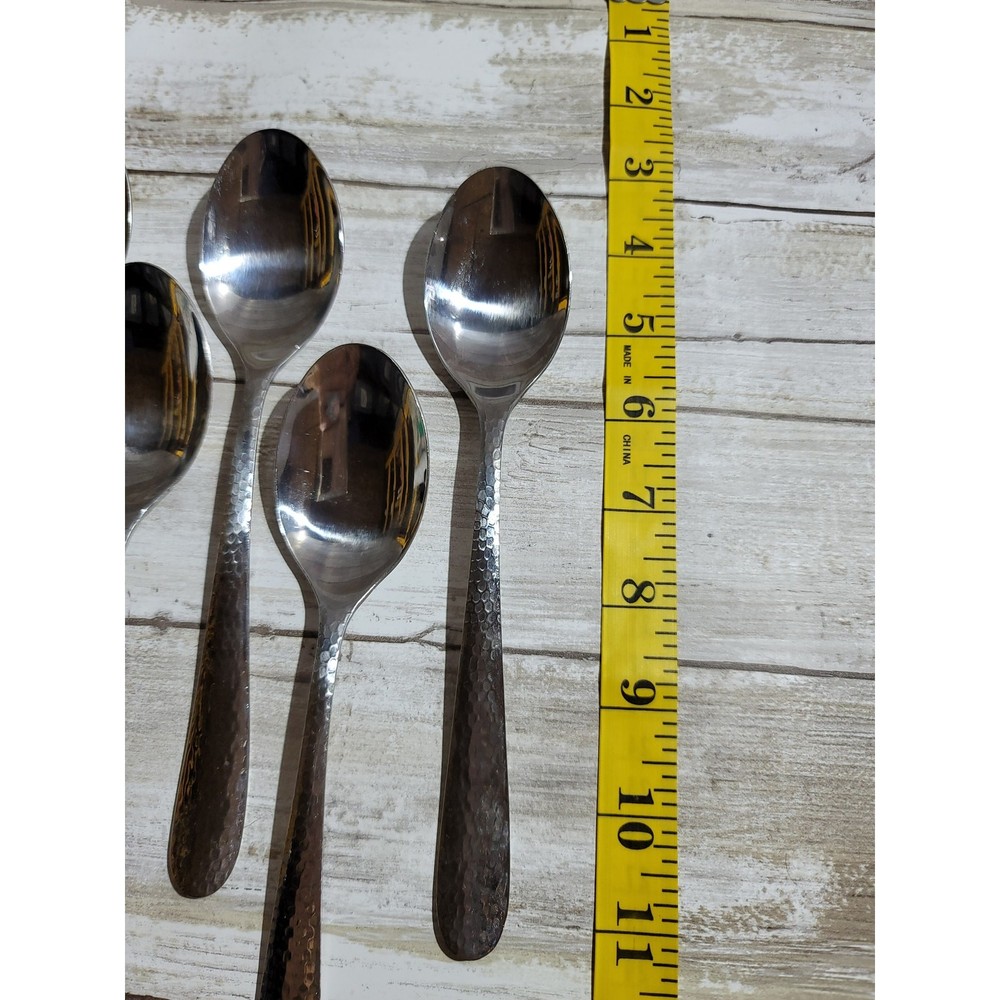 Add a touch of elegance to your dining experience with this set of six Wallace Colonial Hammered stainless steel soup spoons. Each spoon measures 5.25 inches in length and features a beautifully hammered design that adds texture and sophistication to your table setting. Perfect for everyday use or special occasions, these soup spoons are durable, easy to clean, and will complement any flatware collection. Upgrade your dining experience today!