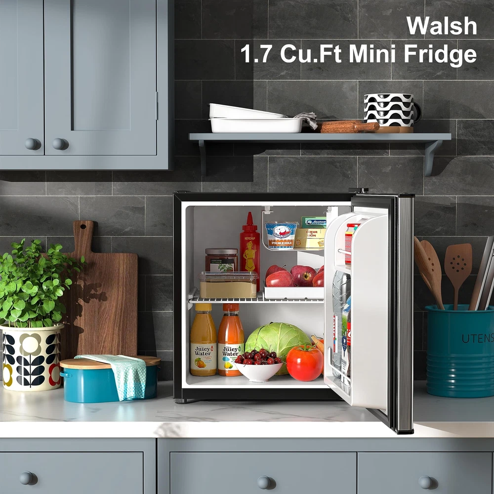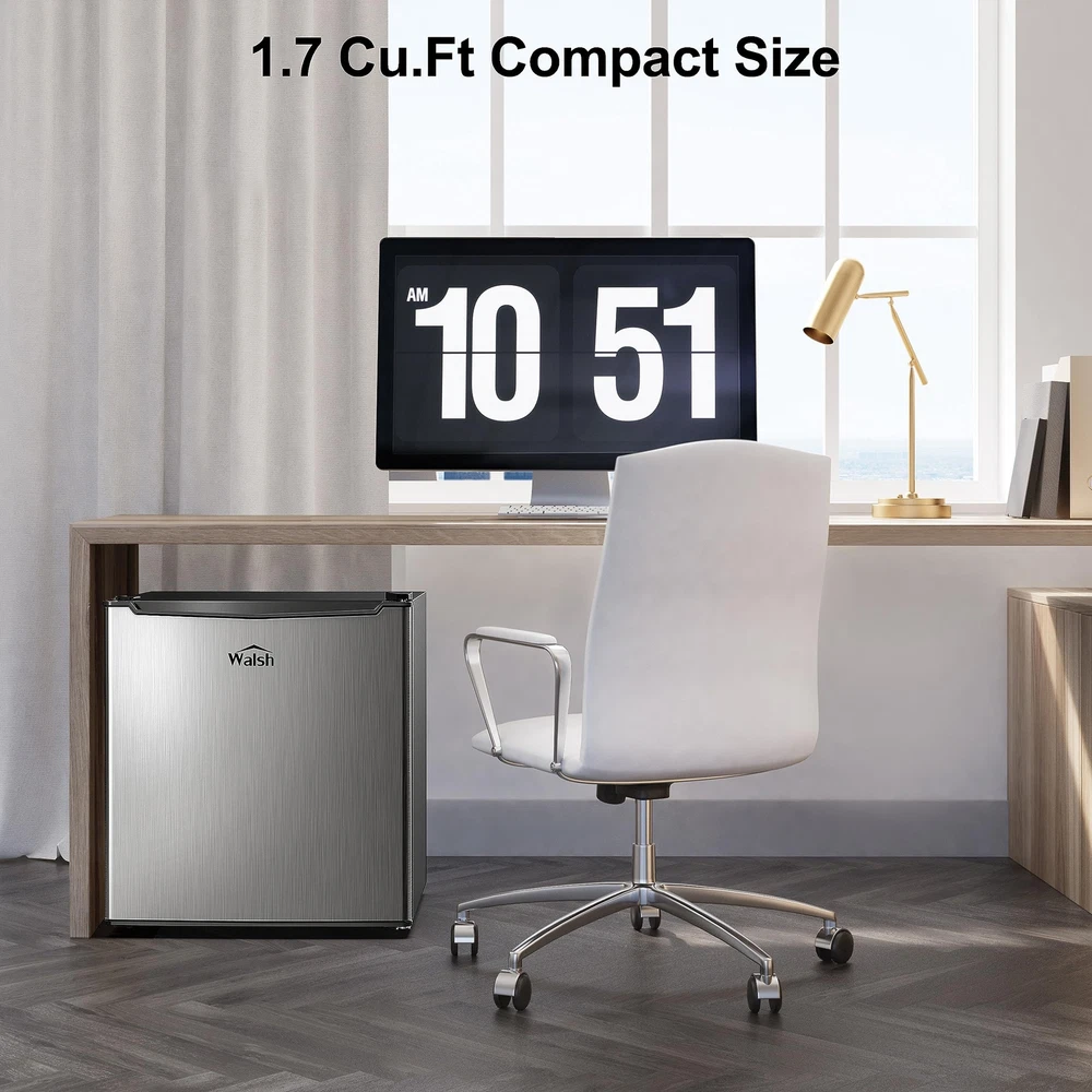 Walsh Compact Refrigerator, Single Door Mini Fridge, Energy Efficient, Adjustable Mechanical Thermostat with Chiller, Reversible Doors and Leveling Front Legs, 1.7 Cu Ft., Stainless Steel Compact & stylish This space saving refrigerator (17.48’’ * 19.09’’ * 19.49’’ (W * D *H)) stores food, soda, beer, and other beverages with minimal energy and without taking up too much space. The sleek, modern design refrigerator is perfect for college dorm rooms, offices, garages, home bars.Cooling method:Compressor.Amperage : 0.8 amps Adjustable mechanical thermostat control Walsh refrigerator can be controlled manually with the control dial from cool to cold to coldest, you can turn the knob to set the temperature you want. And the temperature range for refrigerator compartment is 32℉ to 47℉, chiller compartment is 27℉ to 37℉. Reversible doors & leveling front legs Reversible door that can open from left or right, reversible door that can be suitable for different kitchen layout. Leveling legs can adjust feet and keep level placement in anywhere. Energy-saving Compact refrigerator uses R600a high-efficiency and low-energy consumption compressor, it can cool food quickly with lower energy. Product Features Stainless Steel Adjustable Mechanical Thermostat Control 2 Liter Bottle Door Storage Half-Width Chiller Compartment Coated Wire Slide-Out Shelf Reversible Doors 2 Leveling Front Legs Specifications Color: Stainless Steel Capacity: 1.7 Cu.Ft. Voltage: 120Volts/ 60Hz Fresh food Capacity: 1.45 Cu. Ft. Chiller Capacity: 0.18 Cu. Ft. Shipping We offer FREE shipping on all orders! We use a selection of shipping services such as UPS, FedEx, USPS etc. We only ship to the lower 48 states, no APO/FPO addresses or PO Boxes allowed. Local pickups and combined shipping options are not provided at this time. Return You can return a product for up to 30 days from the date you purchased it. Any product you return must be in the same condition you received it and in the original packaging. Please keep the receipt. Payment We accept payment by any of the following methods: PayPal Please pay as soon as possible after winning an auction, as that will allow us to post your item to you sooner! Feedback Customer satisfaction is very important to us. If you have any problem with your order, please contact us and we will do our best to make you satisfied. Contact Us If you have any queries, please contact us via ebay. We usually respond within 24 hours on weekdays. Please visit our eBay store to check out other items for sale! Thank you for shopping at our store.