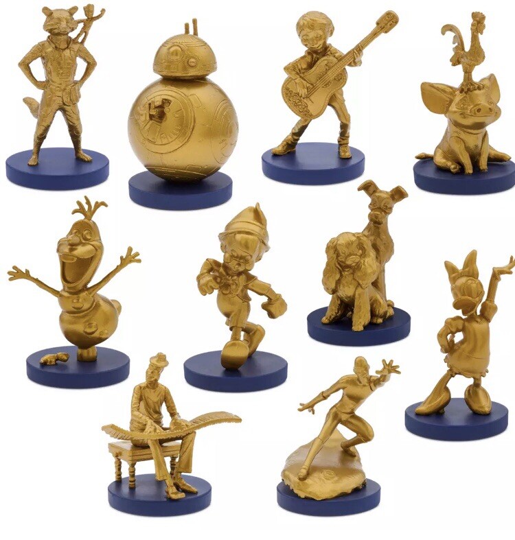 Walt Disney World 50th Anniversary Fab 50 All 10 Gold Figures for Series 3. Series 3 includes Daisy Duck, Pinocchio, Lady and the Tramp, Olaf, Pua with Hei Hei, Miguel, Frozone, Joe Gardner, BB-8, and Rocket with Groot