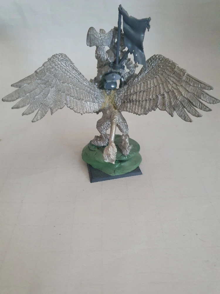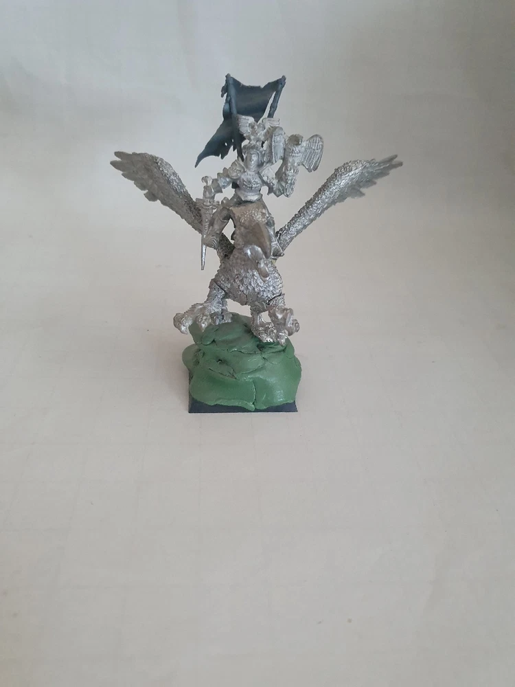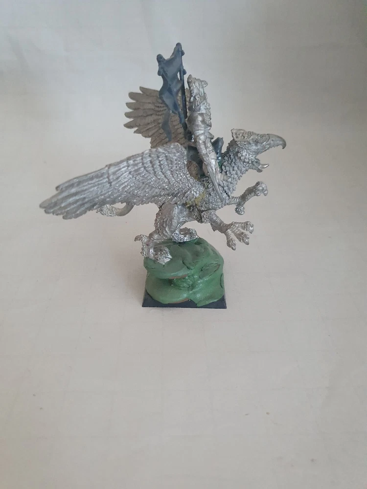 Warhammer Empire Elector Count Mounted on Griffin Metal oop. Model has been based and ready to be painted. A saddle has been added to make it easier to mount the elector count. Counts has not been glued on and has a back banner added.