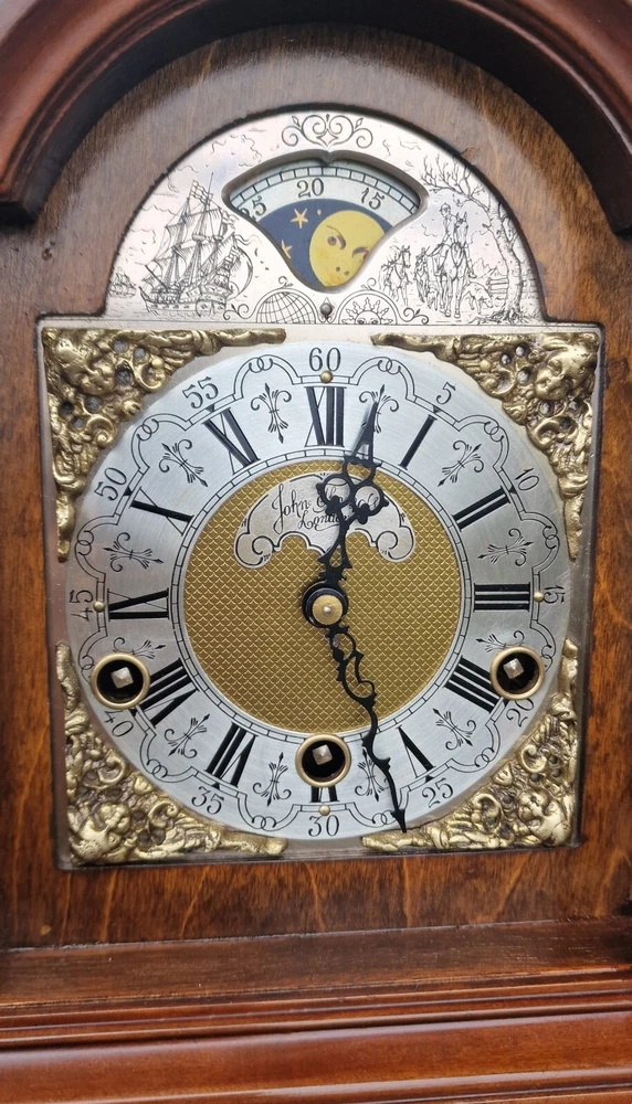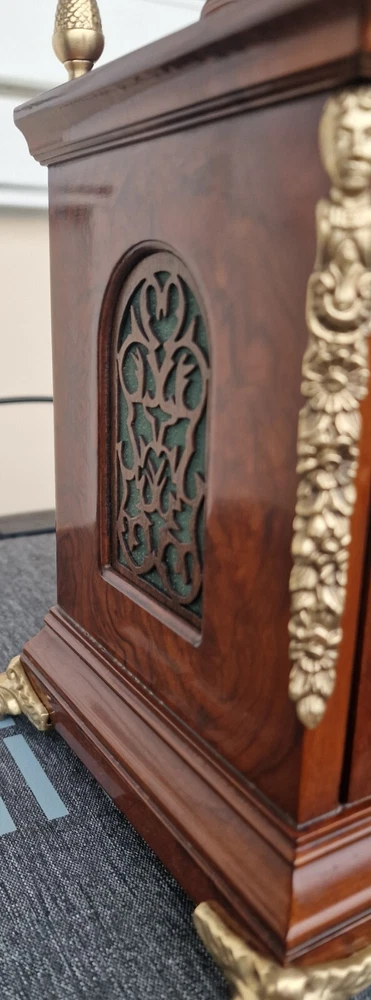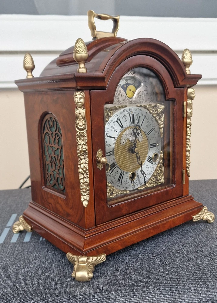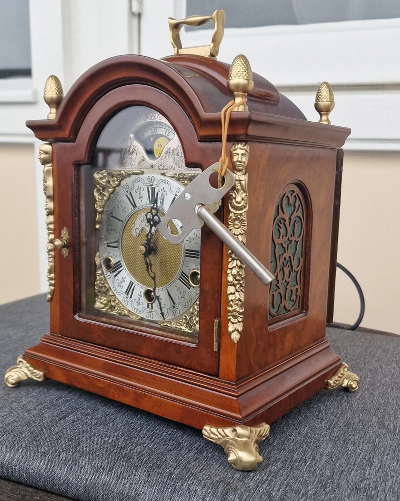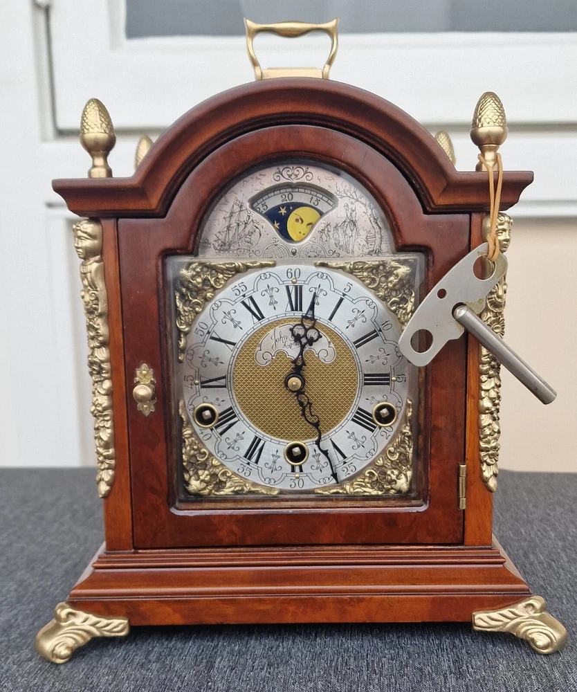Vintage Westminster Dutch Warmink Shelf Clock. This clock is fully working and in beautiful vintage condition. This clock chimes it's Westminster tune perfectly every quarter of the hour via 5 hammers hitting 5 rods. Beautiful dial with fully working rotating rolling moon phase, that turns over a 19.5 day period. John Thomas London named on the front dial. See it via the YouTube link below by copying and pasting the link below to your browser. https://youtu.be/PwM-ZZiQ_K8 Gloss finished wood case . Brass decoration to feet and handle and side columns. Fretwork side panels to each side that enhance the sound of the Chimes. The clock will run for 8 days on a full key wind. Original factory sticker inside the rear door. Complete with key. The Warmink factory in The Netherlands is none existing anymore. 28cm - high with handle raised. 23.5cm - across brass feet. 17.5cm - depth across the brass feet. This clock is a used second hand vintage item and in used condition. It is not a new product. Please view all pictures.. Postage : We post UPS to the USA. UK = 49.99 usd USA = 79.99 usd Canada = 89.99 usd Worldwide 99.99 usd Please be aware you may be charged VAT / Import tax on the final price of your item on arrival. These additional costs are not included in the final price or shipping. These charges may be collected by eBay, or the carriers, or when you collect from a pick up location. These charges are set by your own country. Many of the items that we sell are classed as Vintage or Antique and therefore are not brand new out of a box, and may have minor nicks, dings, scuffs, scratches, wear due to being used over the many years. All of our listings we try to be as complete as possible with the description of the products we sell and offer additional pictures and movie footage. The listing is completed as expected with any defects listed however this does not imply that the lot is in perfect (new in a box) condition or completely free from wear and tear from imperfections. If you require more details on this product or have any specific questions please email me before you bid and I will only be to happy to answer your questions within 24 hours. Antique clocks after transport no matter how well they have been looked after or serviced may require setting up, adjustments and setting into beat when you receive them and i always recommend a professional or an experienced clock person to do this correctly for you. Unfortunately with some clocks it is not a matter of unpacking them, putting the pendulum on and away they go, some clocks will need the extra adjustments and setting into beat so please remember this before bidding. Most clocks will be ok and will not need any additional adjustments but please bear in mind this may not be the case. Any clocks returned because of setting up issues or adjustments needed after transit then a fee will be applicable. For your piece of mind we test all our clocks here before they are sent out and any issues are either sorted or described in the add, the clock will not have any problems as they are tested vigorously before sending. We do not offer any guarantee on time keeping after the clock has been sent via the postal system. We are not clockmakers, we do not repair clocks. We do not service the clocks ourselves, we also have no service history, however if we obtain a clock that is not running then it is repaired and service by our local clock maker.. We ensure they are all running for a period of 7 days before they are listed. We do not guarantee the time keeping of your clock simply due to it being posted out and subjected to harsh treatment which may effect the running. Also all parts are non guaranteed as they are original and we cannot tell is any are worn for inside. We also have no history or any services in the past so we do advise a service and clean as you would a second-hand car. We will offer advice with regards to set up and adjustment if required by mail or we will call you. A service will ensure the smooth running of your clock for many years to come and is inexpensive.. Additional return policy details: A note about shipping. I take great care and attention to my packing and shipping. Photo's will be requested by the buyer on all damaged goods so that a claim can be made. Clocks and Barometers may require adjustment since the constant vibration and jarring of shipment often causes them to go out of beat, or a pin or lever may loosen during shipment and may need a service by a clockmaker should this be the case then a solution can be agreed on each party.