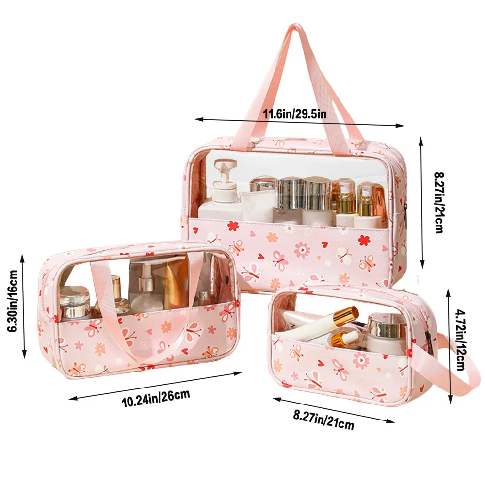 Features: Versatile Clear Cosmetic Bag: This 3-piece set includes a portable makeup bag, skincare wash bag, and large capacity beauty organizer, ideal for storing cosmetics, toiletries, and skincare essentials on the go. Water-Resistant Design: Made of durable pvc material, this makeup bag is water-proof and easy to clean, ensuring your beauty products stay dry and organized while traveling. Secure Zipper Closure: The travel cosmetic pouch features a sturdy zipper closure to keep your items secure and prevent spills or leaks, making it a practical and convenient choice for daily use. Thoughtful Gift Idea: This cosmetic bag set makes a perfect gift for girlfriends, or anyone who loves beauty and organization, offering a stylish and functional solution for small items storage management. Practical and Stylish: With its transparent design and spacious compartments, this clear cosmetics bag combines practicality with style, allowing you to easily find and access your while on the move. Specification: Material: PVC Size: 29.5*21cm, 12*21cm, 26*16cm Notes: Please allow slight tolerances in size due to manual measurement, and lighting in photography may result in a difference in color than in real. Package includes: 3*Cosmetic Bags