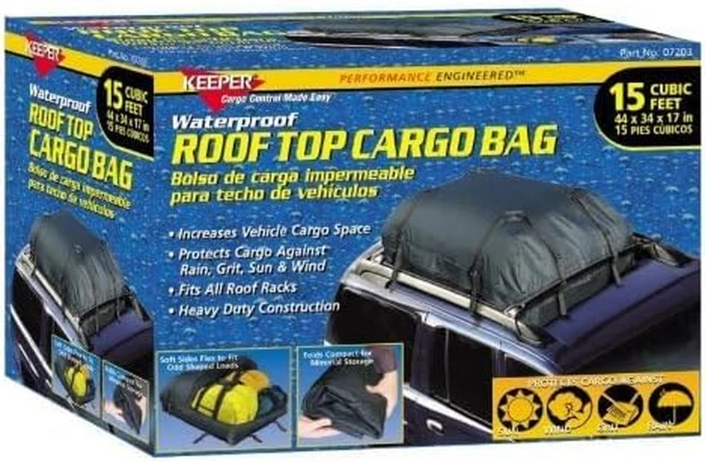 Store New Arrivals Add to Favorite View Feedback Contact - Waterproof Rooftop Cargo Bag, 15 Cubic Feet Description Item model number 7203 Item Weight 5 Pounds Mounting Type Roof Mount Item Volume 15 Cubic Feet Shell Type Soft Product Dimensions 44"L x 34"W x 17"H Material Rubber Water Resistance Level Waterproof Manufacturer Part Number 7203 Product Packaging Standard Packaging Global Trade Identification Number 00051643072039 Color Black Model 7203 Is Discontinued By Manufacturer No Protect Your Cargo: Keeper Roof Top Cargo Bag features 15 cubic ft. to protect and secure cargo loads from road grit, sun, wind and rain. Measurements: This cargo bag measures approximately 44 in. x 34 in. x 17 in. with rubber-laminated nylon material. Features: Soft sides flex to fit odd-shaped loads and folds into a compact size for easy storage. Ideal Use: Fits most roof racks on standard vehicles and smaller SUVs with attachment capabilities on all four sides. Disclaimer: Please use extreme caution when not utilizing all four side attachments. The Keeper® Roof Top Cargo Bag features 15 cubic ft. to protect and secure cargo loads from road grit, sun, wind and rain. The cargo bag measures approximately 44 in. x 34 in. x 17 ft. with rubber laminated nylon. It fits most roof racks with attachment capabilities on all four sides. Must use extreme caution when not utilizing all four side attachments. Cargo bag measures 44"x 34"x17" Increase vehicle cargo space on standard vehicles and smaller SUVs Soft sides flex to fit odd-shaped loads Folds compact for easy storage ABOUT US We offer the best prices around on high quality products. Our E-store includes media such as books, movies, music and games while offering electronics, toys, sporting apparel, clothing, tools, general home, garden items and more. SHIPPING We are always working hard to ensure your package arrives as soon as possible. Please understand that some factors like weather, high postal traffic, and the performance of shipping companies are outside of our control. We offer free shipping to the lower 48 states and ship within 2 business days of payment, usually sooner. We do not accept P.O. Boxes. Please provide a physical address. For shipping outside of the continental USA, we only use eBay's Global Shipping Program.The item is shipped to KY and then sent to the rest of the world. International customers are responsible for all duties and taxes. Continue to check out in order to calculate costs for shipping the item to your country. Messages regarding eBay's Global Shipping Program MUST be directed at eBay EXCLUSIVELY. RETURNS We offer a 30-Day Return Policy on items which you are not completely satisfied with. You have the option for a full-refund or an exchange of the item. No returns are available on items shipped outside of the USA. PAYMENT We accept PayPal. CONTACT US This page content is yet to come Please ad us to your favorite seller and visit again later Thank You CUSTOMER SATISFACTION We try our very best to make sure every customer is completely satisfied. If there's a problem, message us! We're happy to help. WE ACCEPT Copyright © 2021 AutoDS. | All Rights Reserved