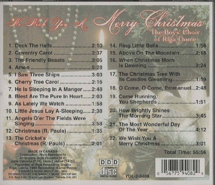 WE WISH YOU A MERRY CHRISTMAS, BOYS CHOIR RIGA DOME, ( CD - 1994 ) CHR-434, EX, COMBINED SHIPPING SPECIAL, SHIPPING $4.65 MEDIA MAIL, EXTRA CD’s ORDERED TOGETHER, $0.50 EACH SHIPPING, JUST PLACE ITEMS IN YOUR SHOPPING CART, THEN REQUEST INVOICE. WE WILL DO THE REST.