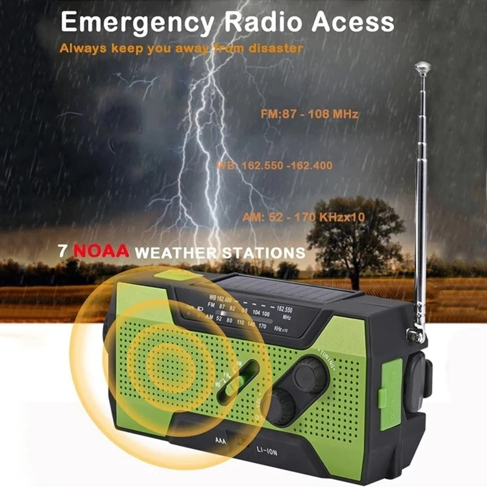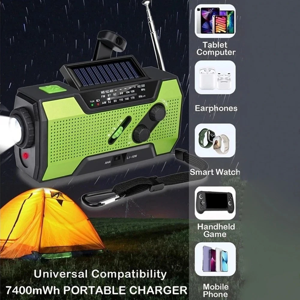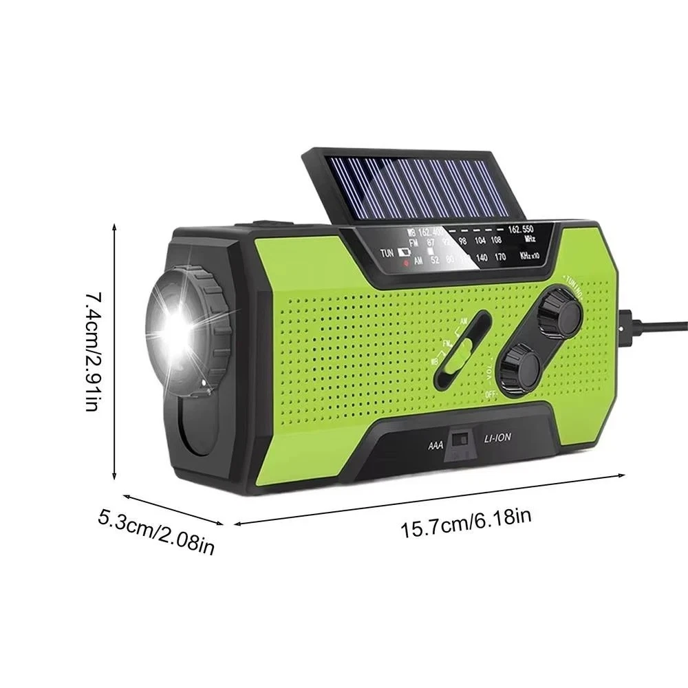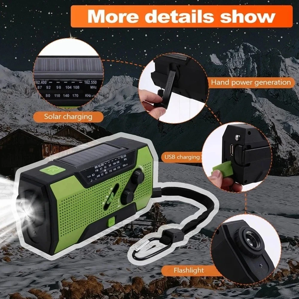 Product Description Wenn Sie Fragen haben, wenden Sie sich bitte zuerst an den Kundenservice, eröffnen Sie Streitigkeiten nicht einfach, danke! Features: 1. Supports AM/FM/WB signal reception, allowing users to freely choose channels to listen to news, entertainment, or weather information. 2. Expandable antenna for better signal. 3. Super decibel SOS alarm, a great helper in emergency situations. 4. Three charging methods: solar charging, hand cranked power generation, and USB charging. 5. Super strong lighting and reading light, emergency lighting, reading desk lamp, SOS alarm. 6. Emergency mobile phone charging: Equipped with a built-in 2000mAh lithium battery and a large capacity power bank, you don't have to worry about going out. 7. Very suitable for outdoor activities such as camping, fishing, traveling, hiking, and emergency situations. Specifications: Play mode: AM/FM/WB Built in battery: 2000mAh/3.6V Working voltage: 2.7V~4.2V Extra power: 7.5W Waterproof rating: IPX3 Strong light flashlight: LED strong light LED lifespan: 100000 hours Temperature range: -10 ℃ -+60 ℃ Frequency range: AM: 520~1710 KHZ FM: 87~108 MHZ WB: 162.550~162.400MHZ Product size: 15.7 * 7.4 * 5.3cm Product color: Orange/Green Product Material: ABS+PC Packaging Includes: 1 * Radio 1 * User Manual 1 * Micro USB cable Note: 1. Due to manual measurement, please allow for a slight difference of 1cm! 2. Due to differences in monitor settings and lighting conditions, the actual color of the product may differ slightly from the image. Thank you for your understanding! About Us Wir akzeptieren alle von eBay autorisierten Zahlungen. powered by