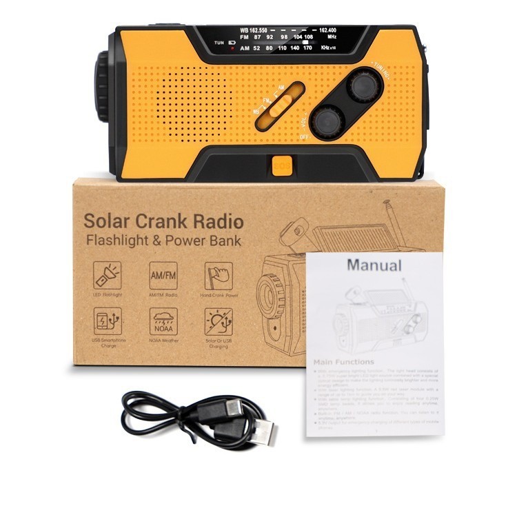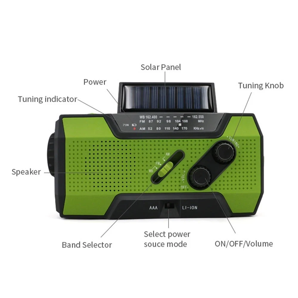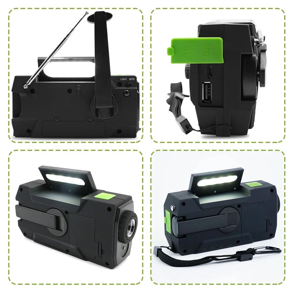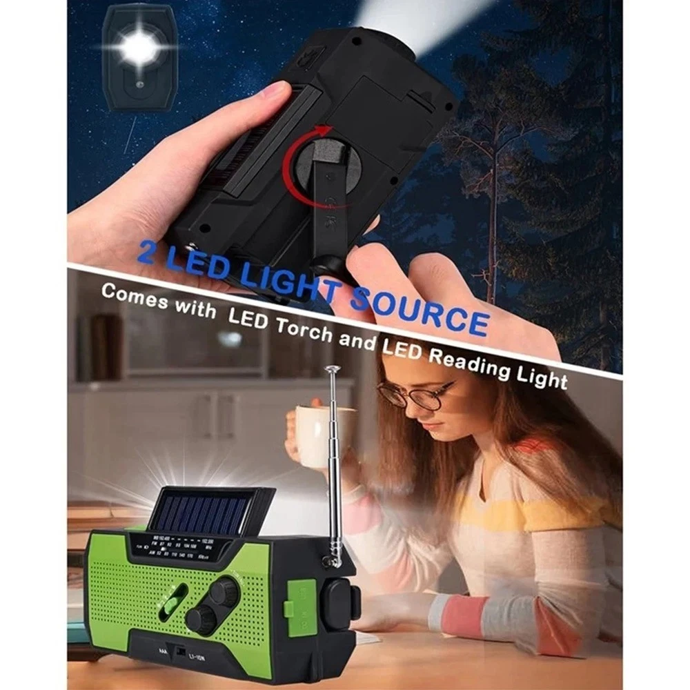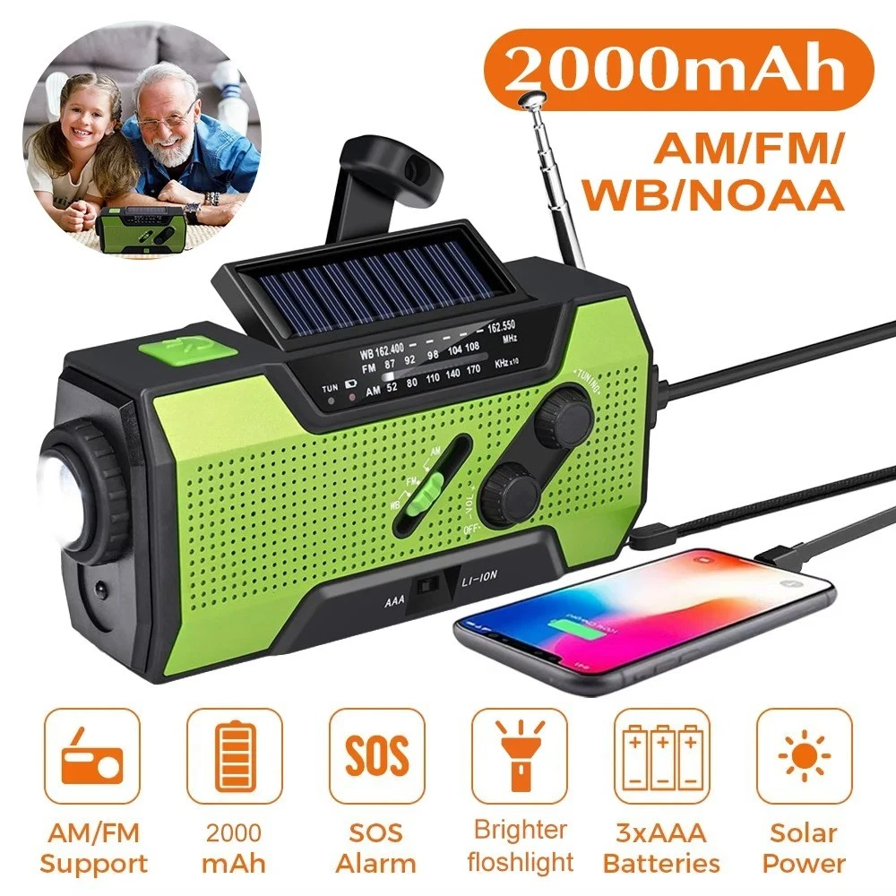 Product Description Wenn Sie Fragen haben, wenden Sie sich bitte zuerst an den Kundenservice, eröffnen Sie Streitigkeiten nicht einfach, danke! Features: 1. Supports AM/FM/WB signal reception, allowing users to freely choose channels to listen to news, entertainment, or weather information. 2. Expandable antenna for better signal. 3. Super decibel SOS alarm, a great helper in emergency situations. 4. Three charging methods: solar charging, hand cranked power generation, and USB charging. 5. Super strong lighting and reading light, emergency lighting, reading desk lamp, SOS alarm. 6. Emergency mobile phone charging: Equipped with a built-in 2000mAh lithium battery and a large capacity power bank, you don't have to worry about going out. 7. Very suitable for outdoor activities such as camping, fishing, traveling, hiking, and emergency situations. Specifications: Play mode: AM/FM/WB Built in battery: 2000mAh/3.6V Working voltage: 2.7V~4.2V Extra power: 7.5W Waterproof rating: IPX3 Strong light flashlight: LED strong light LED lifespan: 100000 hours Temperature range: -10 ℃ -+60 ℃ Frequency range: AM: 520~1710 KHZ FM: 87~108 MHZ WB: 162.550~162.400MHZ Product size: 15.7 * 7.4 * 5.3cm Product color: Orange/Green Product Material: ABS+PC Packaging Includes: 1 * Radio 1 * User Manual 1 * Micro USB cable Note: 1. Due to manual measurement, please allow for a slight difference of 1cm! 2. Due to differences in monitor settings and lighting conditions, the actual color of the product may differ slightly from the image. Thank you for your understanding! About Us Wir akzeptieren alle von eBay autorisierten Zahlungen. powered by