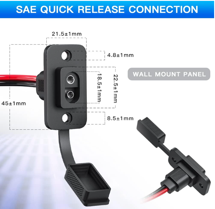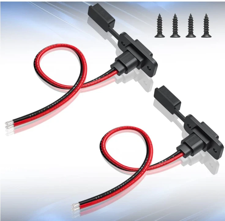 ELECTOP SAE Connector, Rectangular SAE Power Socket Sidewall Port, Weatherproof SAE Quick Connect Solar Panel Flush Mount Plug Outlet, 12AWG SAE Cable for Solar Generator Battery Charger (2 Pack) Brand ELECTOP Material Copper Mounting Type Panel Mount About this item ★ Package Included - 2 SAE connector extension cables with 4 mounting screws. The sae cable is made of heavy duty 12AWG copper wire, very thick and durable. Double PVC jacket, best insulation effect, 105 °C heat resistance. Cable Length:33.5 cm/13.2 inch(including sae socket). ★ Standard SAE Quick Release Connection - Fit for most of SAE port, quick connect/disconnect. Suitable for create a weatherproof bulkhead/panel mount SAE power point. Before final connection, please make sure that the polarity is correct. ★ Wide Application - Quickly connect or disconnect battery packs on different vehicles. Wide rang of application in solar panel, motorcycle, lawn motors, tractor battery, boat marine trolling motor bike, RVs, DIY etc. ★ Dustproof and Waterproof Cap - The SAE power socket sidewall port with protective cap protects against raindrops and dust, keeping the inside of the sae connector clean and dry when not in use. ★ Premium Quality SAE Connector Cable - If you have any questions about this sae plug socket cable set, please feel free to contact us. Our costumer service team always be there for you. . We offer FREE shipping on all orders! . We ship within Five business days of payment, usually sooner. . We use a selection of shipping services such as UPS, FedEx, USPS etc. . We only ship to the lower 48 states, no APO/FPO addresses or PO Boxes allowed. . Local pickups and combined shipping options are not provided at this time. . Your satisfaction is a wonderful reward for our efforts. Please assist us by leaving a positive review if you feel pleased with our service. . In the event that you encounter any difficulties related to your order, please do not hesitate to reach out to us directly through the Messaging system on the Ebay platform. Kindly consider opening a COMPLAINT or a RETURN REQUEST as a last resort, only after all other possible measures have been attempted and we have been unable to provide you with assistance. . We will get in touch with you within 24 hours and make every effort to ensure your satisfaction. . Please rest assured of our service quality.